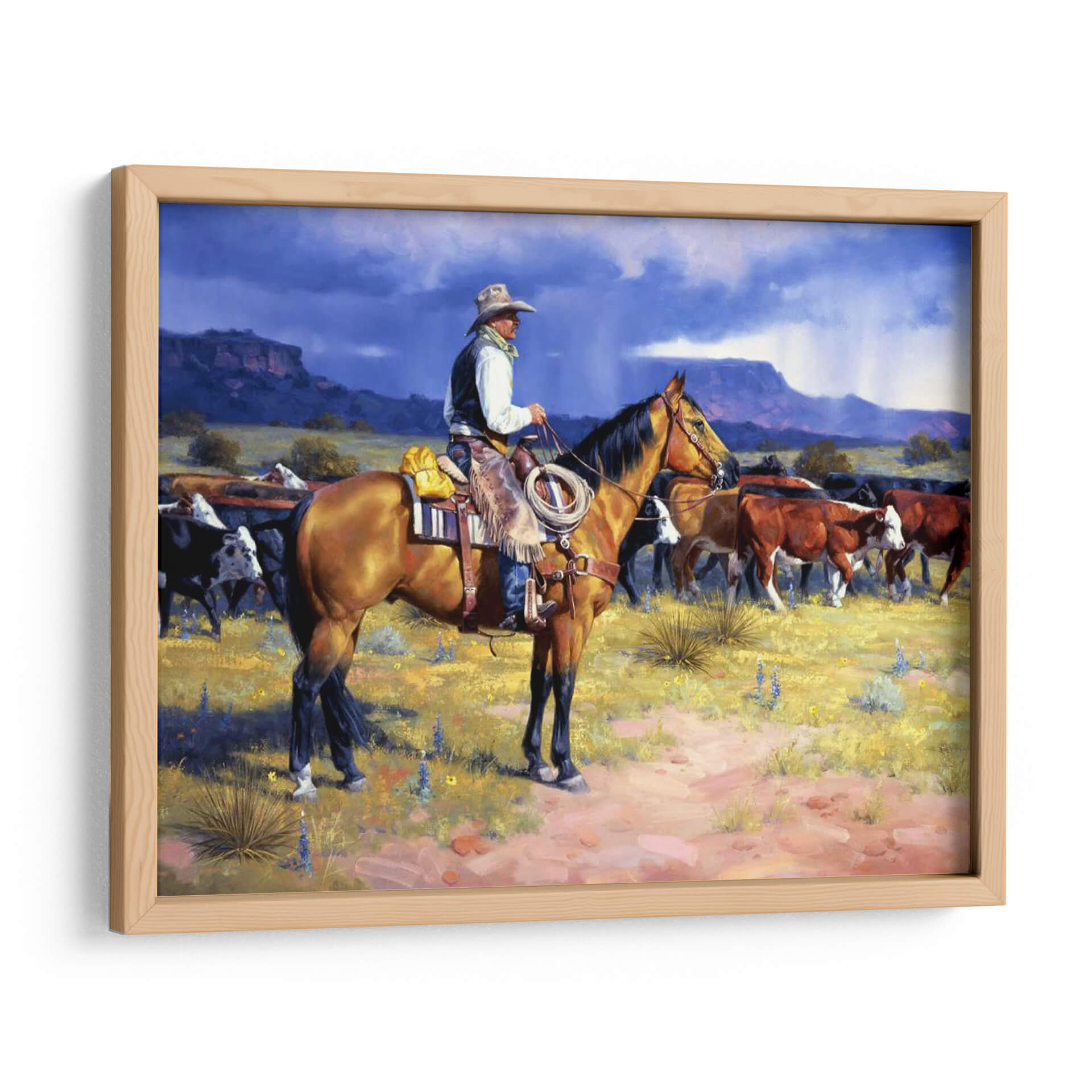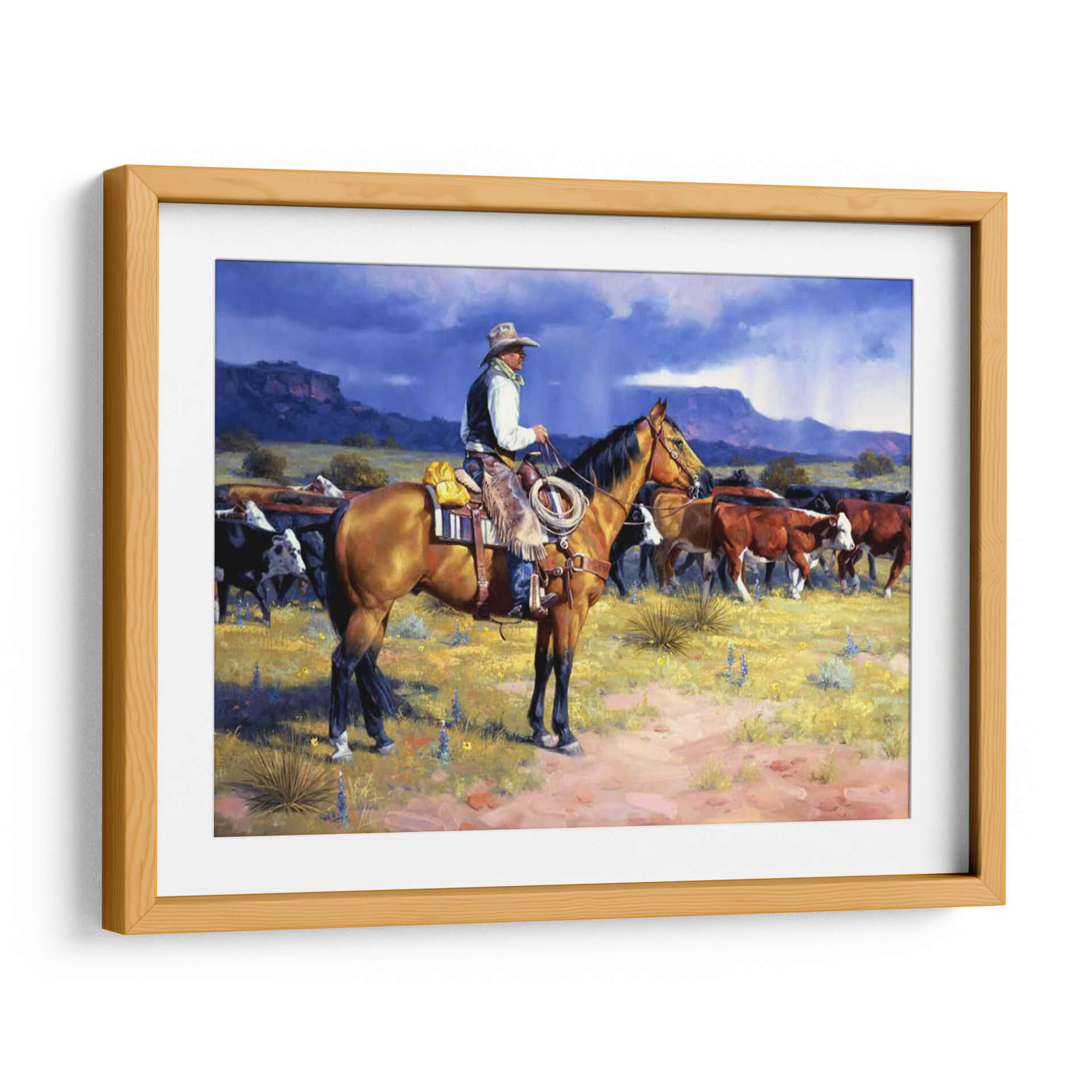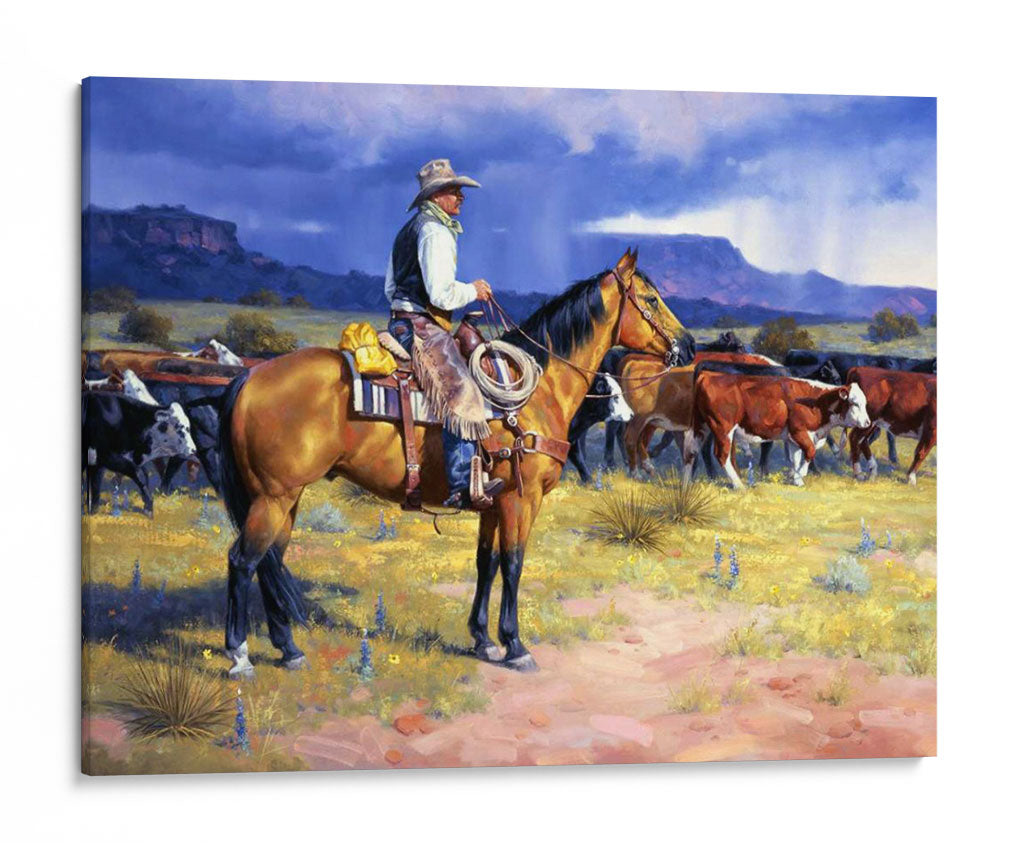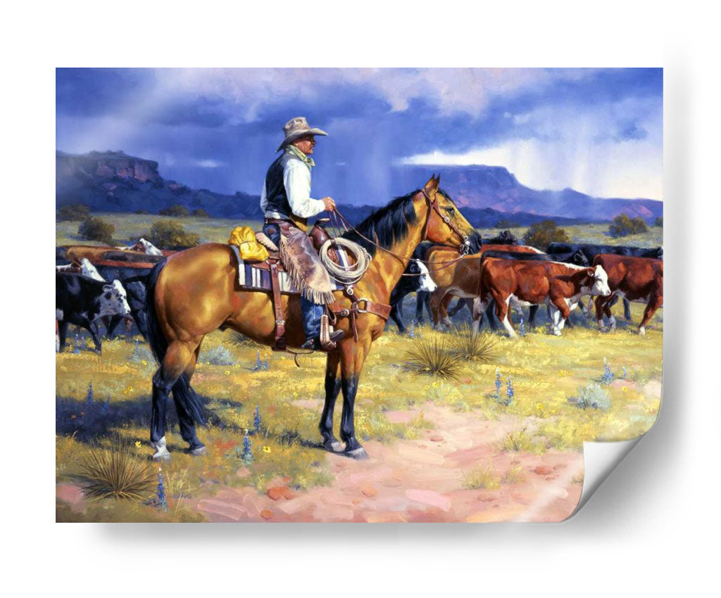 Captura la esencia del espíritu del Oeste americano con "Gran Vaquero Americano", una obra de arte evocadora y detallada del artista Jack Sorenson. Esta pieza transporta al espectador a un paisaje rústico y salvaje, dominado por la figura imponente de un vaquero a caballo, guiando su ganado bajo un cielo dramático y tormentoso. La paleta de colores, rica en tonos tierra y ocres, se combina con azules profundos y grises en el cielo, creando una atmósfera de autenticidad y fuerza. Los detalles en la vestimenta del vaquero, el pelaje del caballo y la textura del terreno invitan a una contemplación profunda, resaltando la habilidad artística de Sorenson para capturar la dureza y la belleza de la vida rural. Este cuadro decorativo es ideal para añadir un toque de carácter y tradición a cualquier espacio, ya sea una sala de estar, un estudio o una oficina, inspirando conversaciones sobre la libertad, la perseverancia y el legado del Viejo Oeste.