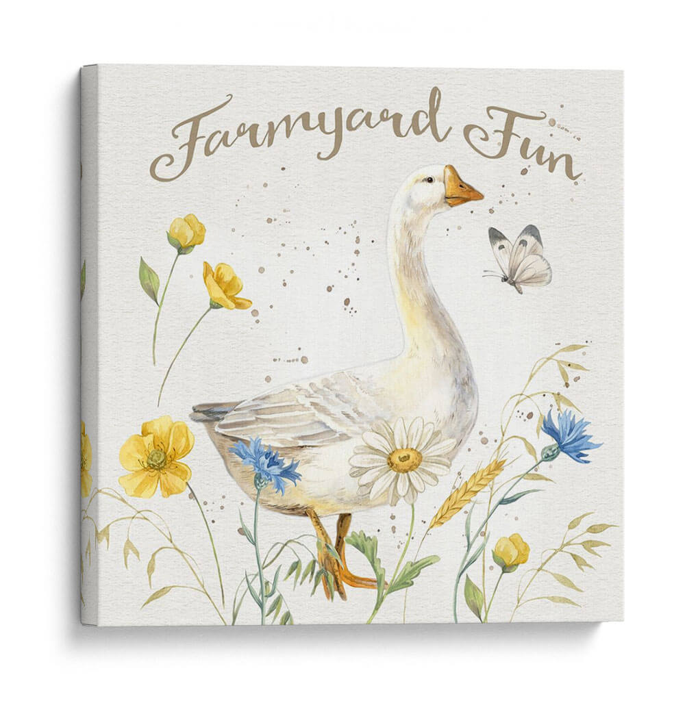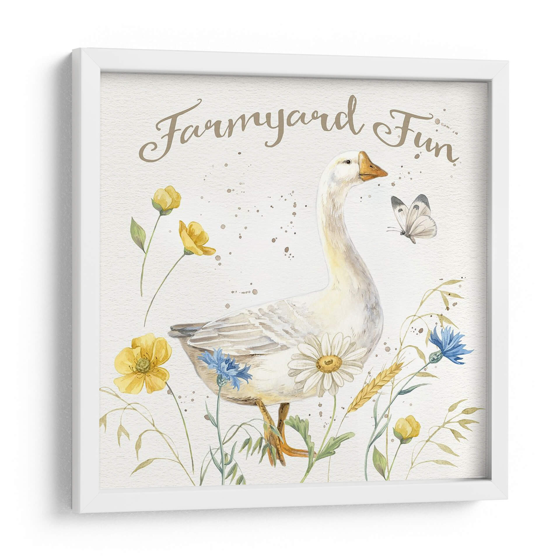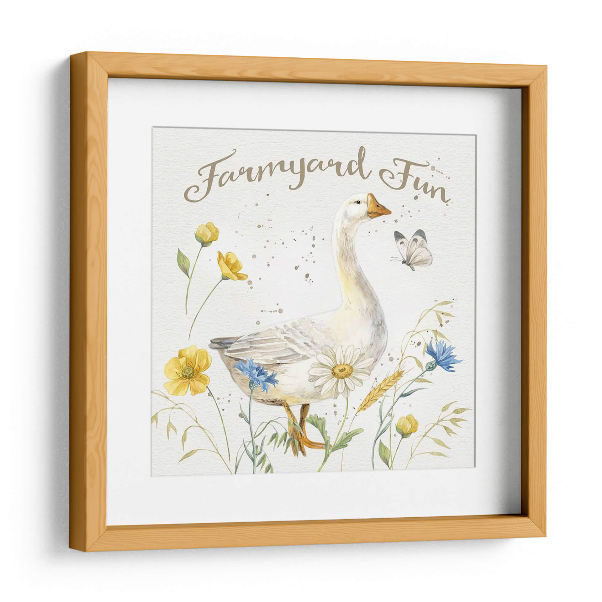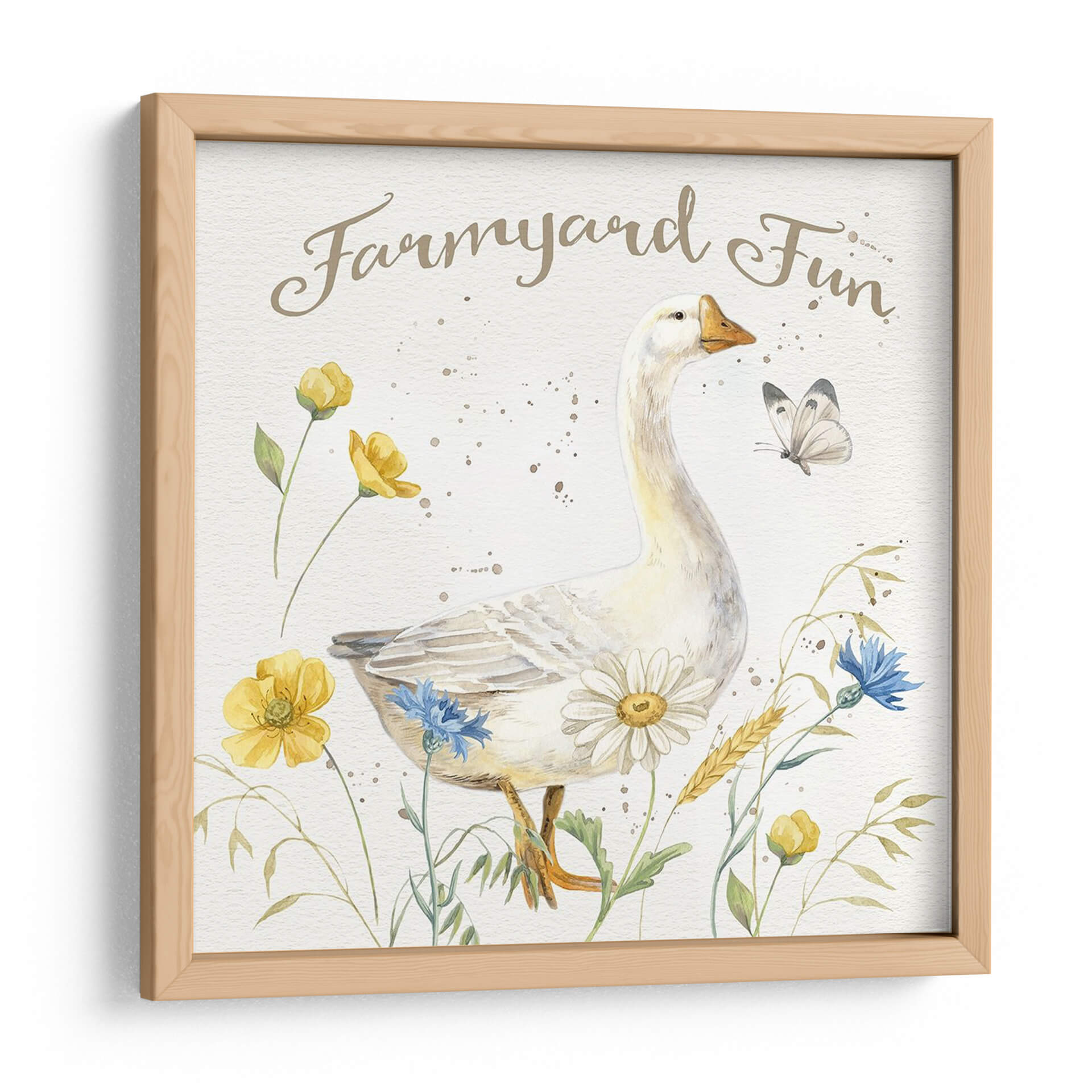 Sumérgete en la encantadora escena de 'Granja Nostálgica Vi', una obra de arte que captura la inocencia y la belleza de la vida rural con un toque de fantasía. Este cuadro decorativo presenta un majestuoso ganso blanco como protagonista, rodeado de un vibrante campo de flores silvestres amarillas y azules, junto a delicadas espigas de trigo. Una mariposa revolotea sutilmente, añadiendo un aire de movimiento y serenidad al conjunto. La paleta de colores suaves, dominada por tonos tierra, blancos cremosos y toques de amarillo y azul, crea una atmósfera de paz y calidez. El estilo delicado y el trazo suave evocan la técnica de acuarela, aportando una sensación de ligereza y frescura. Ideal para quienes buscan infundir a sus espacios una sensación de tranquilidad campestre y alegría sencilla, este cuadro es perfecto para decorar salones, dormitorios o incluso una guardería. 'Granja Nostálgica Vi' es más que una simple imagen; es una invitación a un momento de paz y conexión con la naturaleza, un recordatorio de la belleza que se encuentra en lo simple y lo cotidiano, transformando cualquier rincón en un refugio de encanto rústico y optimismo.