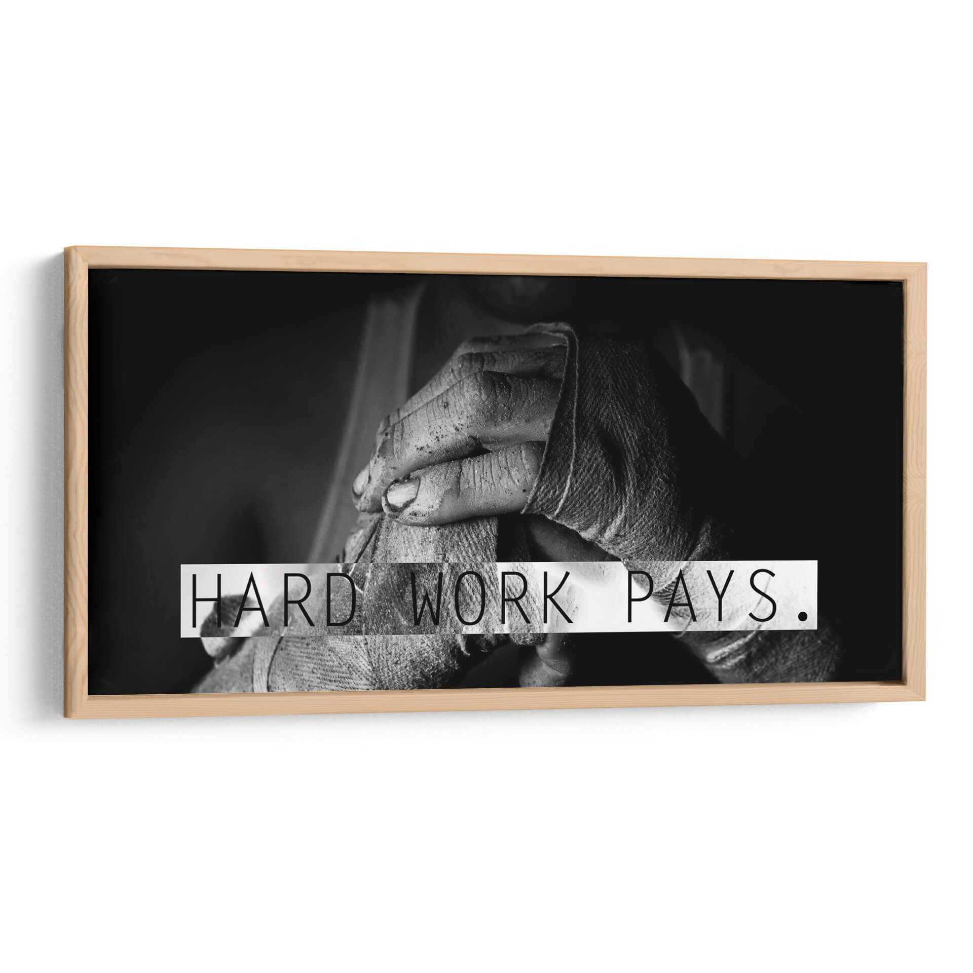 Transforma tu espacio con este poderoso cuadro decorativo "Hard Work Pays", una obra inspiradora que captura la esencia de la dedicación y el esfuerzo. La imagen, presentada en un sobrio y elegante monocromo, se centra en un primer plano de manos vendadas, un símbolo universal de lucha y perseverancia. Las texturas rugosas de las vendas y la piel transmiten una sensación de realismo crudo, mientras que el contraste entre luces y sombras añade dramatismo y profundidad a la composición. El mensaje "Hard Work Pays" (El trabajo duro da sus frutos), superpuesto en una banda blanca nítida, refuerza el carácter motivacional de la pieza, haciéndola un recordatorio constante del valor de la constancia. Este cuadro decorativo es ideal para oficinas, gimnasios, estudios o cualquier rincón donde se celebre la ambición y el éxito obtenido con esfuerzo. Su estética minimalista y de alto impacto visual lo convierte en una adición versátil para cualquier decoración moderna, aportando carácter y una dosis de inspiración diaria.