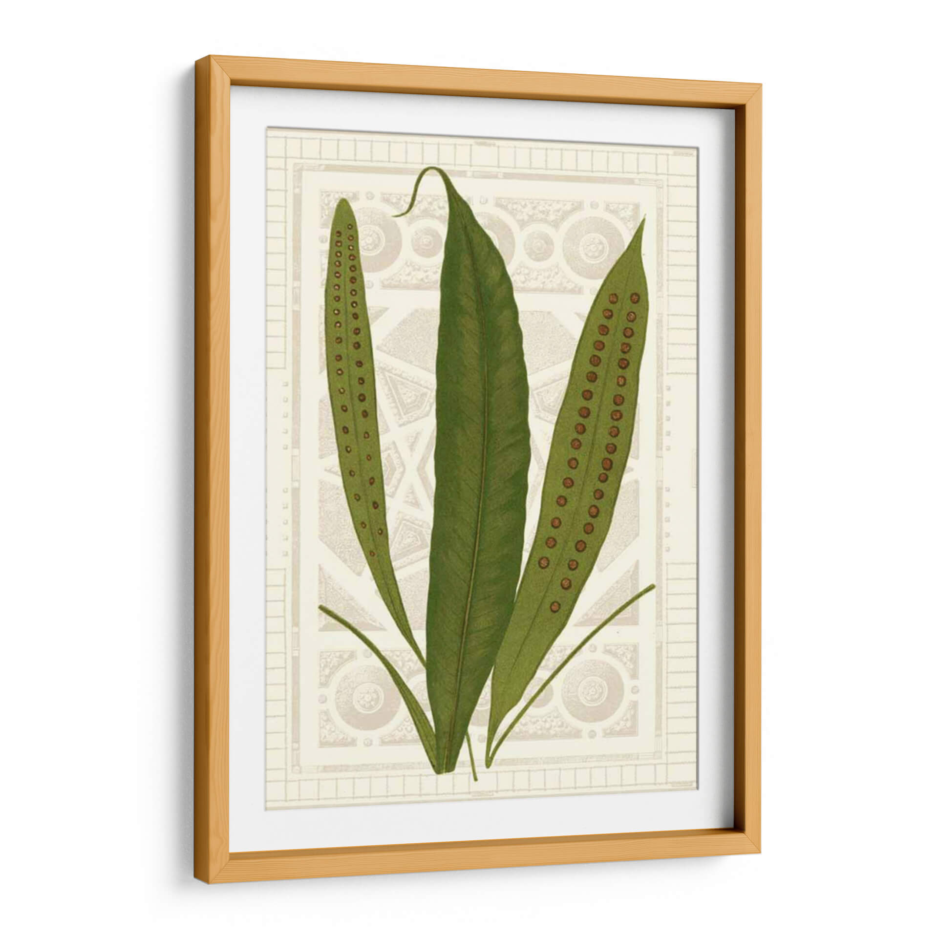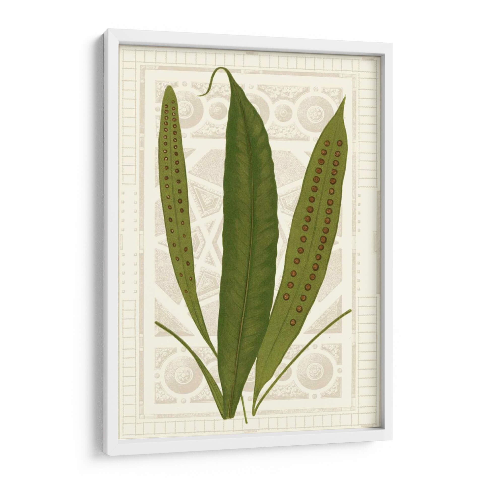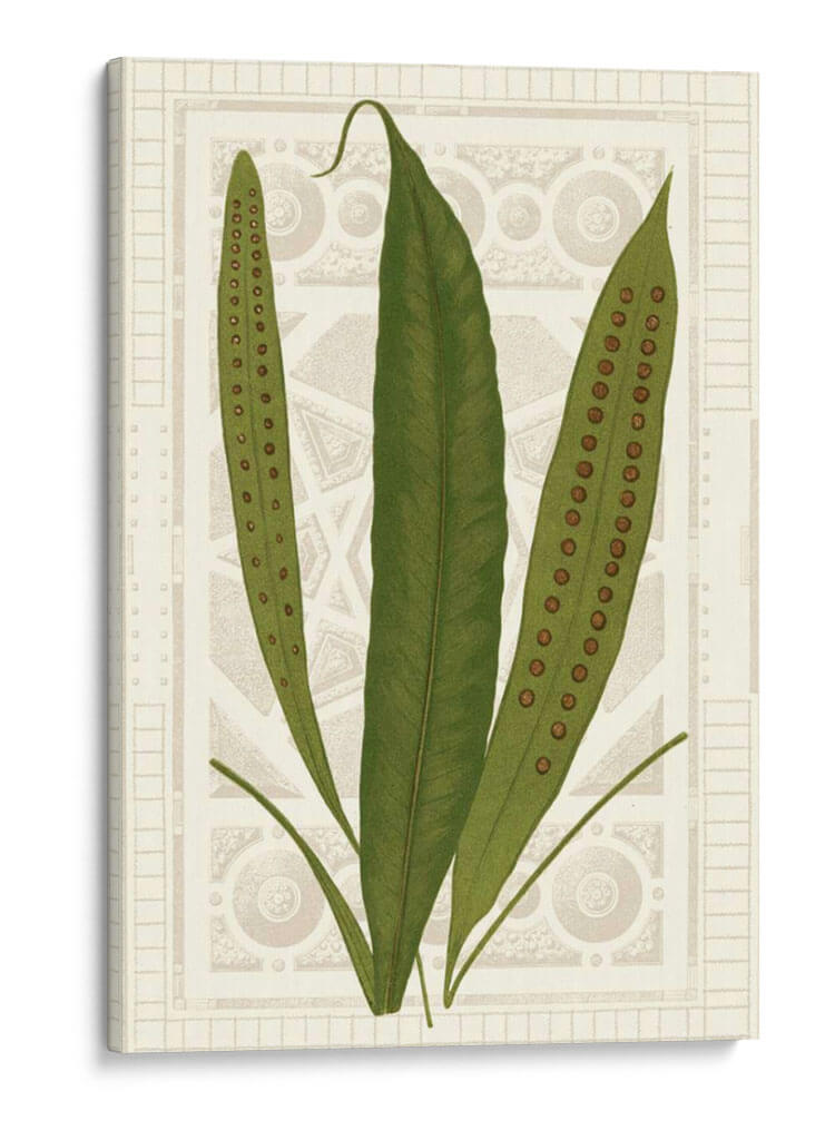 Sumérgete en la serenidad botánica con "Helechos De Jardín Vi", una obra de arte que captura la delicada belleza de la naturaleza. Este cuadro decorativo presenta tres frondosos helechos en tonos verdes vibrantes, con sus características esporas marrones discretamente alineadas en las hojas, invitando a la contemplación y al asombro. El fondo, de un tono sepia suave, está adornado con un intrincado patrón geométrico y ornamental que evoca la elegancia clásica y el diseño de herbario vintage. La composición, centrada y equilibrada, atrae la mirada hacia la sutil textura y el detalle de las plantas, creando una atmósfera de calma y sofisticación. Ideal para espacios que buscan un toque de la naturaleza con un aire de refinamiento, este cuadro es perfecto para añadir un elemento de tranquilidad y estilo a tu sala de estar, dormitorio, o estudio. Su estilo, que combina elementos botánicos detallados con un diseño de fondo inspirado en patrones arquitectónicos, lo convierte en una pieza versátil, capaz de complementar tanto decoraciones modernas como clásicas. "Helechos De Jardín Vi" es más que una simple imagen; es una ventana a la serenidad, una pieza de arte que infunde paz y elegancia en cualquier ambiente, invitando a la reflexión sobre la intrincada maravilla del mundo natural.