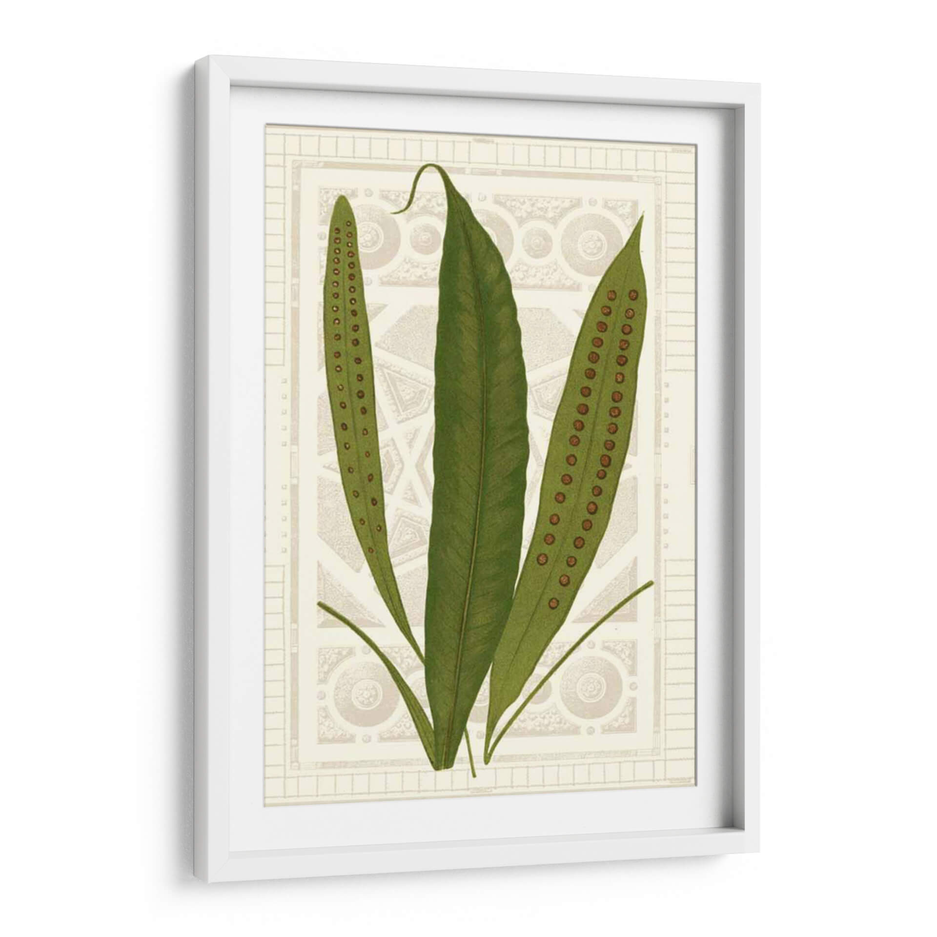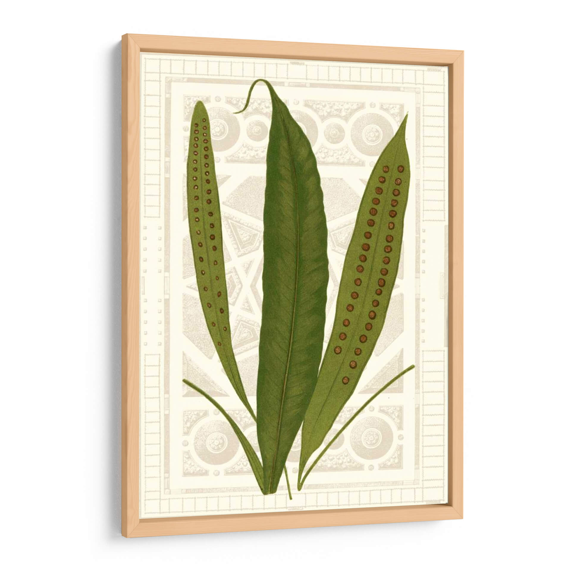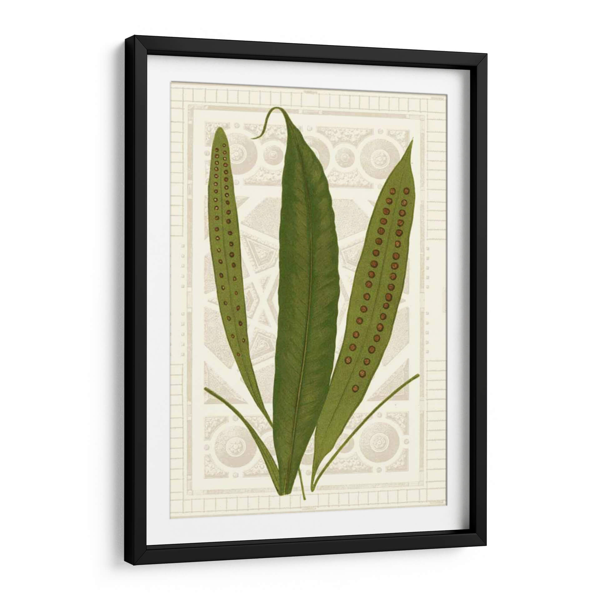 Sumérgete en la serenidad botánica con "Helechos De Jardín Vi", una obra de arte que captura la delicada belleza de la naturaleza. Este cuadro decorativo presenta tres frondosos helechos en tonos verdes vibrantes, con sus características esporas marrones discretamente alineadas en las hojas, invitando a la contemplación y al asombro. El fondo, de un tono sepia suave, está adornado con un intrincado patrón geométrico y ornamental que evoca la elegancia clásica y el diseño de herbario vintage. La composición, centrada y equilibrada, atrae la mirada hacia la sutil textura y el detalle de las plantas, creando una atmósfera de calma y sofisticación. Ideal para espacios que buscan un toque de la naturaleza con un aire de refinamiento, este cuadro es perfecto para añadir un elemento de tranquilidad y estilo a tu sala de estar, dormitorio, o estudio. Su estilo, que combina elementos botánicos detallados con un diseño de fondo inspirado en patrones arquitectónicos, lo convierte en una pieza versátil, capaz de complementar tanto decoraciones modernas como clásicas. "Helechos De Jardín Vi" es más que una simple imagen; es una ventana a la serenidad, una pieza de arte que infunde paz y elegancia en cualquier ambiente, invitando a la reflexión sobre la intrincada maravilla del mundo natural.