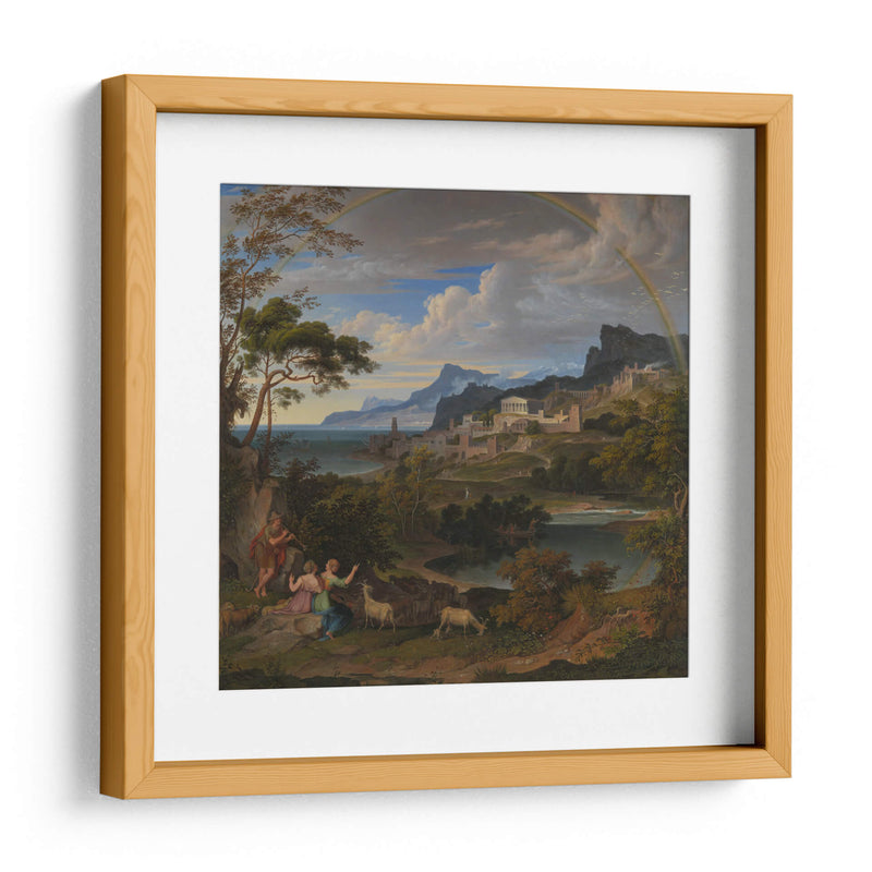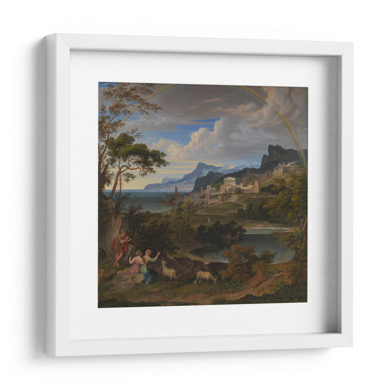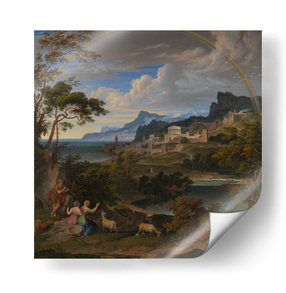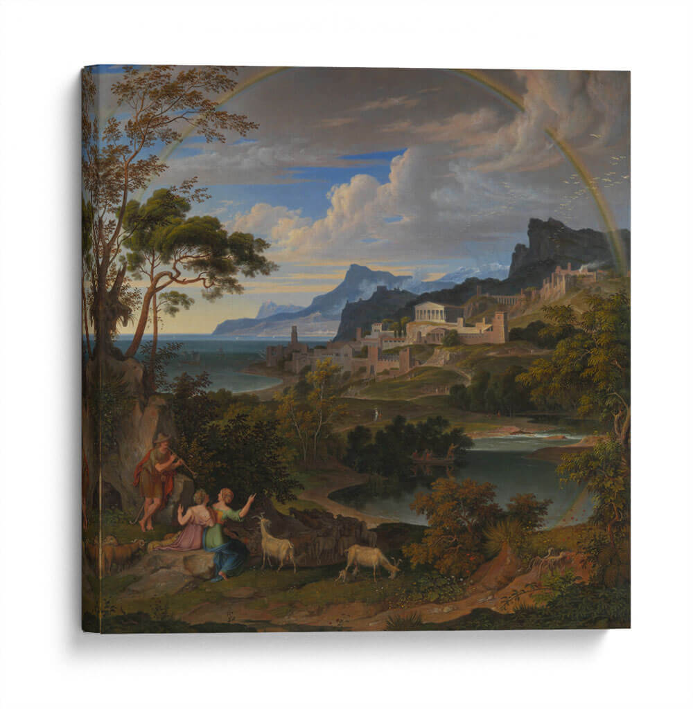 Sumérgete en la majestuosidad de "Paisaje Heroico con Arcoíris", una obra que captura la esencia de la epopeya y la naturaleza en perfecta armonía. Este cuadro decorativo, inspirado en el estilo neoclásico y romántico, te transporta a un escenario idílico donde figuras mitológicas interactúan con un paisaje exuberante y una ciudad antigua enclavada en las colinas. La paleta de colores, dominada por verdes profundos, azules serenos y el toque vibrante del arcoíris, crea una atmósfera de calma y asombro. La detallada composición, con sus árboles frondosos en primer plano y la majestuosa arquitectura al fondo, invita a la contemplación y a la admiración de la belleza clásica. Ideal para quienes buscan infundir a sus hogares u oficinas un aire de grandeza, serenidad y aventura. Este lienzo es perfecto para añadir un punto focal de inspiración a tu sala de estar, estudio o comedor, evocando historias de héroes y paraísos perdidos. Transforma tu espacio con esta pieza que celebra la interconexión entre la humanidad, la naturaleza y lo divino.