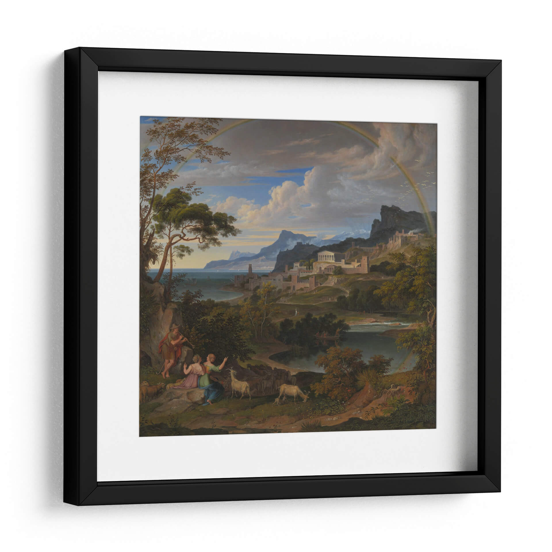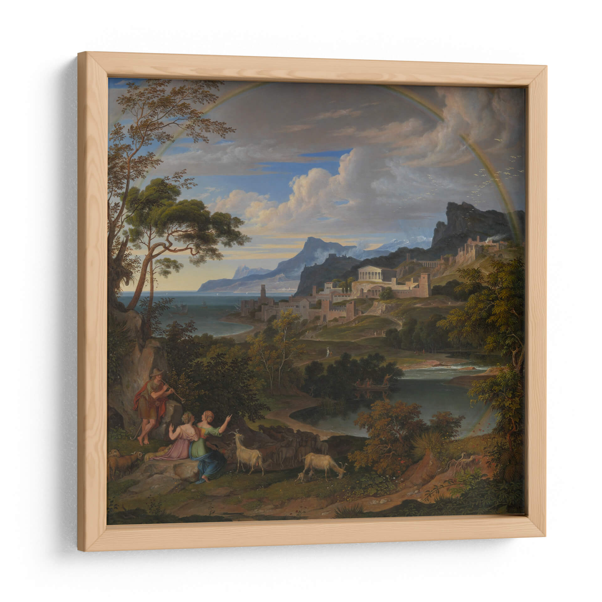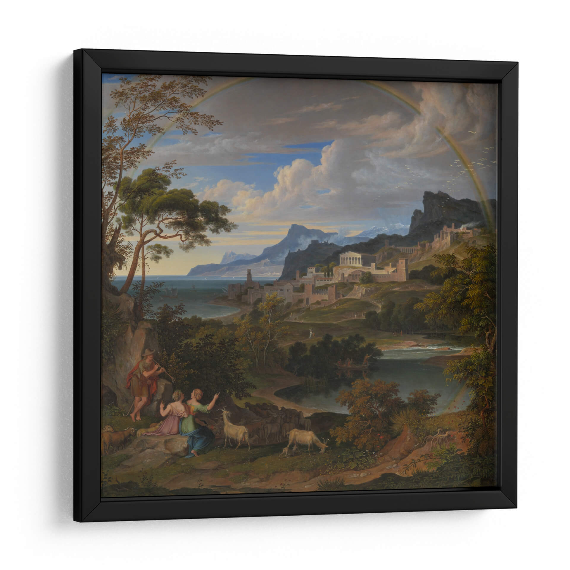 Sumérgete en la majestuosidad de "Paisaje Heroico con Arcoíris", una obra que captura la esencia de la epopeya y la naturaleza en perfecta armonía. Este cuadro decorativo, inspirado en el estilo neoclásico y romántico, te transporta a un escenario idílico donde figuras mitológicas interactúan con un paisaje exuberante y una ciudad antigua enclavada en las colinas. La paleta de colores, dominada por verdes profundos, azules serenos y el toque vibrante del arcoíris, crea una atmósfera de calma y asombro. La detallada composición, con sus árboles frondosos en primer plano y la majestuosa arquitectura al fondo, invita a la contemplación y a la admiración de la belleza clásica. Ideal para quienes buscan infundir a sus hogares u oficinas un aire de grandeza, serenidad y aventura. Este lienzo es perfecto para añadir un punto focal de inspiración a tu sala de estar, estudio o comedor, evocando historias de héroes y paraísos perdidos. Transforma tu espacio con esta pieza que celebra la interconexión entre la humanidad, la naturaleza y lo divino.