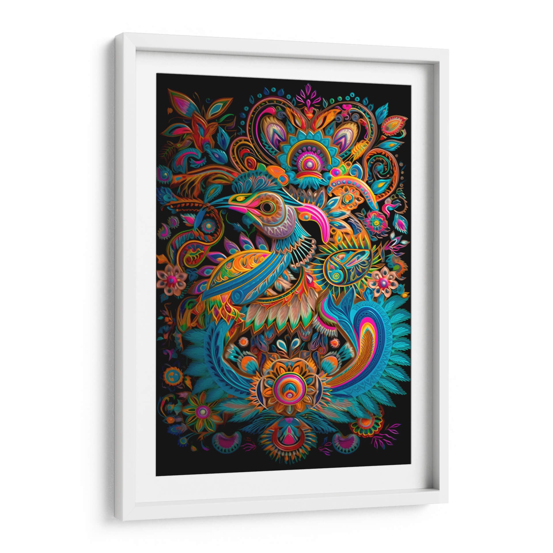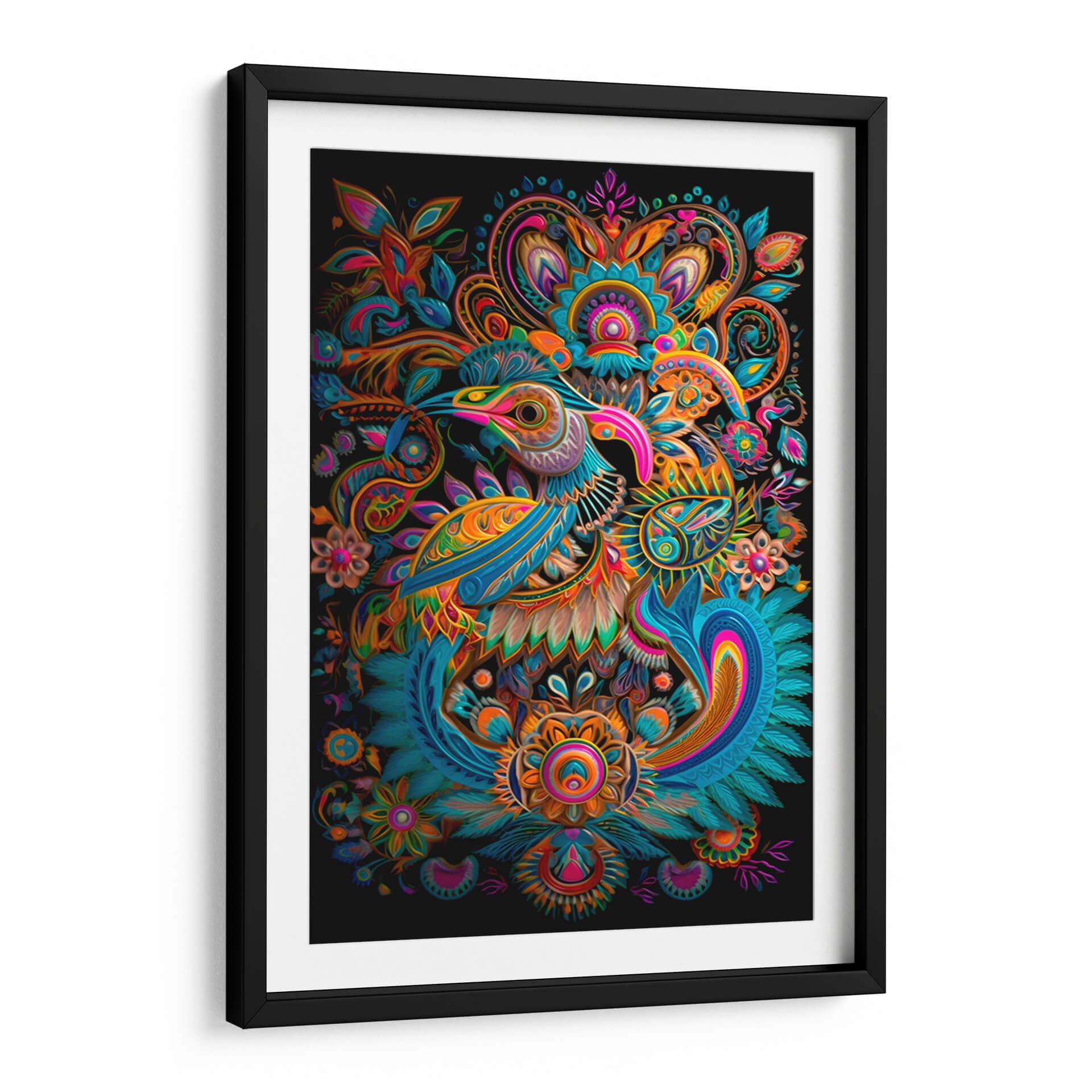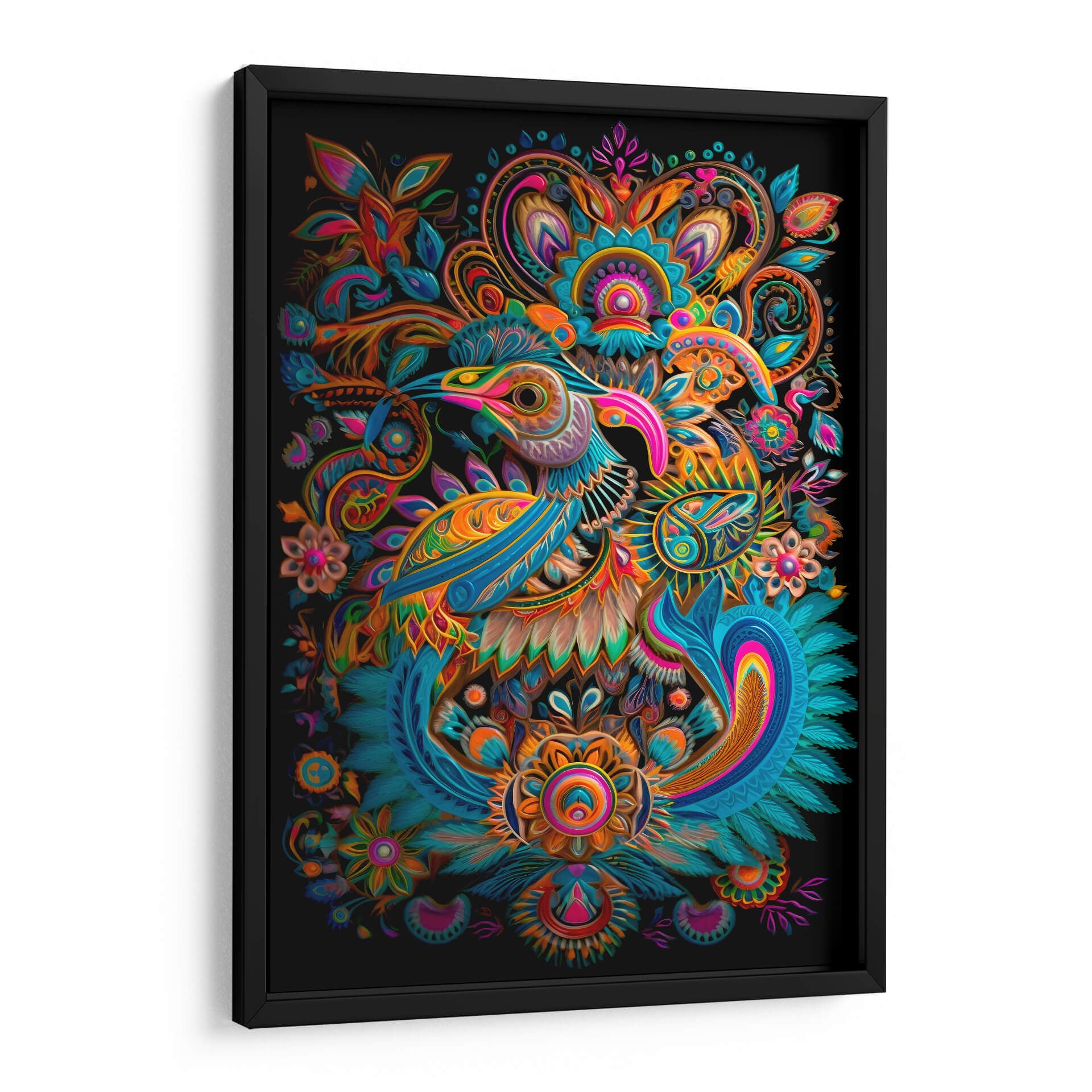 Sumérgete en un universo de color y fantasía con nuestro exclusivo cuadro decorativo 'Huichol1', una obra maestra del artista dangarlop que captura la esencia vibrante de la cultura Wixárika con un estilo contemporáneo y audaz. Esta pieza presenta una detallada y estilizada figura de ave, rodeada de intrincados motivos florales y patrones abstractos que evocan la riqueza de las tradiciones artesanales mexicanas. La paleta de colores es un festín visual, combinando tonos vibrantes de azul turquesa, naranja intenso, rosa fucsia y toques de amarillo y verde, todos contrastando sobre un fondo negro profundo que hace que cada detalle resalte con una energía cautivadora. La composición simétrica y los detalles intrincados invitan a la contemplación, generando una atmósfera de alegría exótica y sofisticación. Ideal para aquellos que buscan añadir un toque de arte único y lleno de vida a sus espacios, ya sea una sala de estar moderna, un comedor ecléctico o una oficina que inspire creatividad. 'Huichol1' no es solo una decoración de pared, es una declaración de estilo y una ventana a un mundo de simbolismo y arte vibrante.
