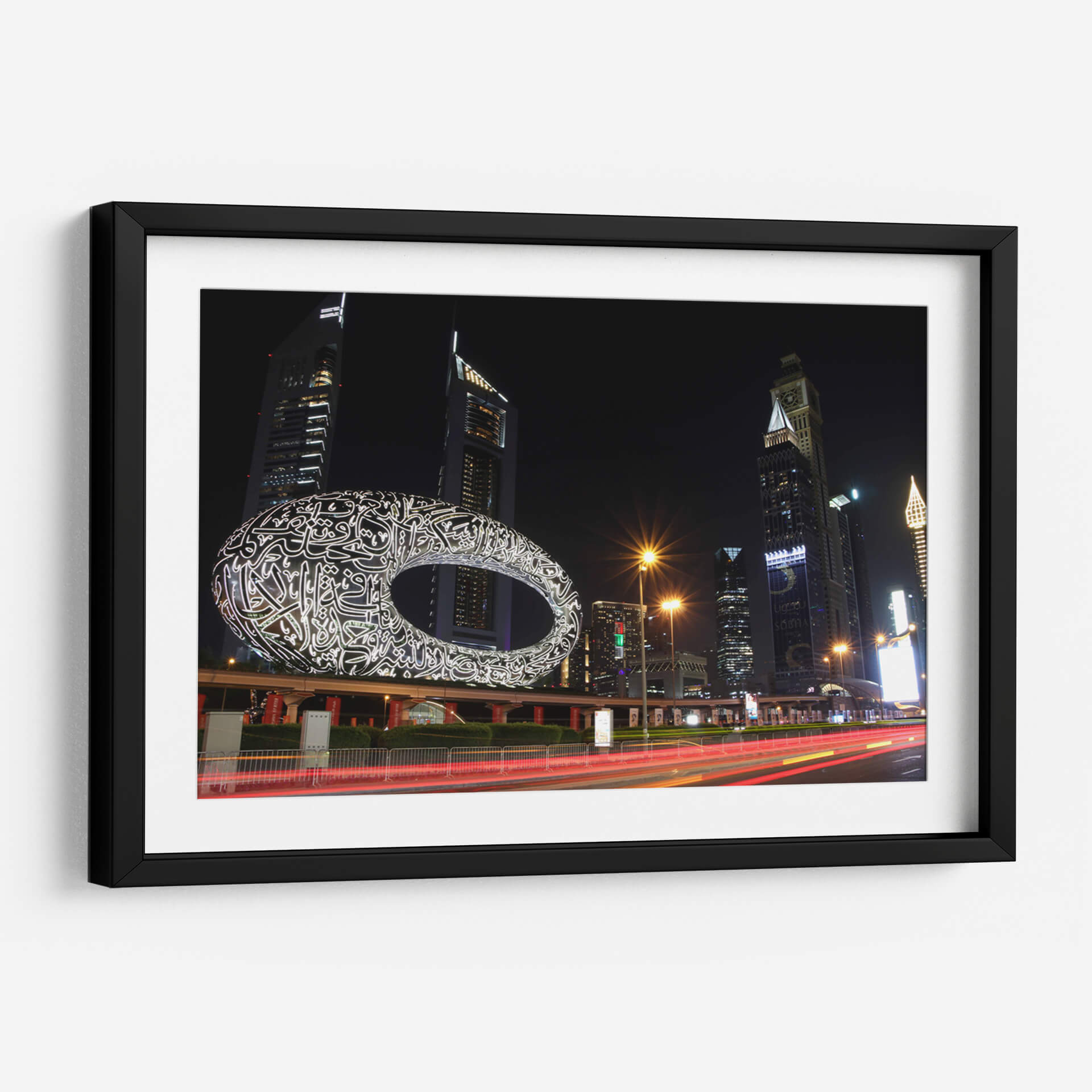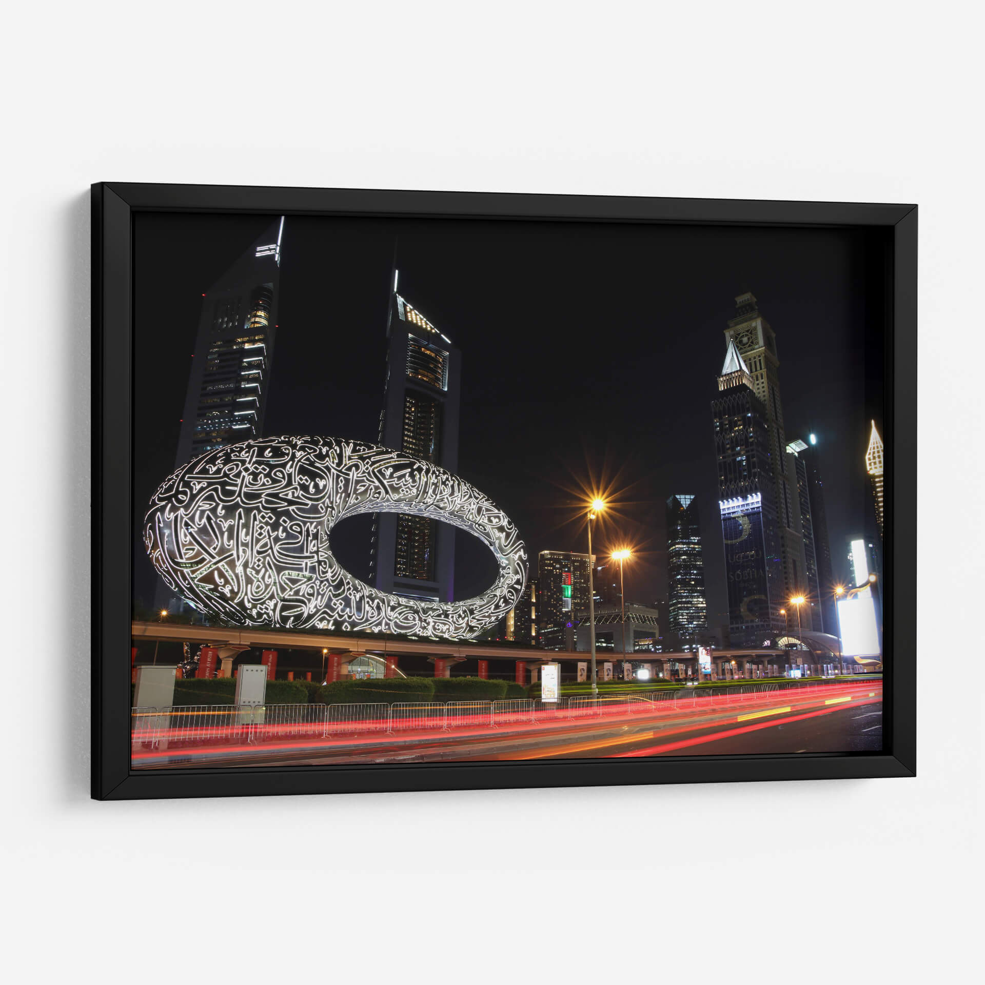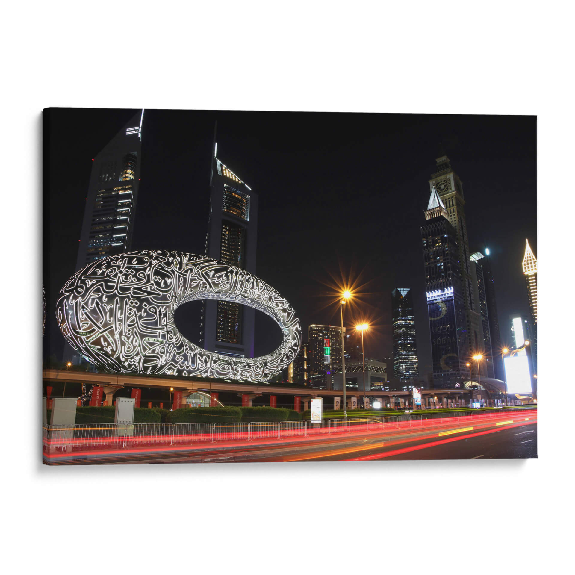 Captura la esencia futurista y la majestuosidad de Dubái con este impresionante cuadro decorativo "Impresionante museo del futuro en Dubái". La obra de Luis Rodrigo Magaña Andrade te transporta a una noche vibrante en la metrópolis, donde la arquitectura vanguardista se ilumina con un espectáculo de luces. El elemento central, un edificio con un diseño circular adornado con intrincada caligrafía árabe iluminada, se erige como un faro de innovación y cultura. Las líneas de luz de los vehículos que transitan por la autopista de varios niveles añaden un dinamismo electrizante a la escena, sugiriendo el constante movimiento y progreso de la ciudad. La paleta de colores nocturnos, dominada por negros profundos, blancos brillantes de las luces y destellos dorados y ámbar de las farolas, crea una atmósfera sofisticada y cautivadora. Este cuadro es ideal para infundir un toque de modernidad y un aire cosmopolita a tu sala de estar, oficina o cualquier espacio que desees realzar con una pieza de arte contemporáneo que inspire y sea un tema de conversación. Transforma tu hogar en una galería de arte con esta evocadora representación de la arquitectura icónica y la energía de Dubái.