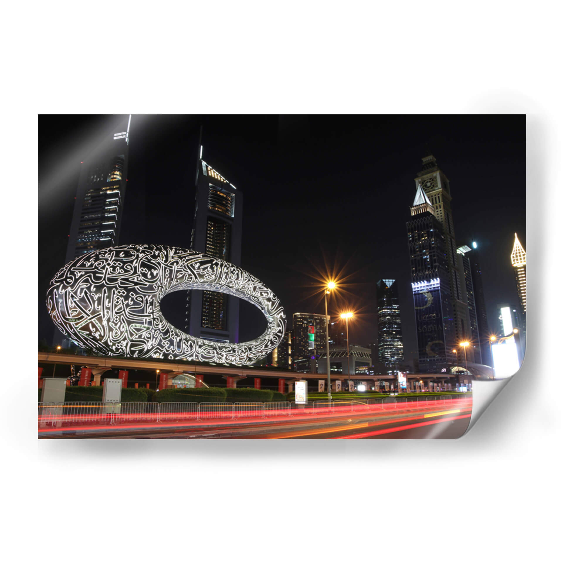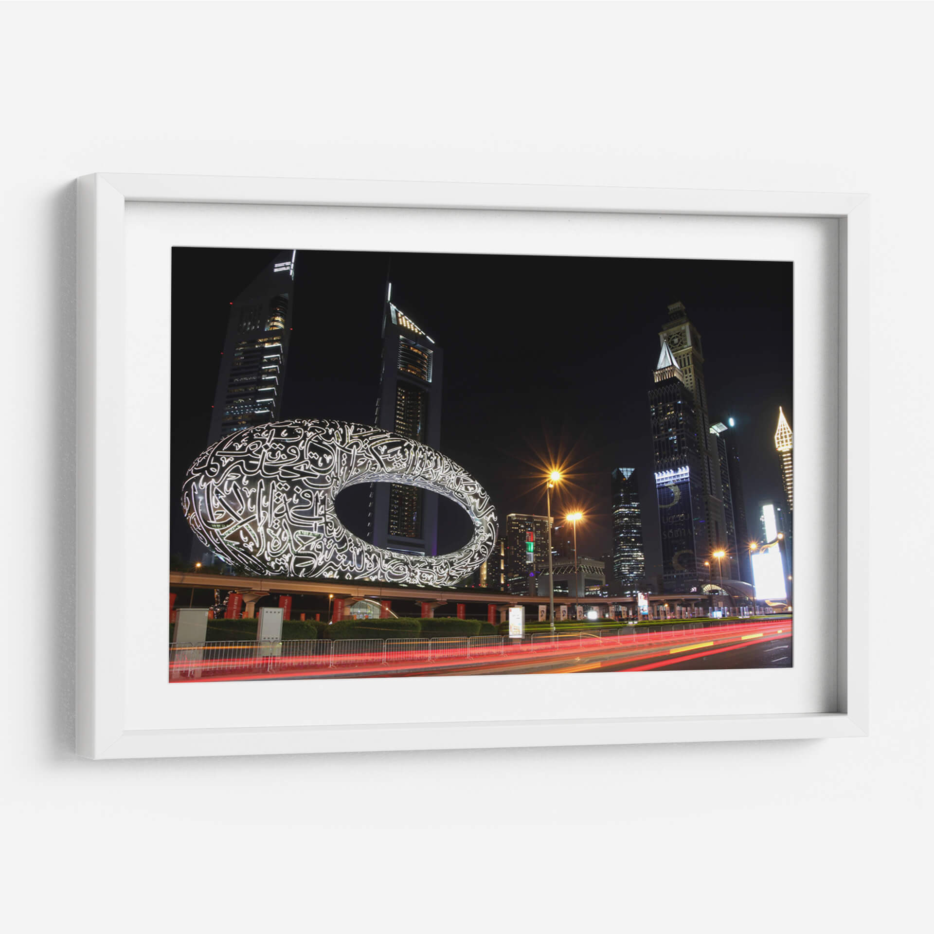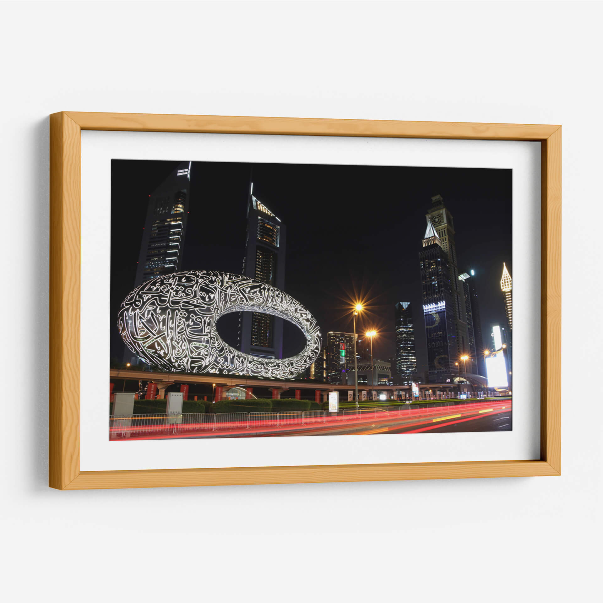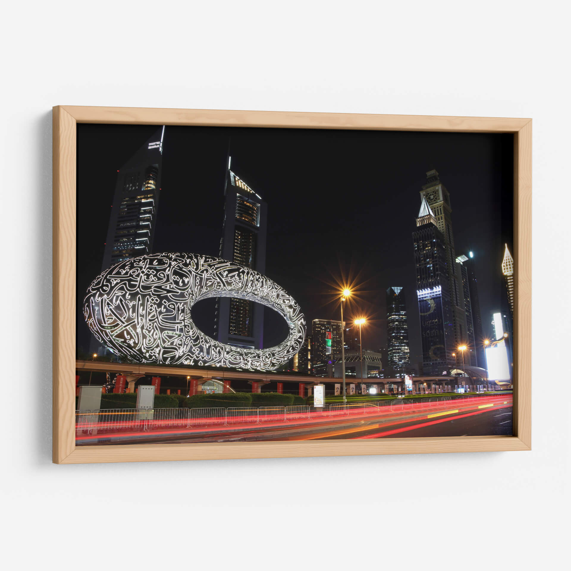 Captura la esencia futurista y la majestuosidad de Dubái con este impresionante cuadro decorativo "Impresionante museo del futuro en Dubái". La obra de Luis Rodrigo Magaña Andrade te transporta a una noche vibrante en la metrópolis, donde la arquitectura vanguardista se ilumina con un espectáculo de luces. El elemento central, un edificio con un diseño circular adornado con intrincada caligrafía árabe iluminada, se erige como un faro de innovación y cultura. Las líneas de luz de los vehículos que transitan por la autopista de varios niveles añaden un dinamismo electrizante a la escena, sugiriendo el constante movimiento y progreso de la ciudad. La paleta de colores nocturnos, dominada por negros profundos, blancos brillantes de las luces y destellos dorados y ámbar de las farolas, crea una atmósfera sofisticada y cautivadora. Este cuadro es ideal para infundir un toque de modernidad y un aire cosmopolita a tu sala de estar, oficina o cualquier espacio que desees realzar con una pieza de arte contemporáneo que inspire y sea un tema de conversación. Transforma tu hogar en una galería de arte con esta evocadora representación de la arquitectura icónica y la energía de Dubái.