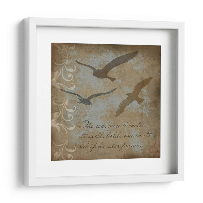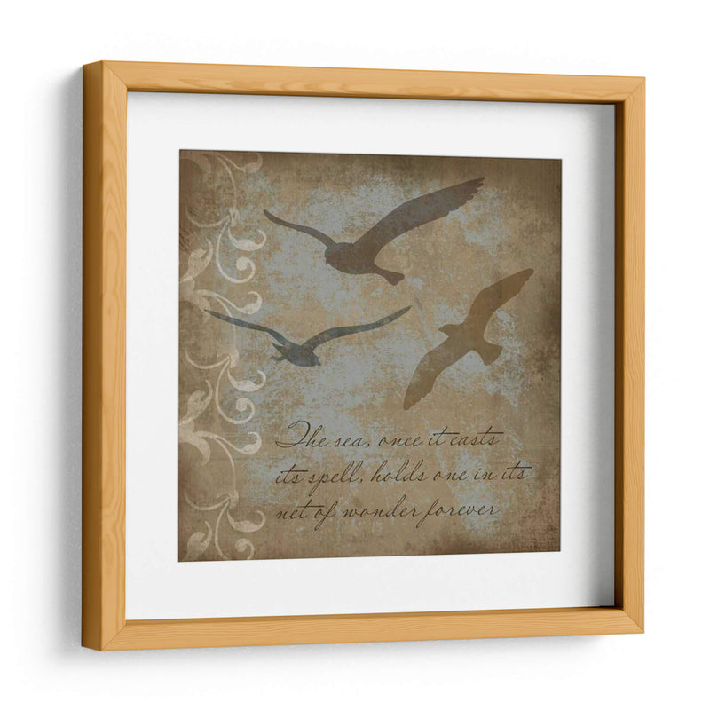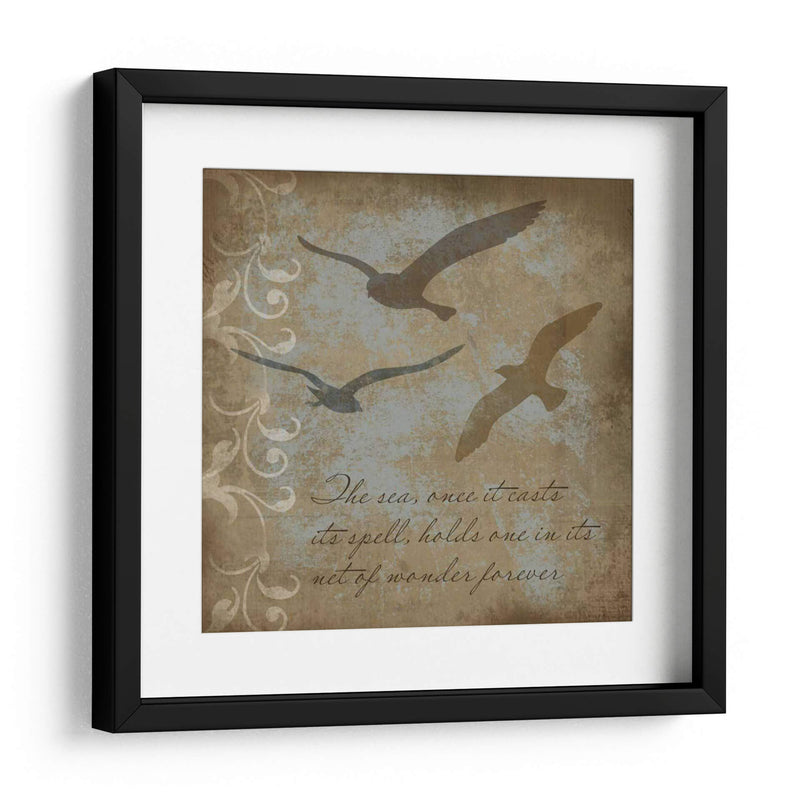Sumérgete en la serenidad costera con "Inspiración Costera II", una cautivadora obra de arte de Beth Anne Creative. Este cuadro decorativo captura la libertad y el misterio del mar a través de la silueta de tres aves volando en un cielo texturizado, evocando la inmensidad del océano. La paleta de colores, dominada por tonos tierra y azules sutiles, junto con un diseño floral de inspiración vintage en el lateral, crea una atmósfera nostálgica y tranquila. La frase "The sea, once it casts its spell, holds one in its net of wonder forever" añade un toque poético y reflexivo, invitando a la contemplación. Ideal para espacios que buscan un refugio de paz, como dormitorios, salas de estar o estudios, este arte de pared es perfecto para quienes aprecian la belleza de la naturaleza y la libertad. Su estilo semi-abstracto y texturizado lo convierte en un punto focal elegante y con carácter, aportando una sensación de calma y conexión con el mar a cualquier hogar u oficina.