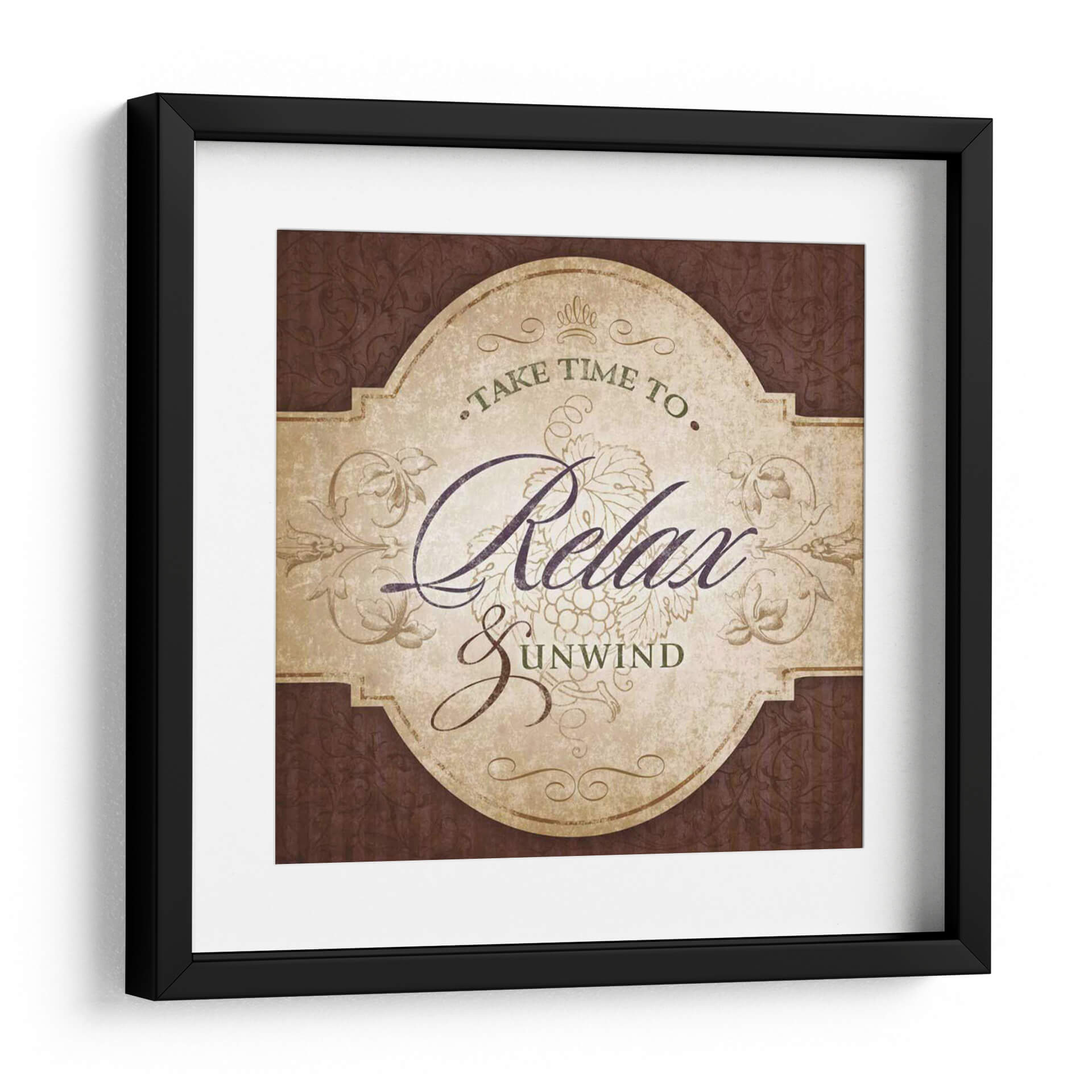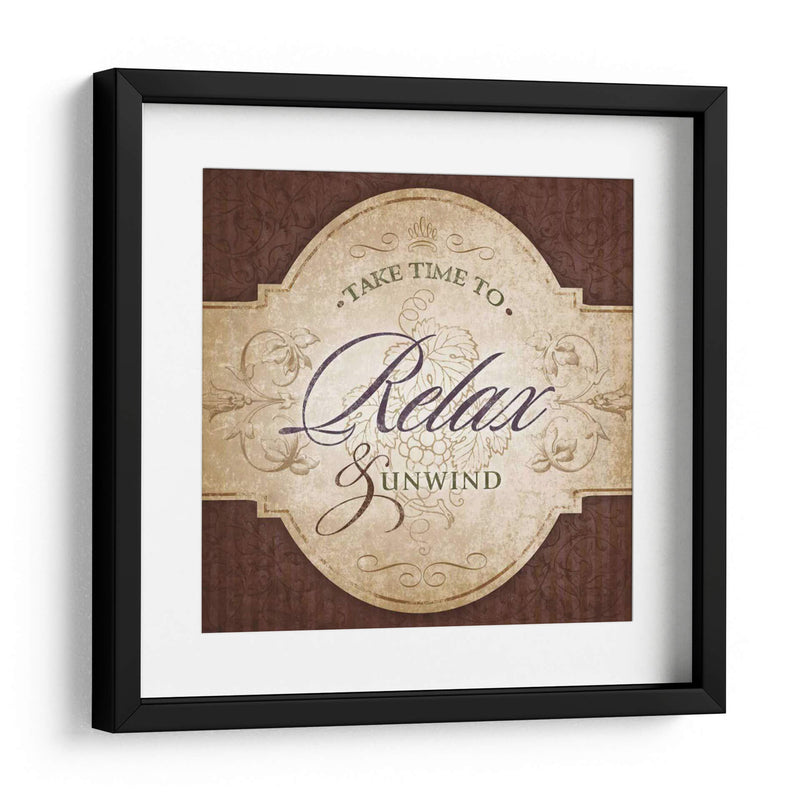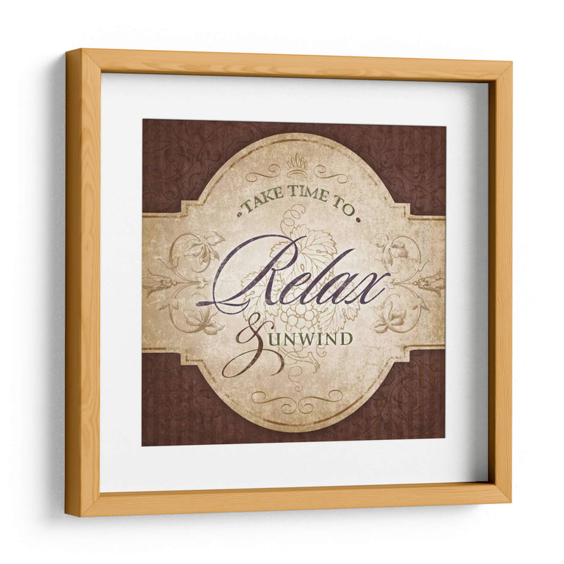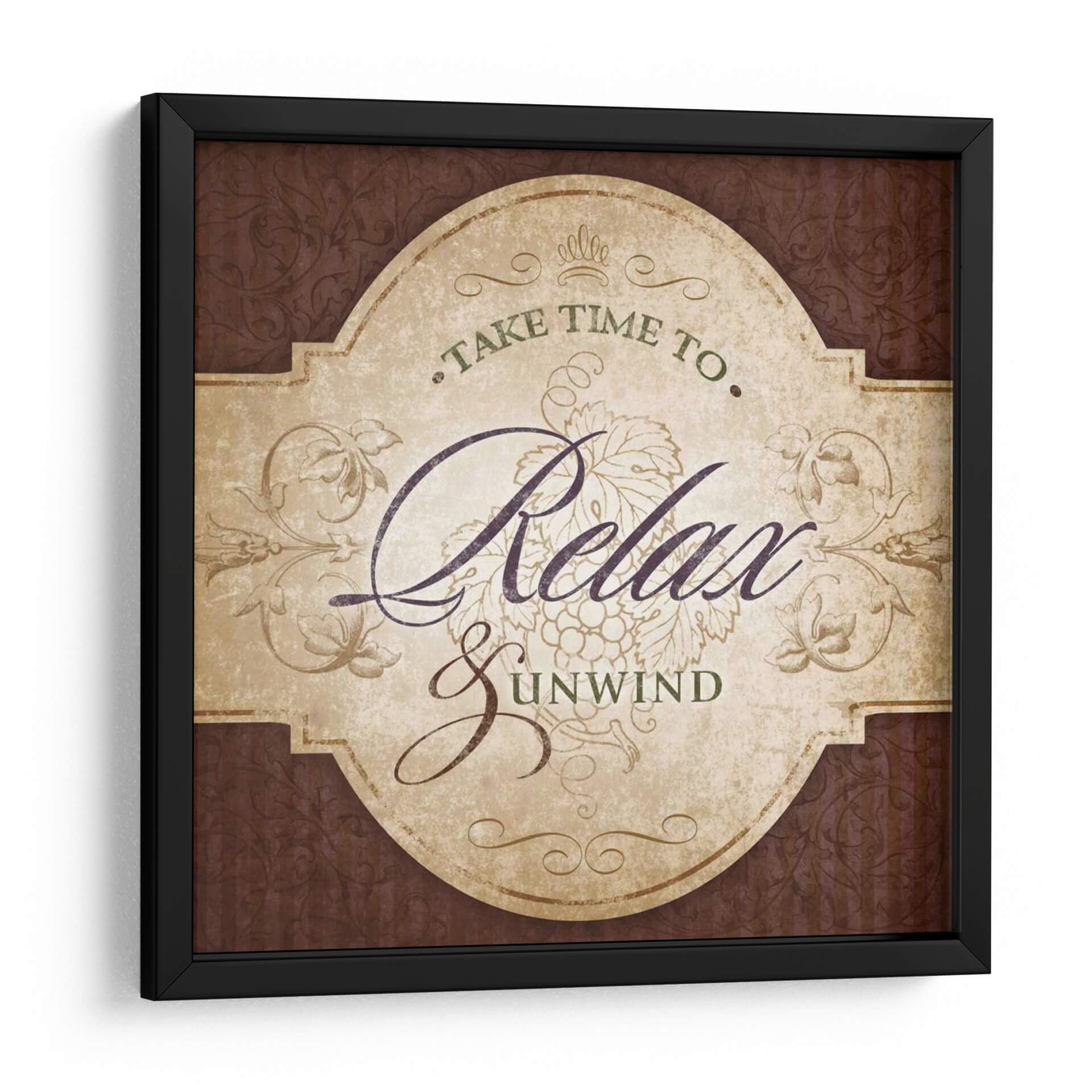 Sumérgete en la tranquilidad con "Inspiración Del Vino Iv", una obra de arte que evoca momentos de calma y disfrute. Esta pieza, con un diseño inspirado en etiquetas de vino clásicas, presenta una tipografía elegante en tonos morados y verdes sobre un fondo texturizado en tonos sepia y marrón oscuro. El texto "Take time to Relax & Unwind" (Tómate tiempo para Relajarte y Desconectar) invita a la contemplación, mientras que los delicados grabados de hojas de vid y racimos de uvas añaden un toque de sofisticación campestre. Los sutiles remolinos y el detalle de una pequeña corona en la parte superior del óvalo principal crean una atmósfera de elegancia atemporal. Este cuadro decorativo es perfecto para añadir un acento de serenidad y un aire de 'dolce vita' a tu hogar, ya sea en la cocina, el comedor, la sala de estar o incluso en un rincón de lectura. Su diseño evocador y su paleta de colores cálidos lo convierten en un punto focal acogedor que invita a la relajación y al disfrute de los pequeños placeres de la vida. Ideal para amantes del vino y aquellos que buscan un recordatorio diario para desconectar.