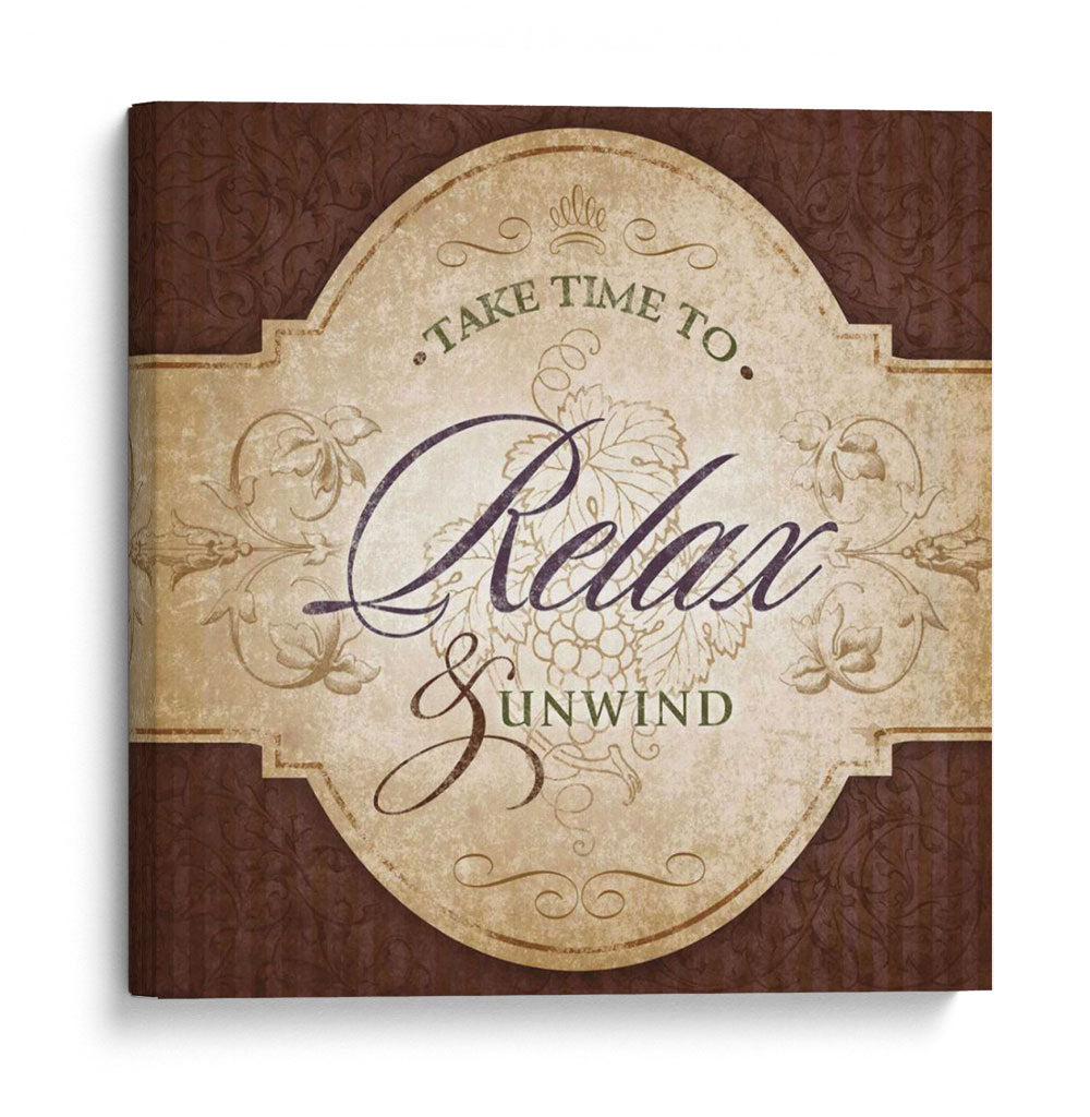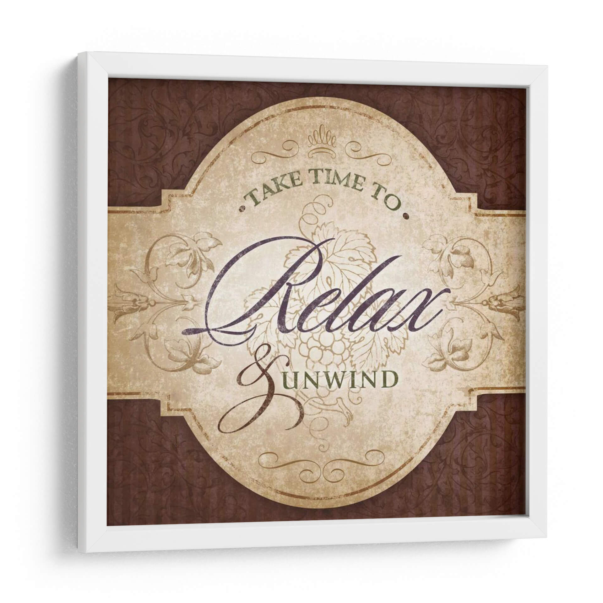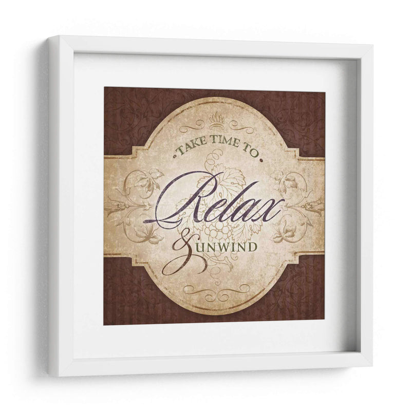 Sumérgete en la tranquilidad con "Inspiración Del Vino Iv", una obra de arte que evoca momentos de calma y disfrute. Esta pieza, con un diseño inspirado en etiquetas de vino clásicas, presenta una tipografía elegante en tonos morados y verdes sobre un fondo texturizado en tonos sepia y marrón oscuro. El texto "Take time to Relax & Unwind" (Tómate tiempo para Relajarte y Desconectar) invita a la contemplación, mientras que los delicados grabados de hojas de vid y racimos de uvas añaden un toque de sofisticación campestre. Los sutiles remolinos y el detalle de una pequeña corona en la parte superior del óvalo principal crean una atmósfera de elegancia atemporal. Este cuadro decorativo es perfecto para añadir un acento de serenidad y un aire de 'dolce vita' a tu hogar, ya sea en la cocina, el comedor, la sala de estar o incluso en un rincón de lectura. Su diseño evocador y su paleta de colores cálidos lo convierten en un punto focal acogedor que invita a la relajación y al disfrute de los pequeños placeres de la vida. Ideal para amantes del vino y aquellos que buscan un recordatorio diario para desconectar.