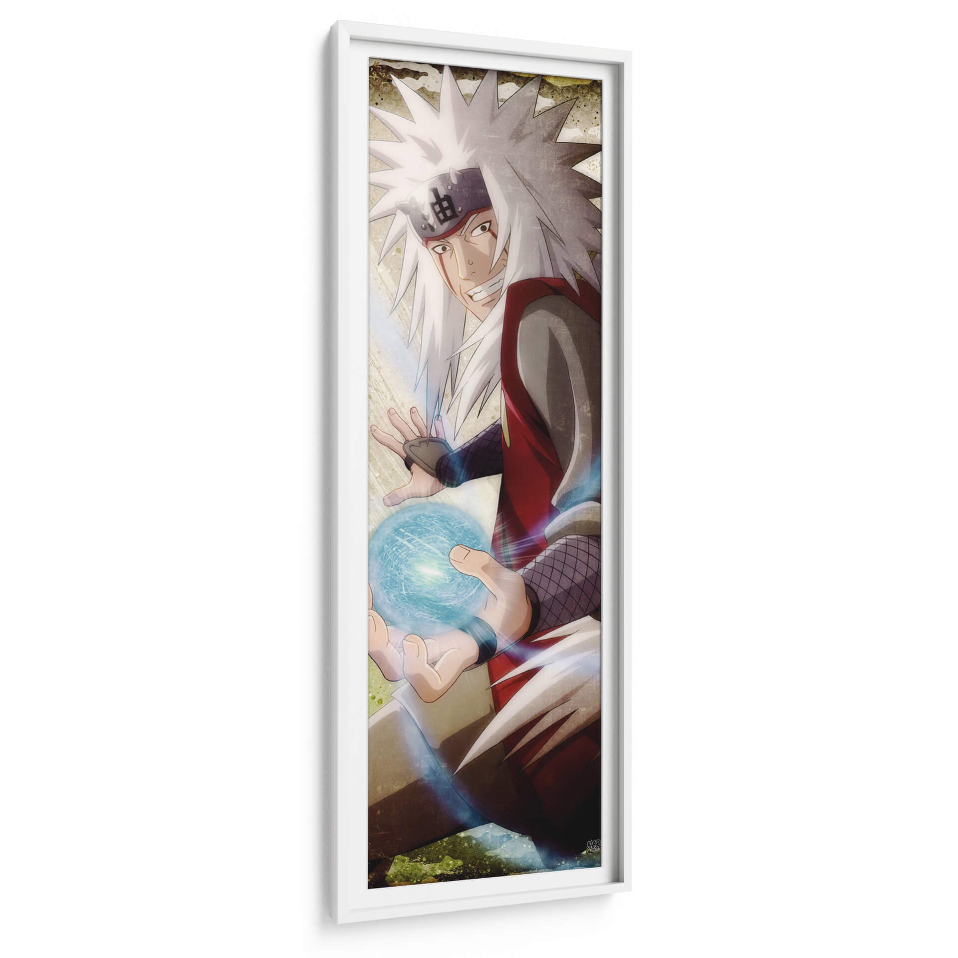 Sumérgete en el mundo de la acción y la energía con este cautivador cuadro decorativo que representa a "Jiraiya". La obra captura un momento dinámico, con el personaje en pleno despliegue de sus poderes, manifestado en una esfera de energía azul brillante que emana una luz intensa. La paleta de colores se centra en tonos rojizos vibrantes de su vestimenta, contrastando con el blanco intenso de su cabello y el azul eléctrico de la energía. El fondo, con texturas que sugieren un entorno natural o místico, añade profundidad y un toque terroso que equilibra la intensidad de la escena. El estilo artístico, inspirado en el anime, presenta líneas definidas y expresiones faciales cargadas de emoción, transmitiendo determinación y poder. Este cuadro es ideal para espacios que buscan un toque de audacia y fantasía, como una sala de estar moderna, una oficina o una habitación de gaming. Aporta un aire de fuerza y una narrativa visual que resonará con los aficionados a la cultura pop y a las historias épicas, convirtiéndose en un punto focal que inspira y evoca aventura.