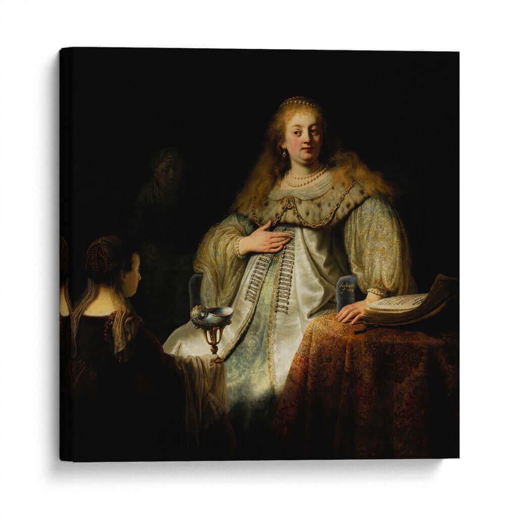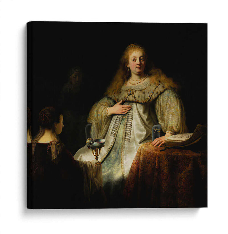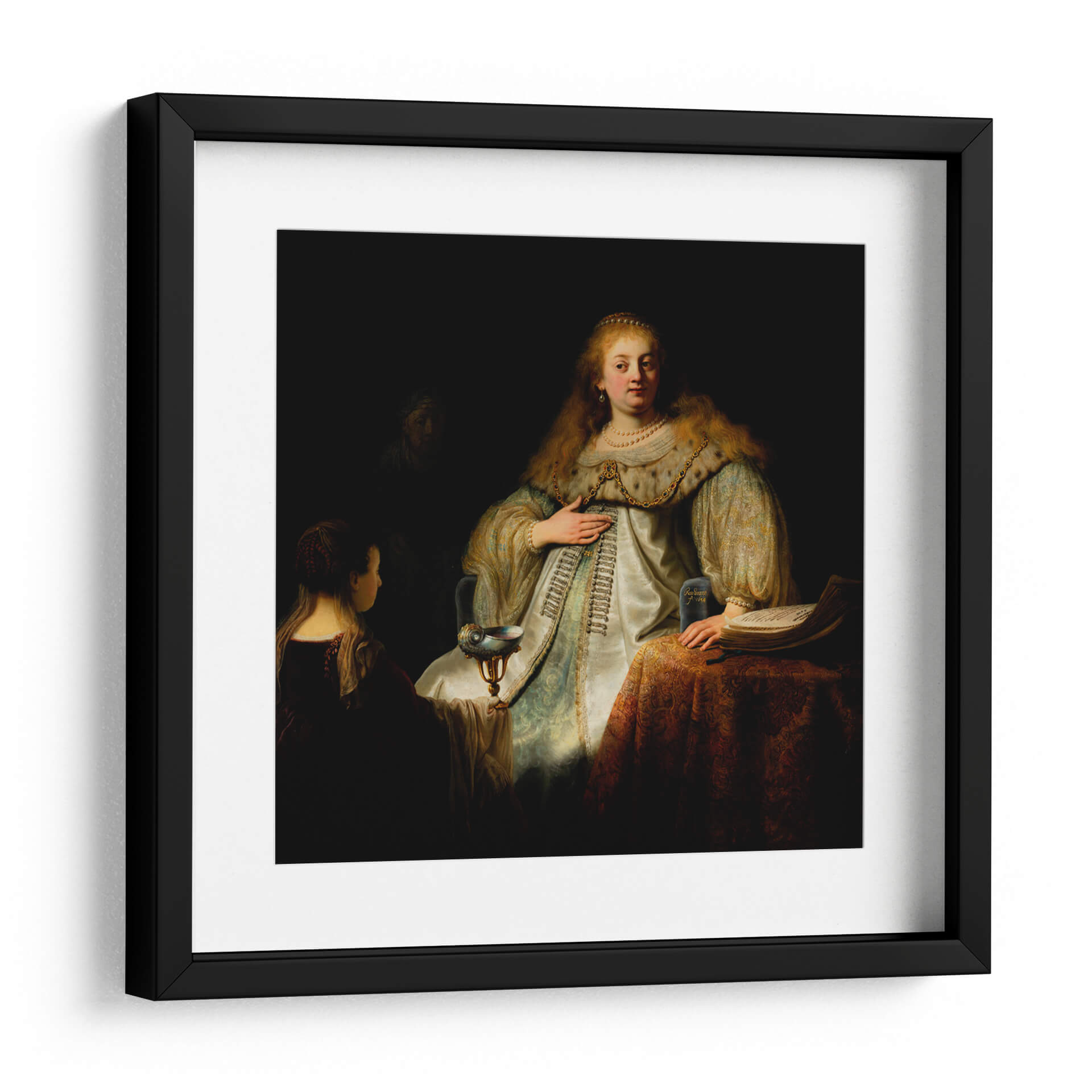 Sumérgete en la intensidad dramática de "Judit en el banquete de Holofernes", una obra maestra que captura un momento crucial de la narrativa bíblica con una emotividad palpable. Rembrandt van Rijn, a través de su maestría en el claroscuro, ilumina la figura central de Judit con una luz cálida que resalta la riqueza de sus vestiduras y la profundidad de su expresión. La composición, centrada en la figura femenina enigmática y su confidente, crea una atmósfera de tensión contenida y poder femenino. Los tonos dorados, marrones profundos y toques de blanco y azul en su atuendo, junto con la sutil luz que emana de la escena, invitan a la contemplación y al análisis. Este cuadro decorativo es ideal para espacios que buscan un punto focal de conversación, aportando un aire de sofisticación clásica y profundidad histórica a salones, estudios u oficinas. Su capacidad para evocar emociones complejas lo convierte en una adición impactante para coleccionistas y amantes del arte barroco.