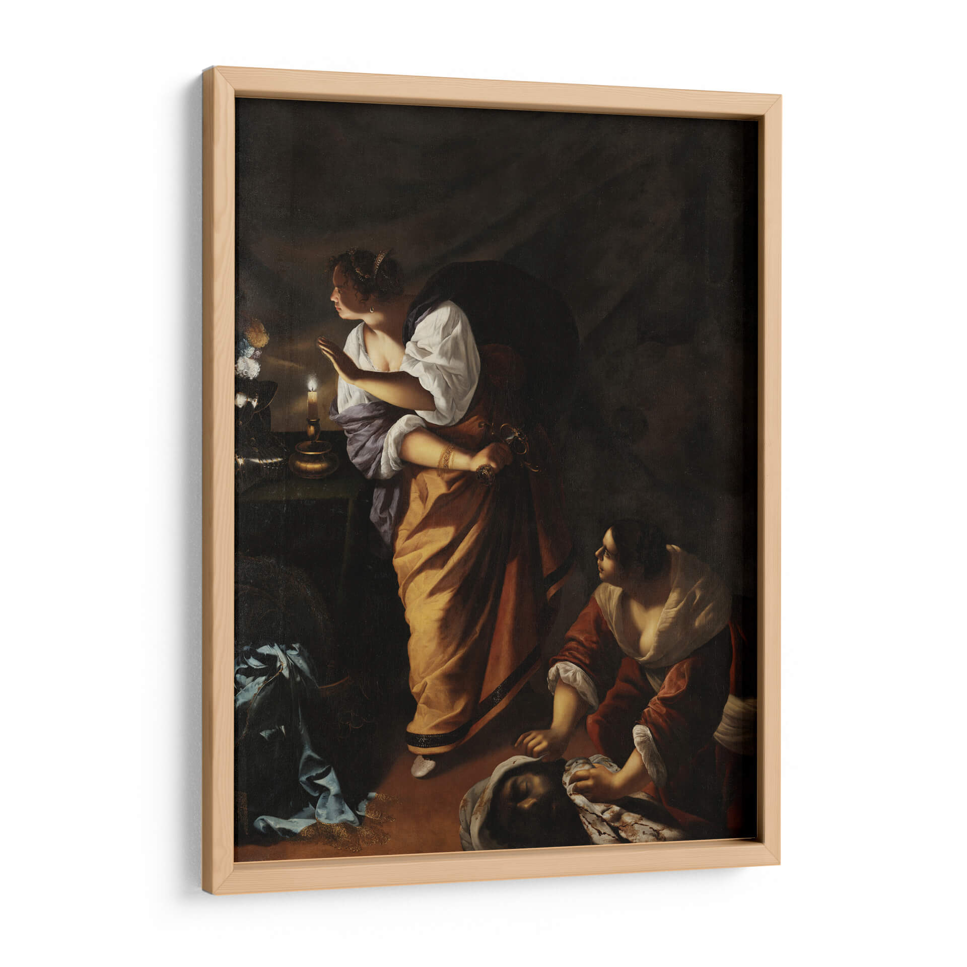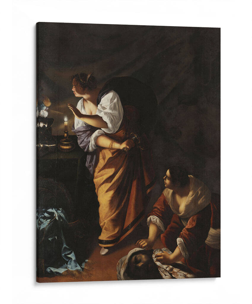 Sumérgete en la intensidad dramática de "Judit y su doncella con la cabeza de Holofernes", una obra maestra que captura un momento de audacia y determinación. Artemisia Gentileschi, una de las pintoras más influyentes del Barroco, nos transporta a una escena de poder femenino y coraje a través de su magistral uso del claroscuro. La luz de una vela ilumina con un brillo teatral a las dos mujeres mientras ejecutan su plan, proyectando sombras profundas que acentúan la tensión y el sigilo de la acción. Los ricos tonos terrosos y las sutiles carnes contrastan con los oscuros fondos, creando una atmósfera de intimidad y urgencia. La composición, centrada en las figuras y sus expresiones, evoca una poderosa narrativa de valentía y resolución, invitando a la reflexión sobre la fuerza interior y la superación de adversidades. Este cuadro decorativo es ideal para añadir un toque de historia y drama a cualquier sala de estar, estudio u oficina, sirviendo como un punto focal que inspira y conmueve. Una pieza que no solo embellece tu espacio, sino que también cuenta una historia de empoderamiento y audacia.