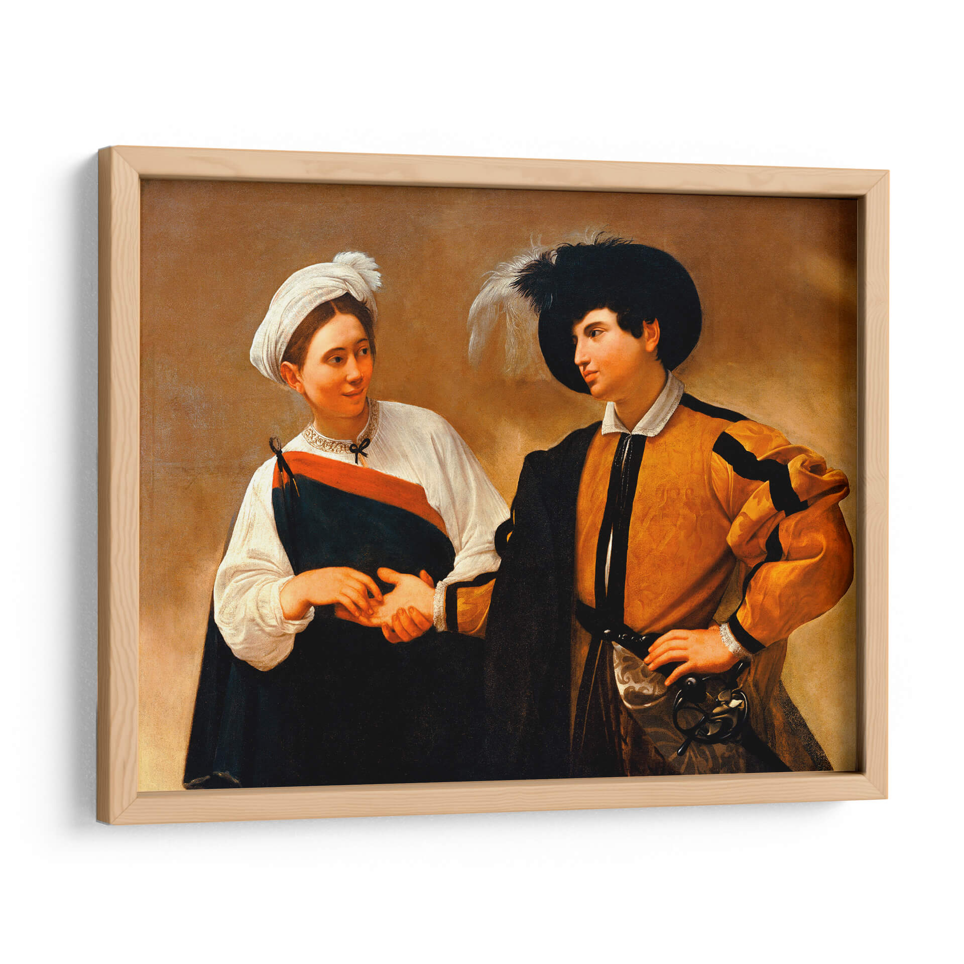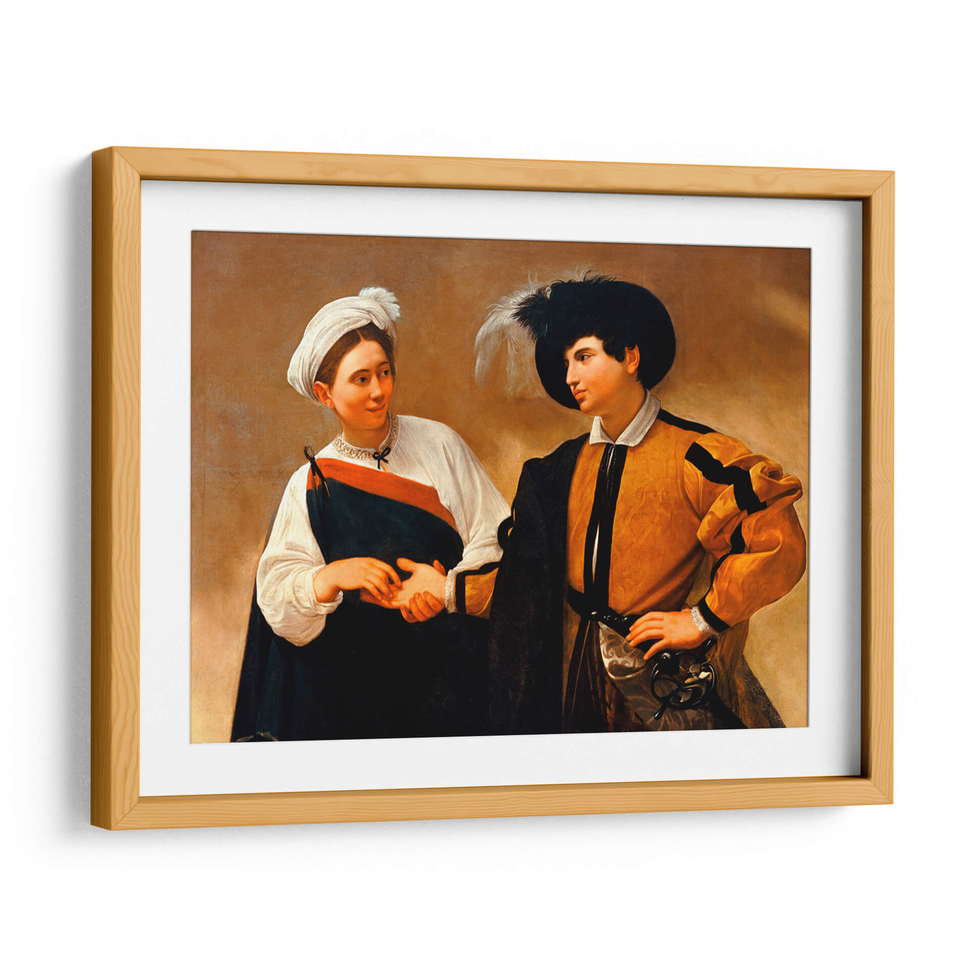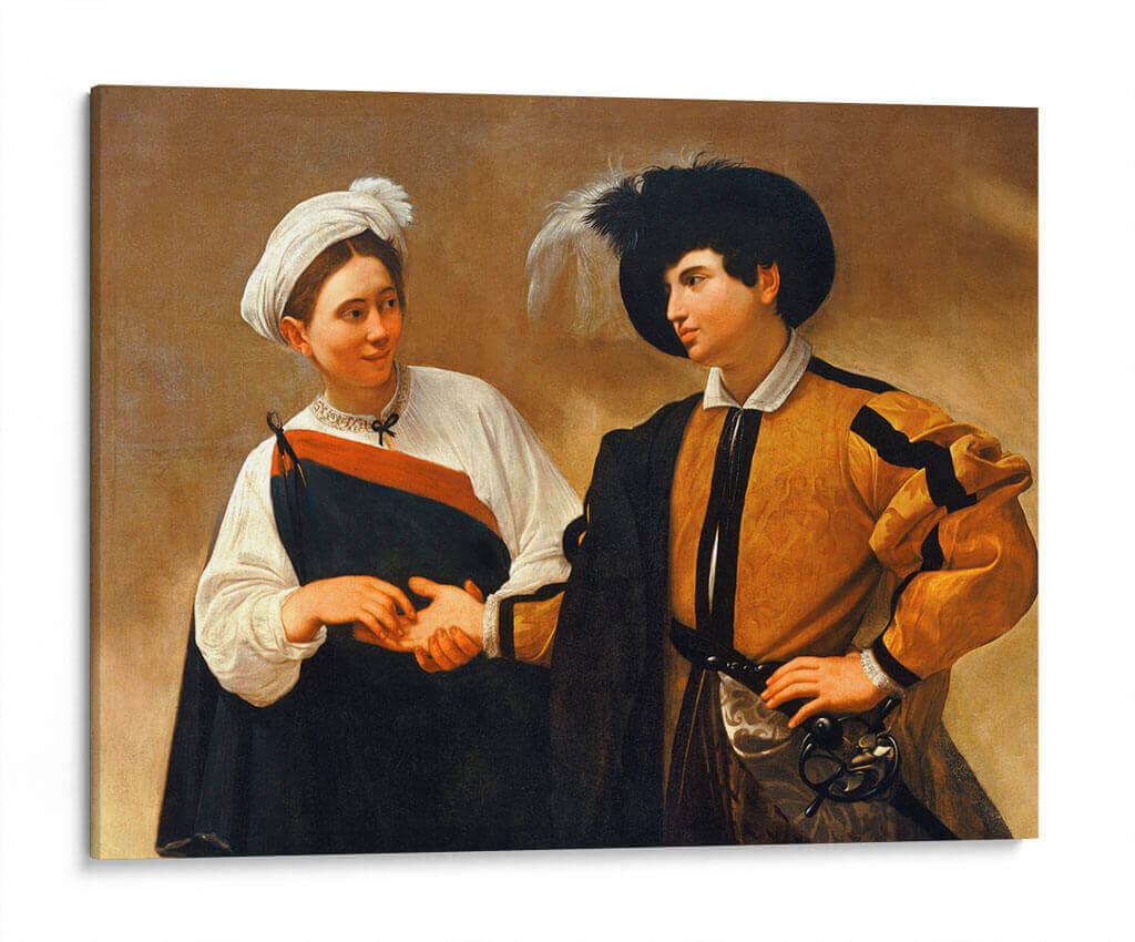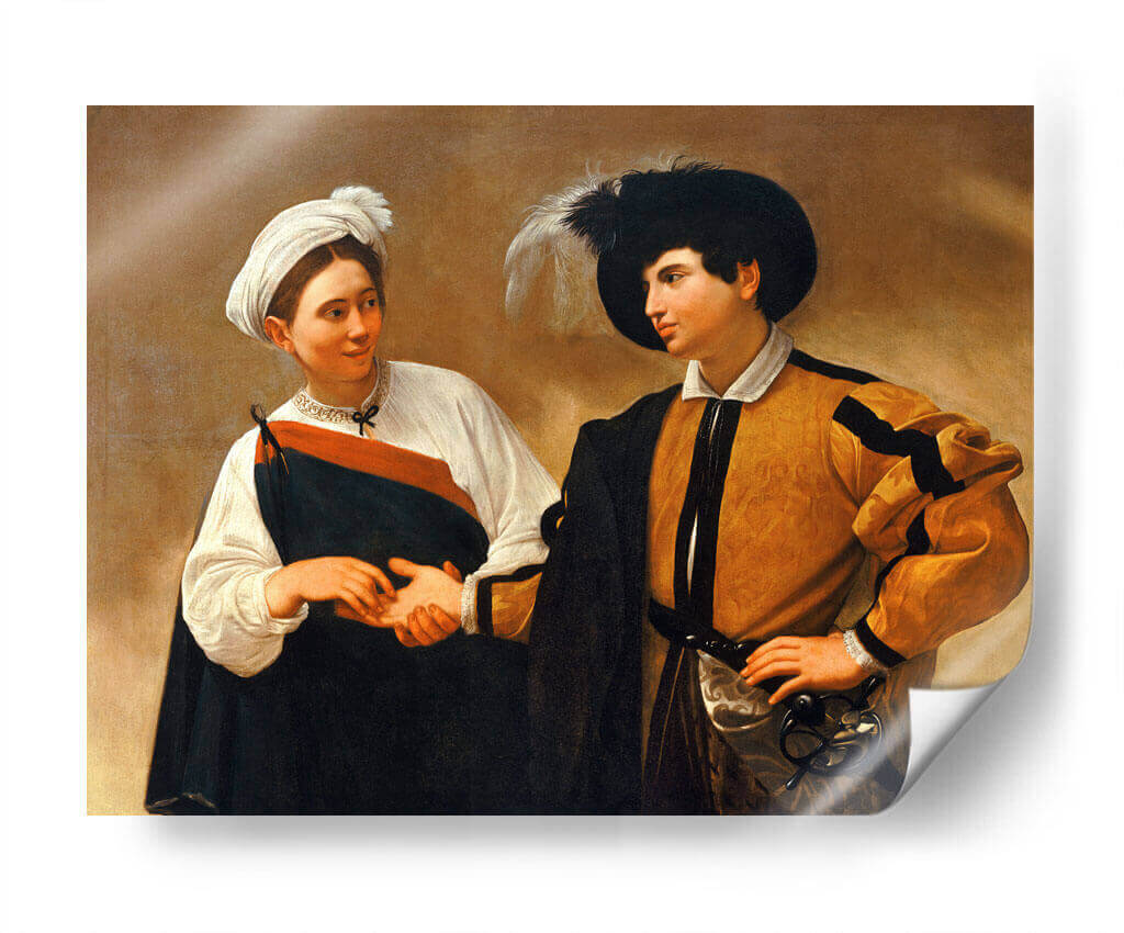 Sumérgete en la obra maestra "La Buenaventura" de Caravaggio, una pieza que captura un momento íntimo y lleno de suspense. Este cuadro decorativo, reimaginado para tu espacio, te transporta al siglo XVII con su magistral uso del claroscuro y su profunda narrativa visual. Observa la interacción entre los dos personajes: la adivina, con su mirada penetrante y vestimenta tradicional, y el joven soldado, que con gesto cauteloso extiende su mano, ajeno al destino que se revela. La paleta de colores cálidos, dominada por ocres y sombras profundas, crea una atmósfera de misterio y realismo crudo que caracteriza al genio de Caravaggio. Cada detalle, desde la textura de las telas hasta la expresión facial sutil, está representado con una maestría que invita a la contemplación. Ideal para añadir un toque de drama histórico y sofisticación a tu salón, estudio u oficina, "La Buenaventura" es más que una simple decoración; es una ventana a una historia y un testimonio del poder del arte para evocar emociones y despertar la imaginación. Transforma tu entorno con esta obra icónica, perfecta para amantes del arte clásico y para quienes buscan piezas con carácter y profundidad.