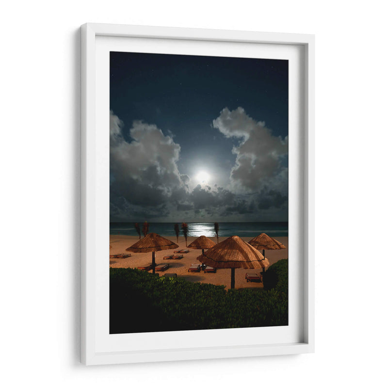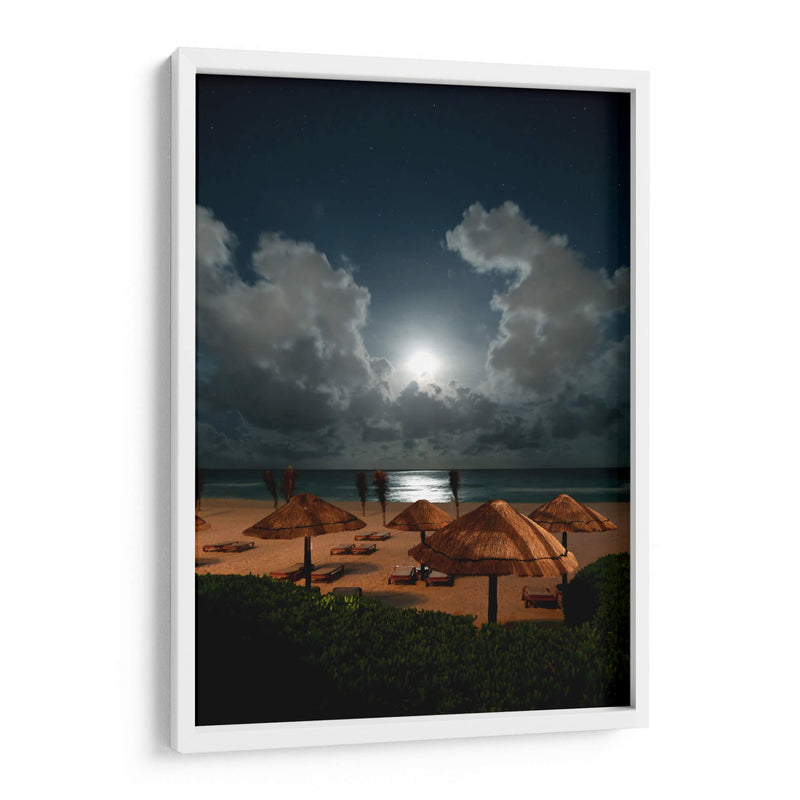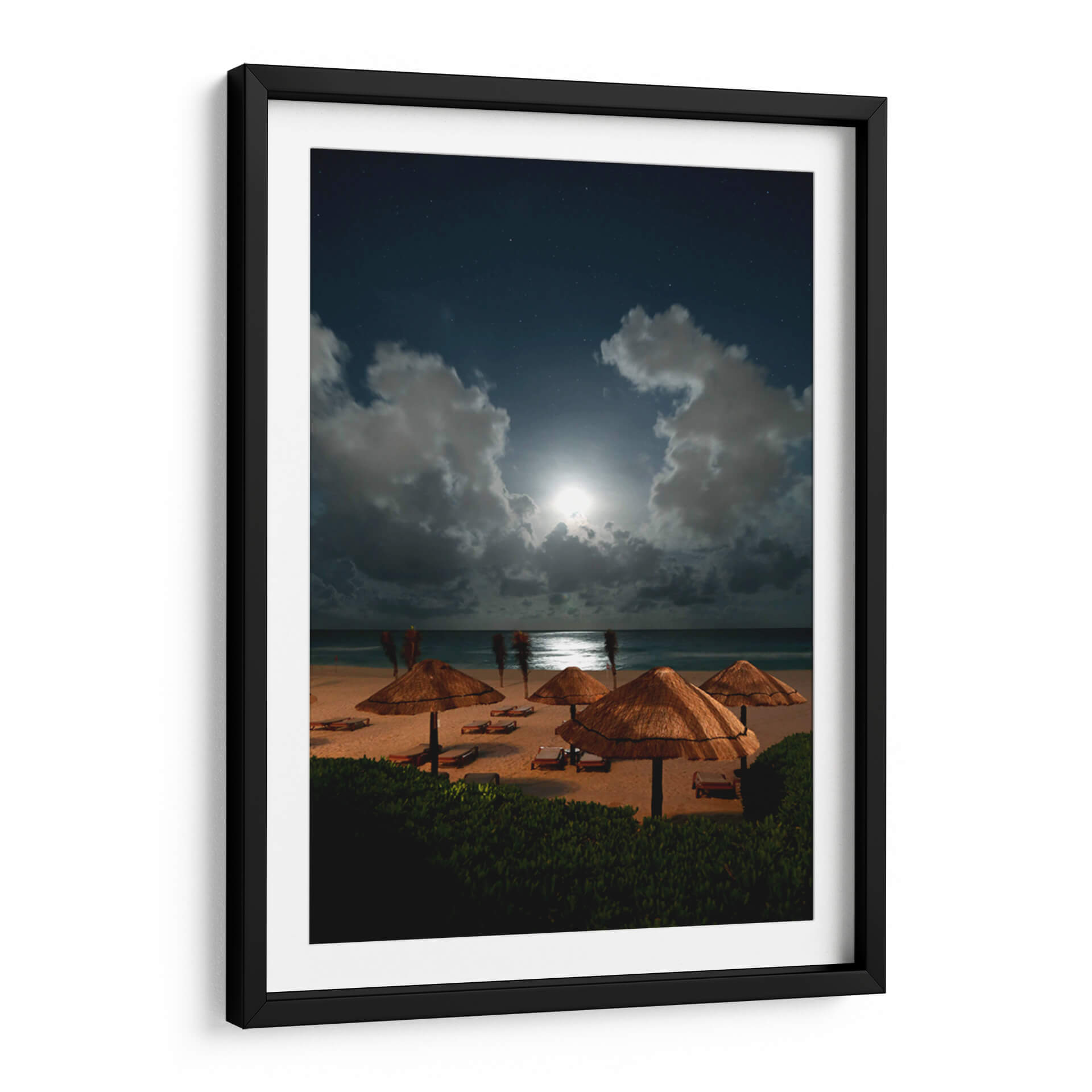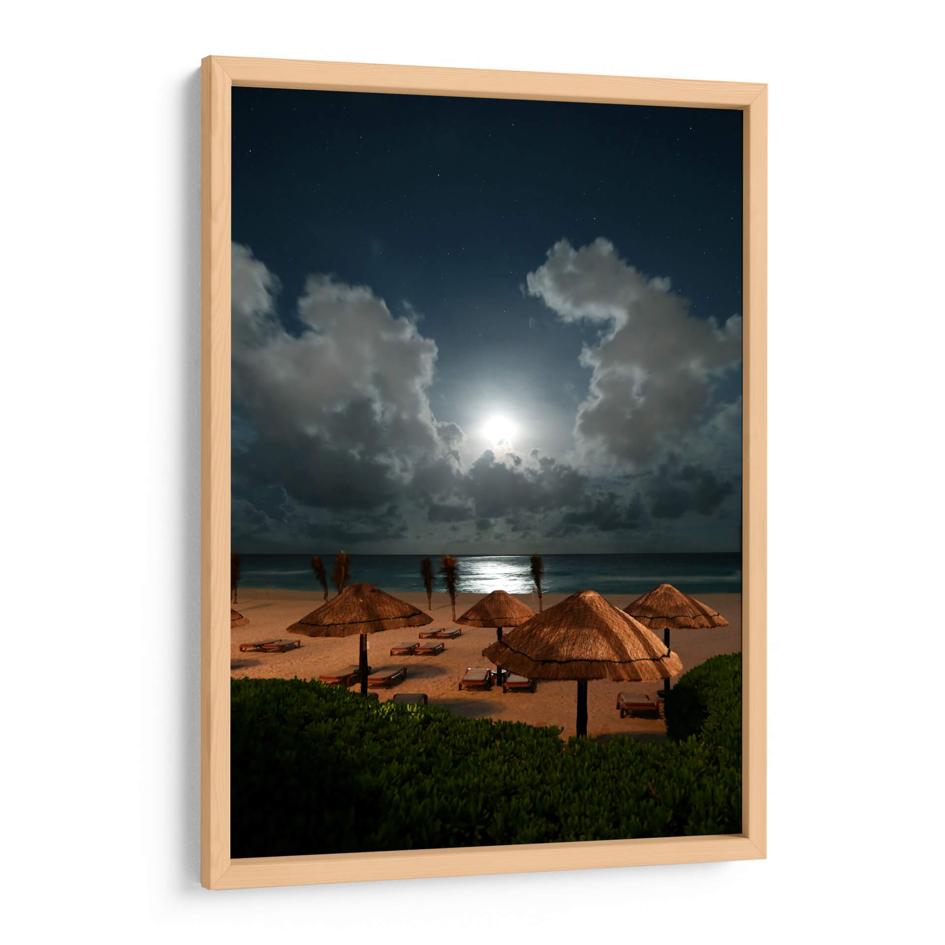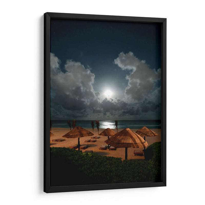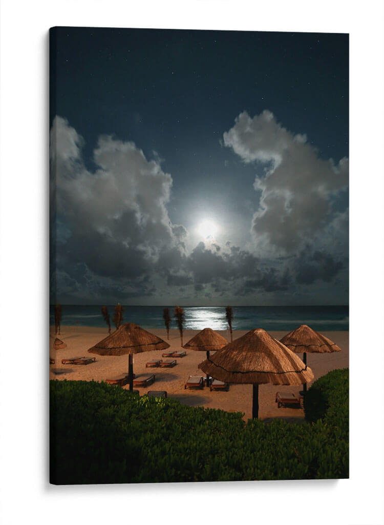 Captura la magia nocturna de un paraíso tropical con "La luna en Cancún", una obra de arte que transporta directamente a una serena playa bajo el resplandor de la luna llena. Este cuadro decorativo presenta una escena de ensueño con la luna iluminando el cielo oscuro, salpicado de estrellas, y una suave estela de luz reflejada sobre el mar turquesa. Las nubes, dramáticas y etéreas, añaden profundidad y misterio a la composición. En primer plano, las siluetas de sombrillas de playa y tumbonas vacías invitan a la contemplación y al descanso, evocando una sensación de tranquilidad y exclusividad. La vegetación exuberante en el borde inferior del cuadro contrasta con la arena dorada, creando un ambiente acogedor y natural. Los tonos oscuros predominantes, con el brillo plateado de la luna y el azul profundo del océano como puntos focales, crean una atmósfera de calma y sofisticación. Ideal para quienes buscan añadir un toque de serenidad y elegancia a su hogar u oficina, este cuadro es una ventana a la paz y la belleza de una noche caribeña inolvidable. Transforma tu espacio con esta pieza única que celebra la belleza atemporal de la naturaleza y la seducción de la noche.