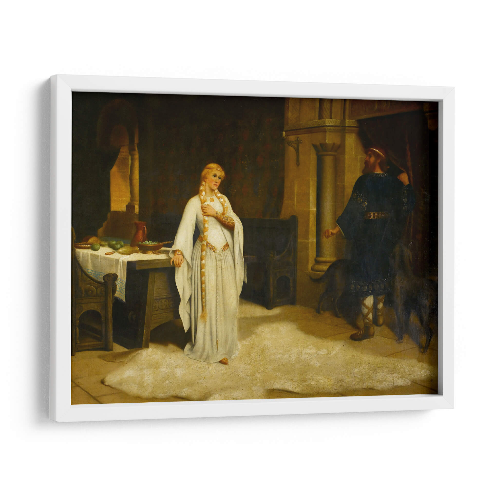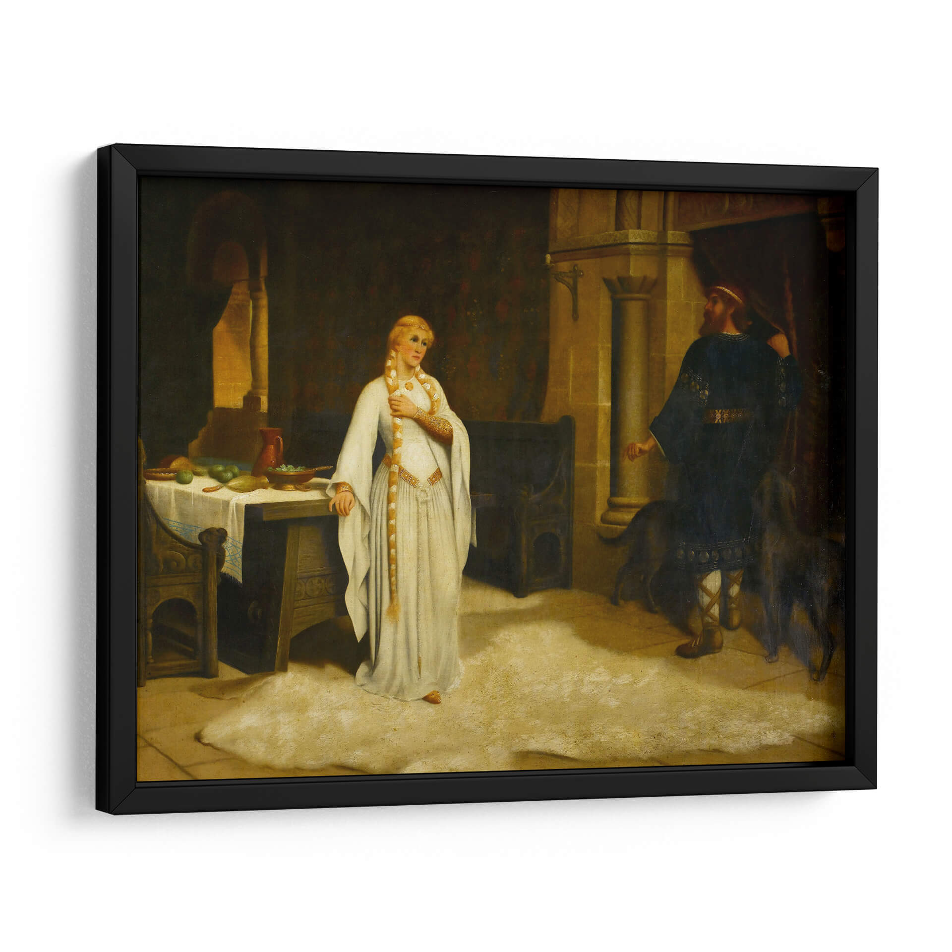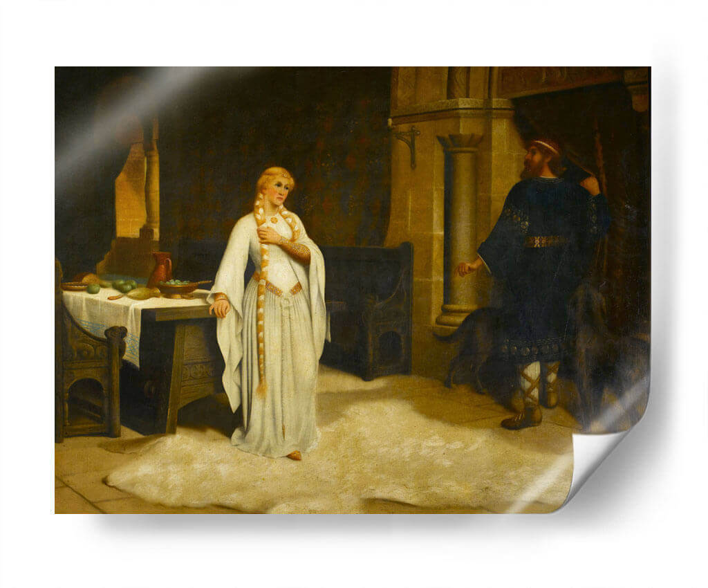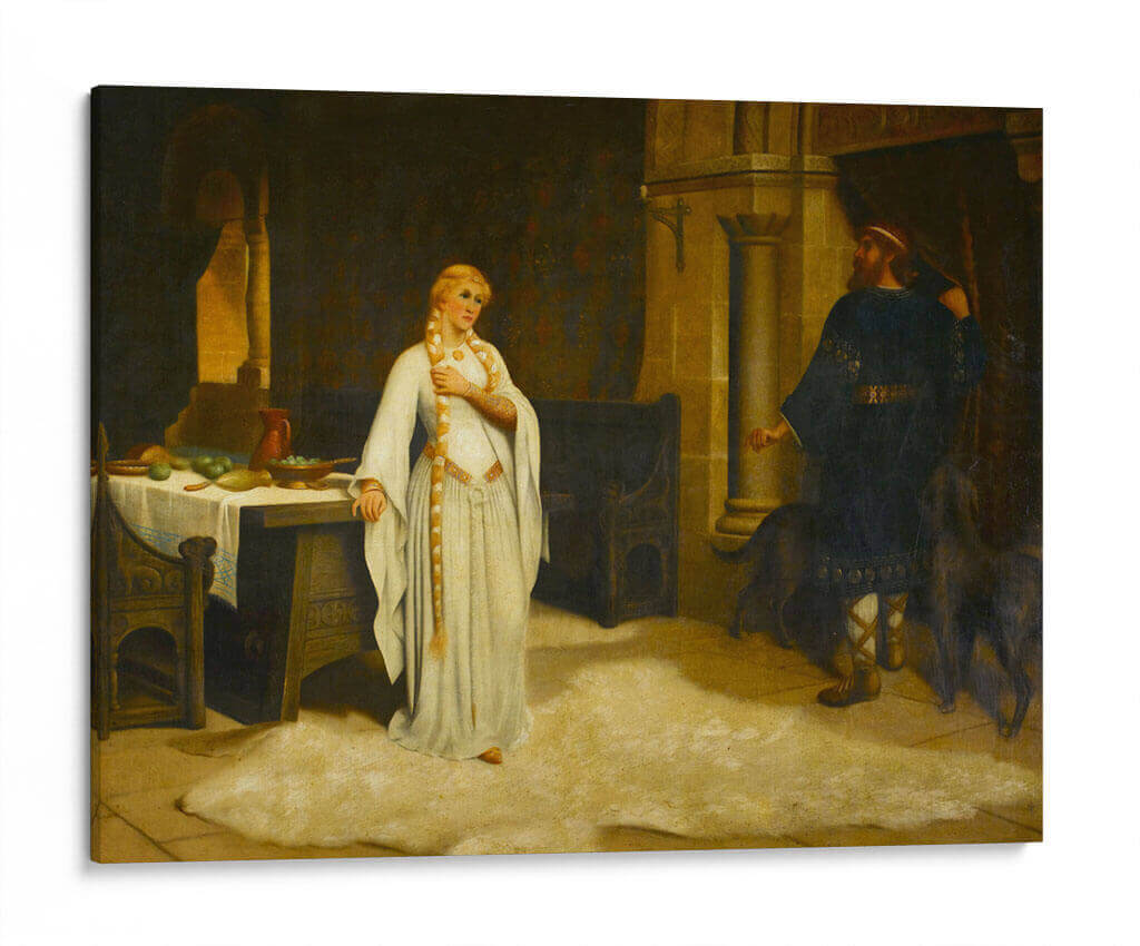 Sumérgete en la narrativa histórica de "Lady Godiva" de Edmund Leighton, una obra maestra que captura un momento de profunda introspección y desafío. La pintura presenta a una figura femenina etérea, vestida con una túnica blanca que fluye, adornada con detalles dorados, y su larga trenza rubia cayendo elegantemente. Se encuentra en un interior ricamente detallado, evocando una atmósfera de la época medieval o renacentista, con una mesa cargada de frutas y un hombre de pie con vestimenta oscura al fondo, acompañado por dos perros. La paleta de colores, dominada por tonos cálidos y terrosos, junto con contrastes de luz y sombra, crea una sensación de intimidad y dramatismo. El estilo realista de Leighton da vida a la escena, invitando al espectador a reflexionar sobre la historia detrás de esta icónica figura. Esta pieza es ideal para añadir un toque de elegancia clásica y un punto de conversación a salones, estudios o comedores, fusionando arte histórico con decoración contemporánea.