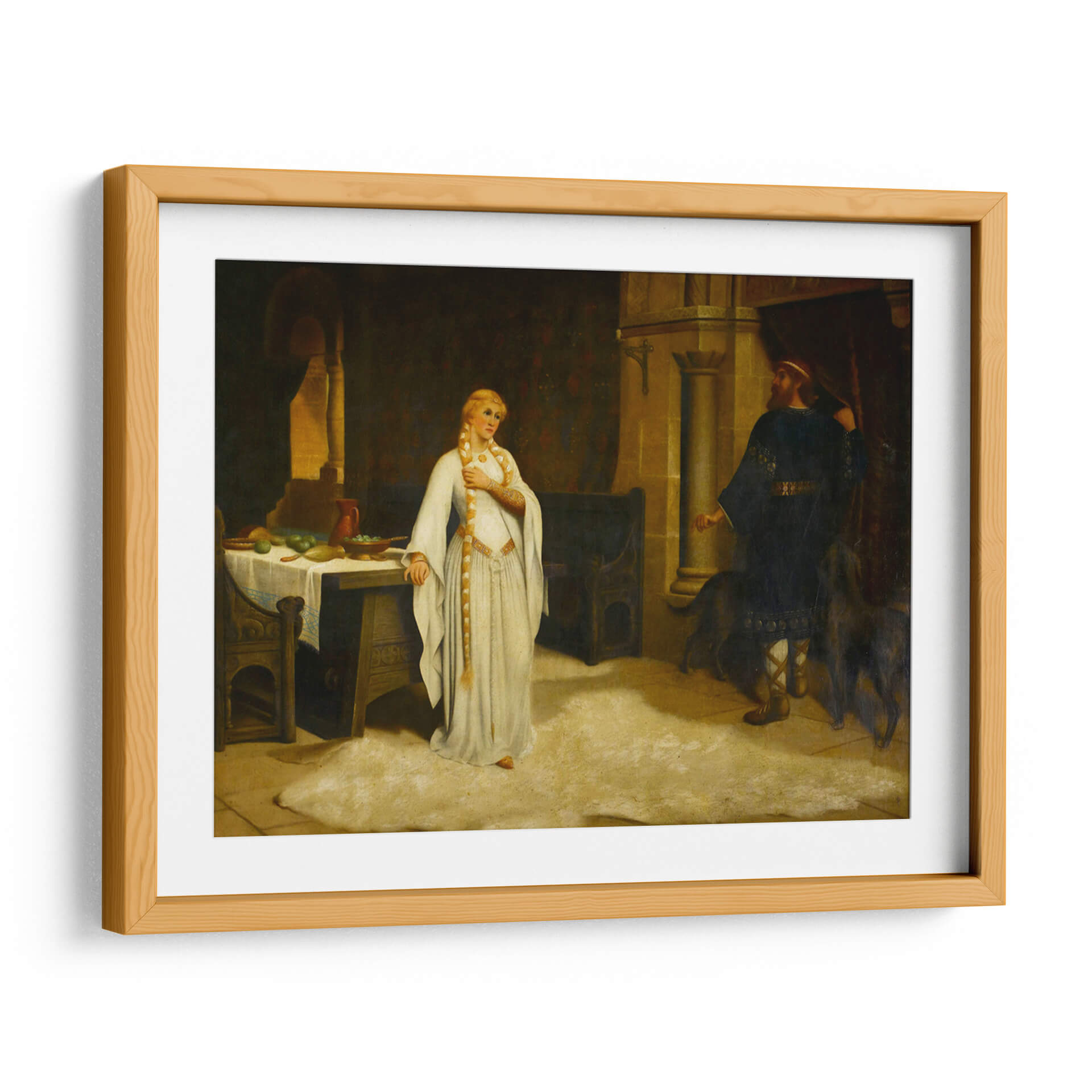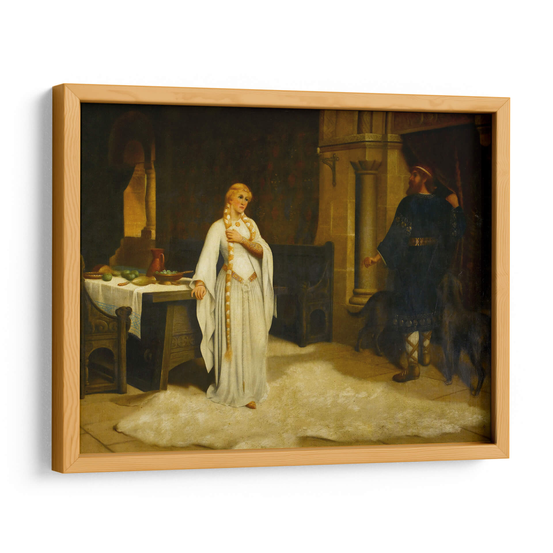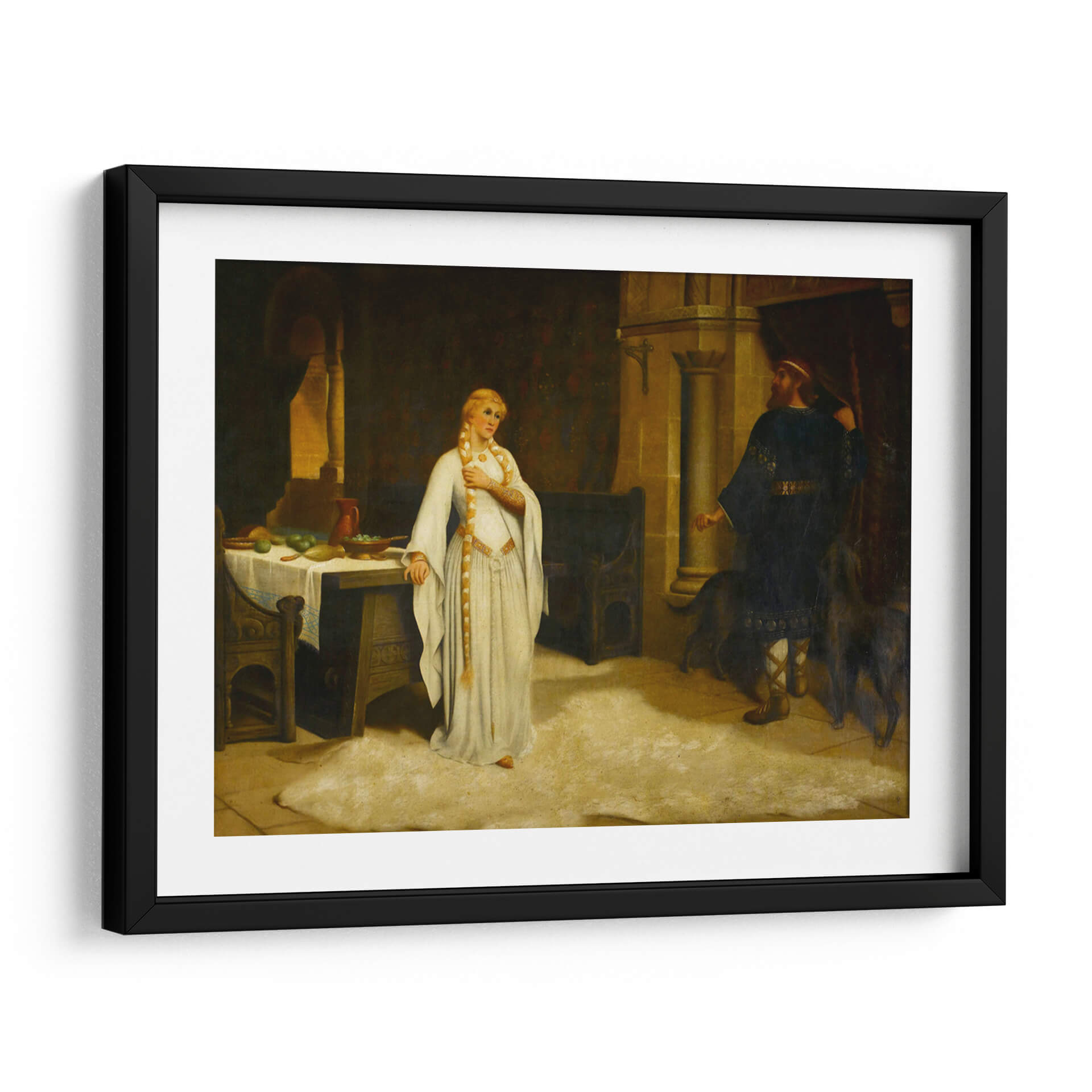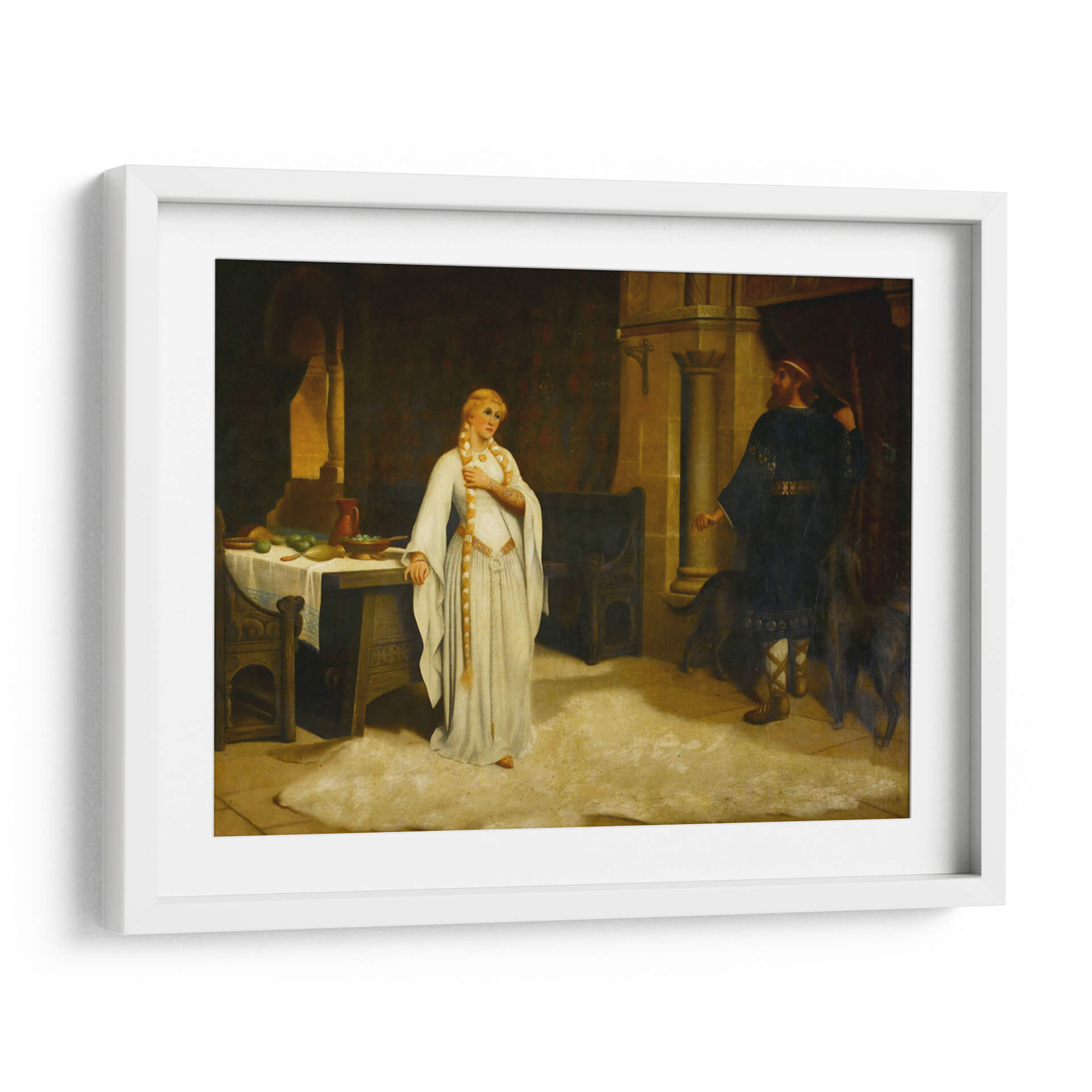 Sumérgete en la narrativa histórica de "Lady Godiva" de Edmund Leighton, una obra maestra que captura un momento de profunda introspección y desafío. La pintura presenta a una figura femenina etérea, vestida con una túnica blanca que fluye, adornada con detalles dorados, y su larga trenza rubia cayendo elegantemente. Se encuentra en un interior ricamente detallado, evocando una atmósfera de la época medieval o renacentista, con una mesa cargada de frutas y un hombre de pie con vestimenta oscura al fondo, acompañado por dos perros. La paleta de colores, dominada por tonos cálidos y terrosos, junto con contrastes de luz y sombra, crea una sensación de intimidad y dramatismo. El estilo realista de Leighton da vida a la escena, invitando al espectador a reflexionar sobre la historia detrás de esta icónica figura. Esta pieza es ideal para añadir un toque de elegancia clásica y un punto de conversación a salones, estudios o comedores, fusionando arte histórico con decoración contemporánea.