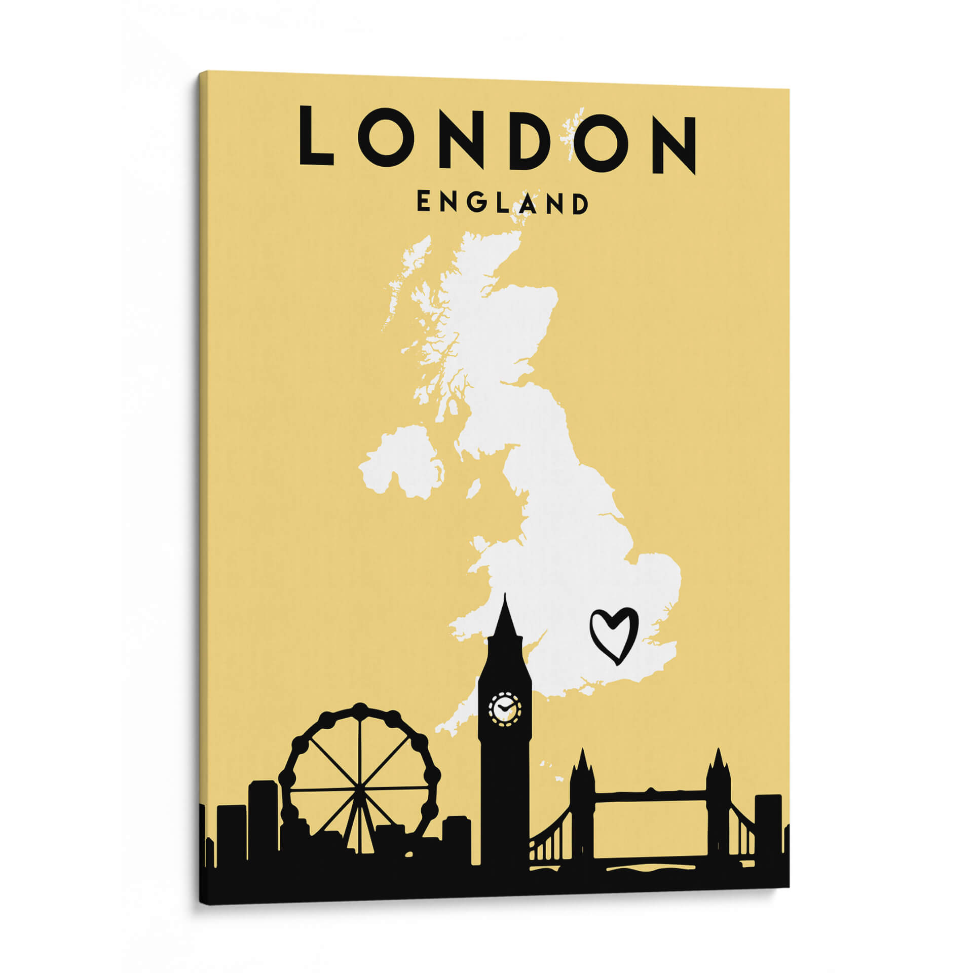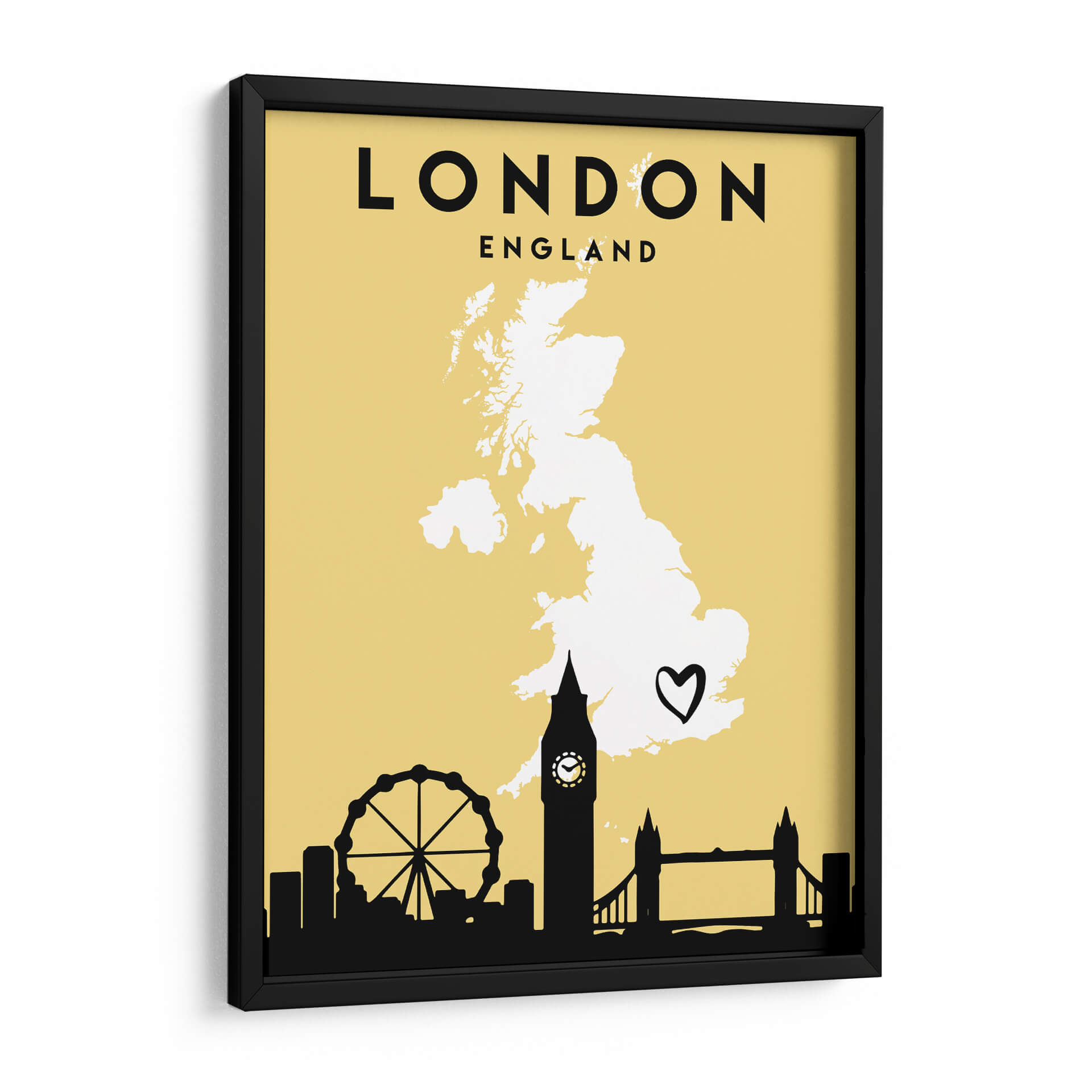 Sumérgete en el encanto de la capital británica con este evocador cuadro decorativo de Londres. La obra, titulada 'Londres, Inglaterra - Mapas de amor de la ciudad 41' por Emiliano Deificus, captura la esencia de esta metrópoli icónica a través de un diseño estilizado y moderno. El fondo en tono ocre cálido crea una atmósfera acogedora, mientras que las siluetas en negro de monumentos emblemáticos como el Big Ben, el London Eye y el Tower Bridge, junto con un mapa estilizado del Reino Unido que destaca un corazón sobre Londres, dan vida a la composición. Este cuadro minimalista es perfecto para quienes desean añadir un toque de sofisticación y personalidad a sus espacios. Ideal para salones modernos, oficinas o como un recordatorio de viajes inolvidables, esta pieza añade un aire de aventura y romance urbano. Su diseño limpio y los colores contrastantes aseguran que sea un punto focal atractivo en cualquier habitación, inspirando conversaciones y evocando recuerdos o sueños de explorar la vibrante ciudad de Londres. Transforma tu hogar u oficina con este diseño único que celebra el espíritu de una de las ciudades más fascinantes del mundo, un testimonio del arte contemporáneo y el diseño gráfico.