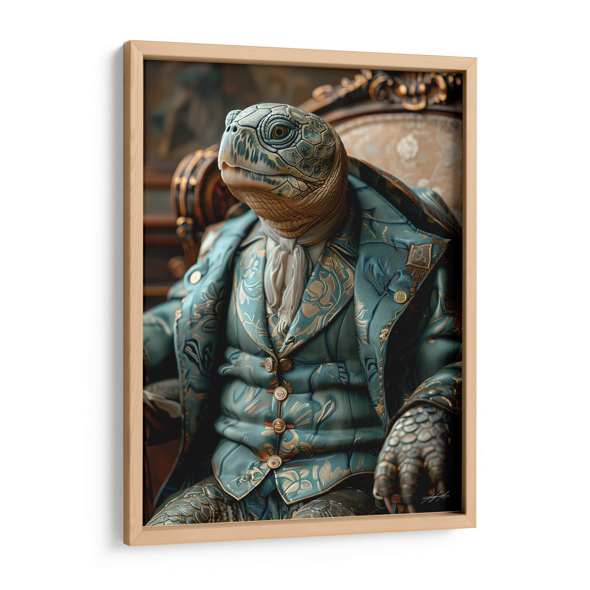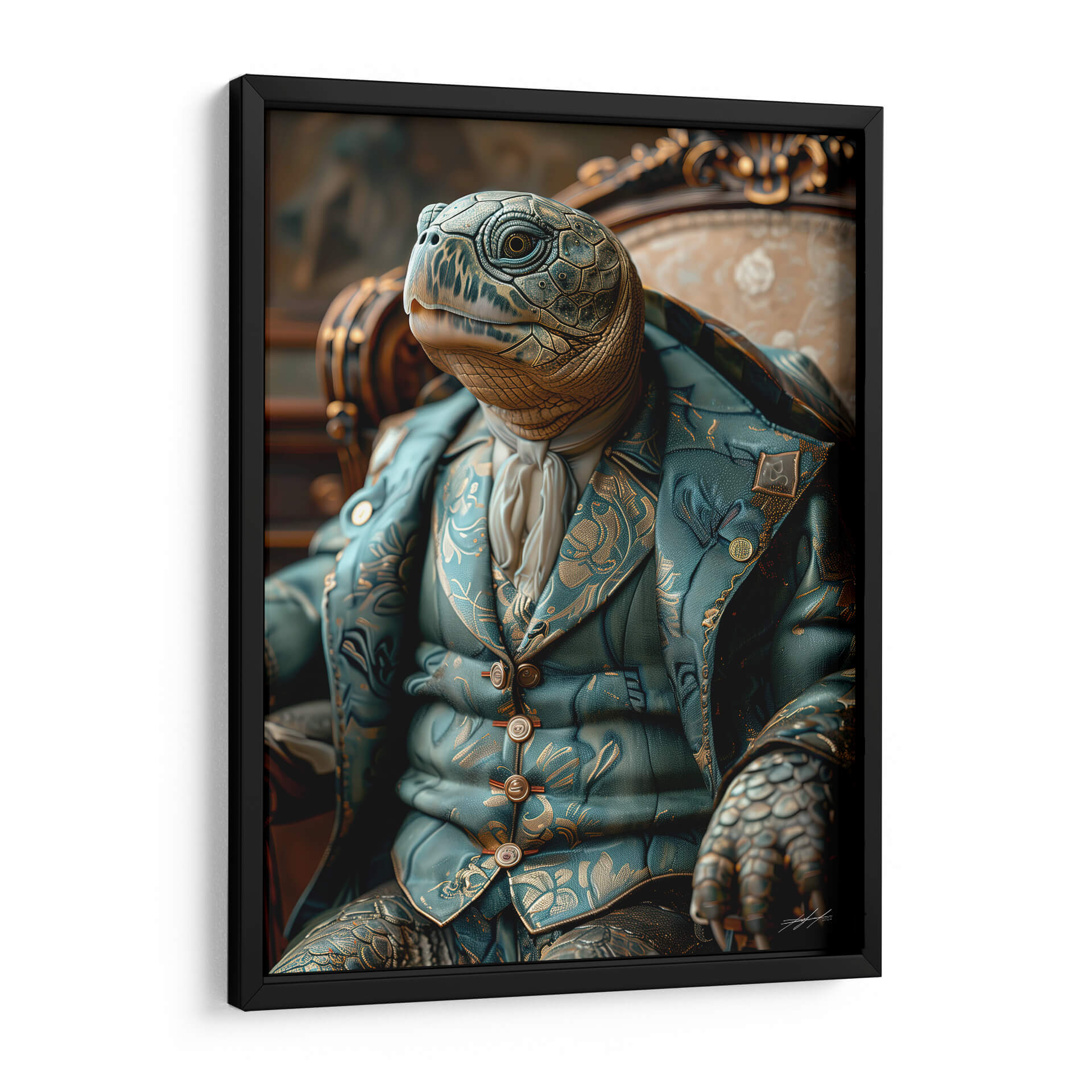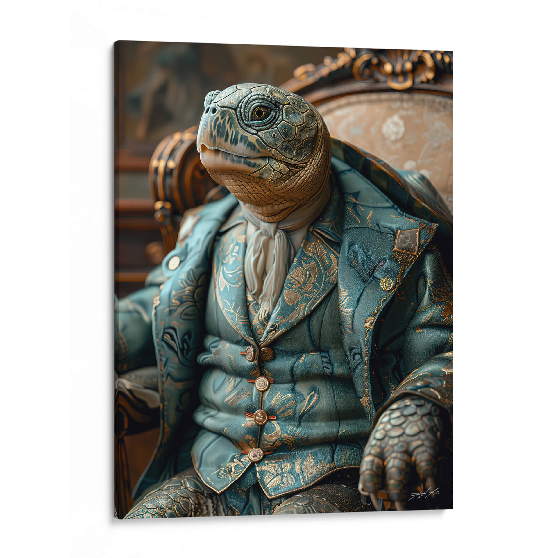 Sumérgete en el mundo surrealista de "Los Nuevos Reyes" de DeLaVegaGaming, una obra de arte digital que desafía las convenciones y captura la imaginación. Este cuadro decorativo presenta una tortuga antropomórfica vestida con un elegante traje de época, sentada con porte majestuoso en un sillón ornamentado. La paleta de colores, dominada por ricos tonos de verde azulado y dorados intrincados en el traje, evoca una sensación de opulencia y misterio. La detallada textura de las escamas de la tortuga contrasta con la suavidad de la seda de su atuendo, creando una pieza visualmente cautivadora. El fondo, con su iluminación tenue y detalles sutiles, añade profundidad y un aire de intriga, sugiriendo una narrativa oculta. Este cuadro decorativo es perfecto para aquellos que buscan añadir un toque de originalidad, humor y sofisticación a su hogar u oficina. Ideal para salas de estar, estudios o cualquier espacio que se beneficie de una pieza de conversación única y memorable. "Los Nuevos Reyes" no es solo una decoración, es una declaración de estilo y una invitación a contemplar lo inesperado en el arte contemporáneo.