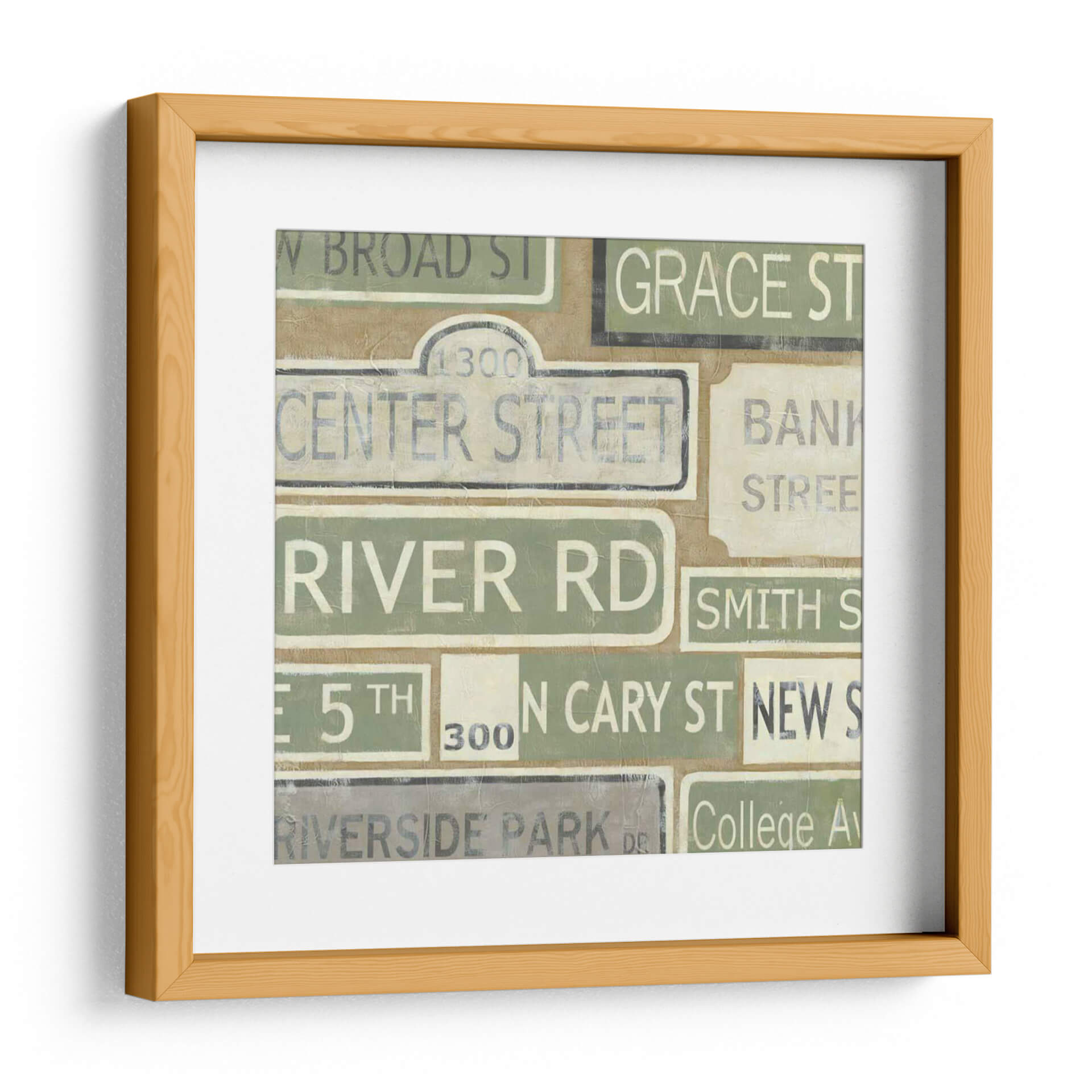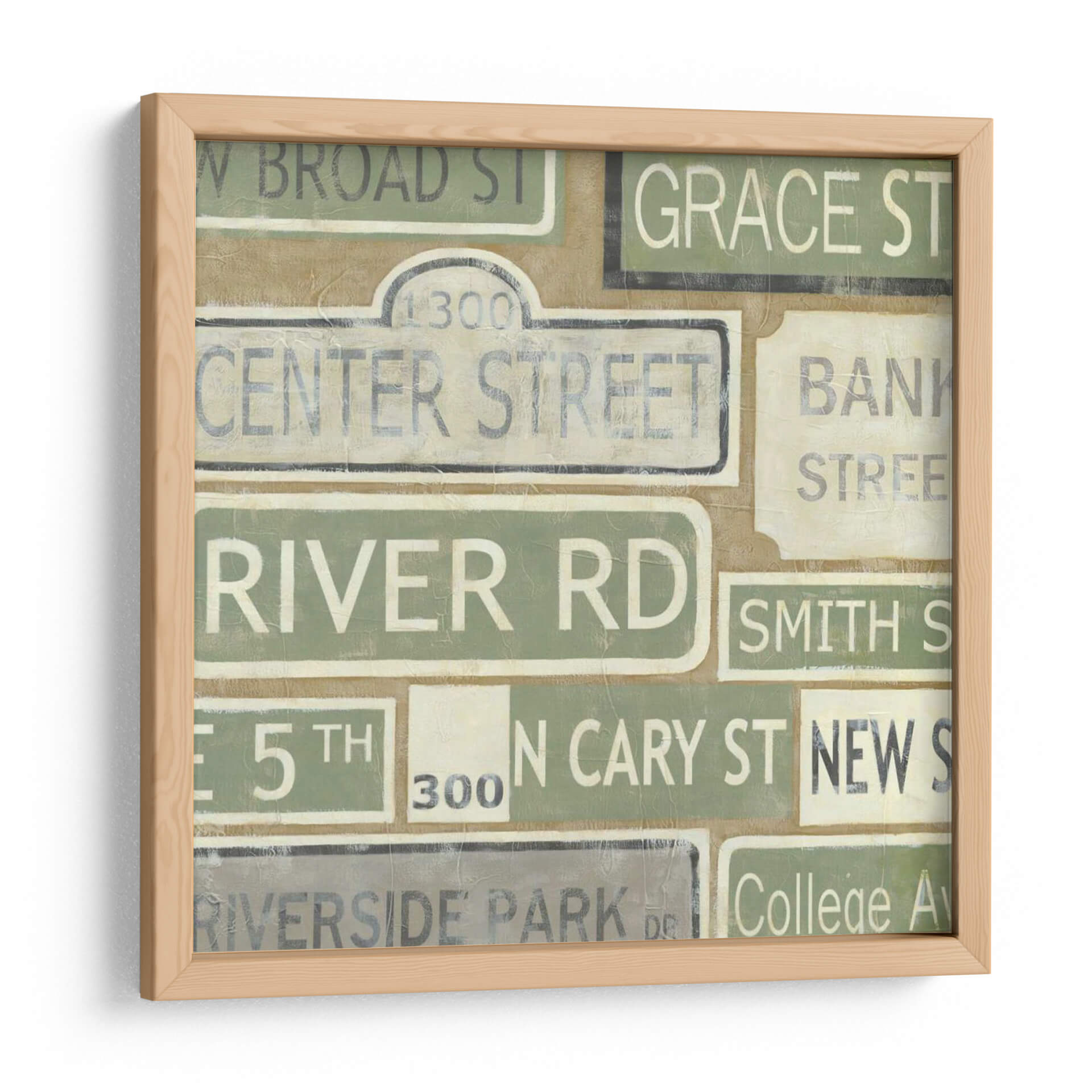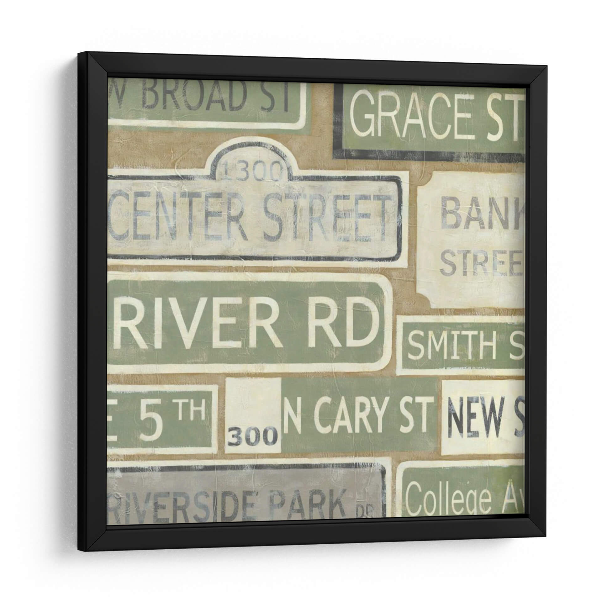 Este cuadro decorativo "Main Street Usa Ii" de Chariklia Zarris evoca una nostálgica y encantadora atmósfera urbana. La obra presenta una composición superpuesta de nombres de calles y números, reminiscente de los letreros de una ciudad estadounidense. Predominan los tonos tierra y verdes apagados, creando una paleta de colores suave y terrosa que aporta calidez y un aire vintage a cualquier espacio. La técnica y el estilo sugieren una estética contemporánea con un toque rústico, ideal para aquellos que aprecian el diseño urbano y las referencias geográficas con un enfoque artístico. Los nombres de calles como "Broad St", "Grace St", "Center Street", "River Rd", y "College Av" añaden un carácter distintivo y narrativo a la pieza, invitando a la contemplación y al recuerdo. Este cuadro decorativo es perfecto para añadir un punto de interés visual y una sensación de familiaridad a salas de estar, estudios u oficinas, funcionando como un acento sofisticado y con carácter. Su diseño versátil se adapta a decoraciones modernas, rústicas o industriales, aportando un toque de autenticidad y estilo.