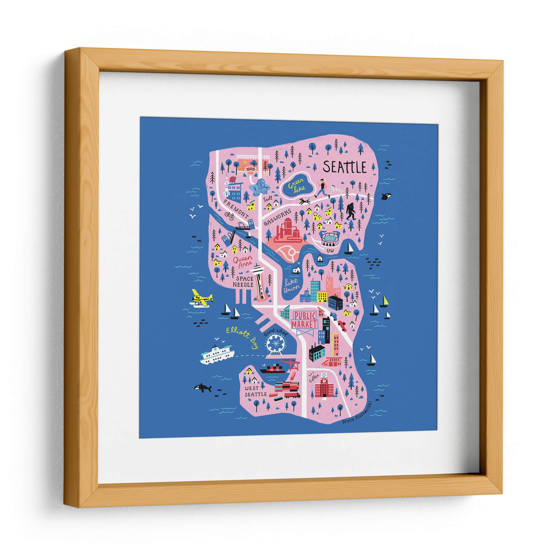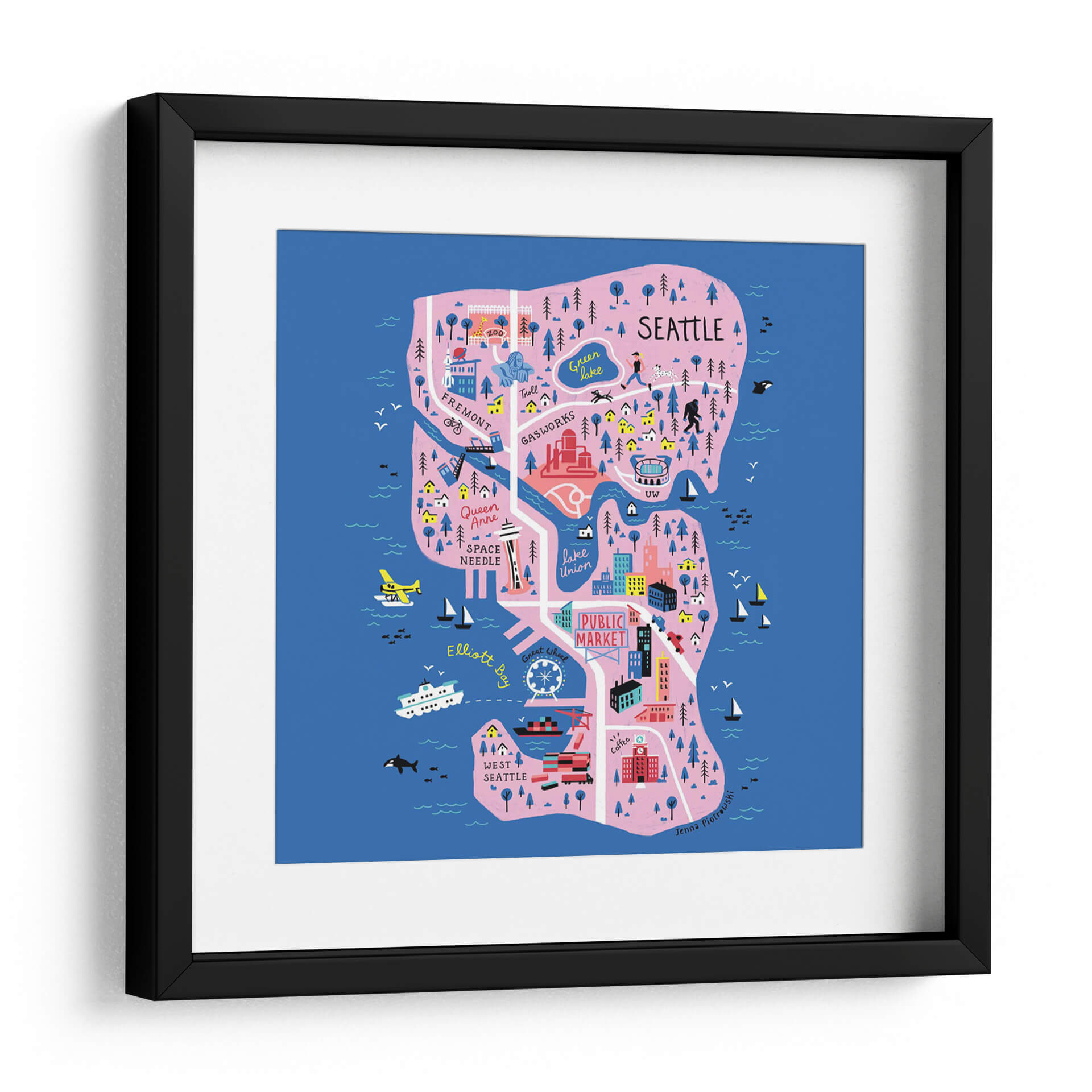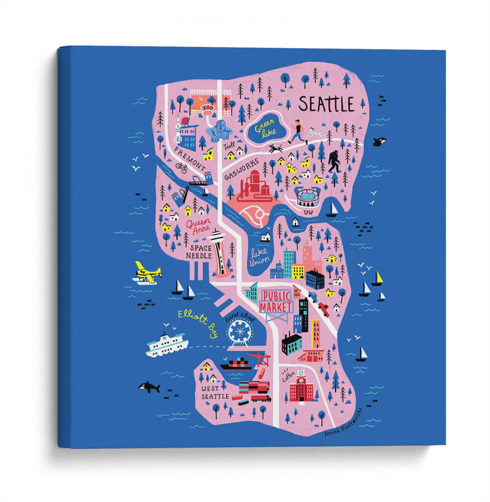 Descubre la vibrante esencia de Seattle con este encantador mapa ilustrado, una obra de arte decorativa que captura la energía y los puntos de interés icónicos de la ciudad. Los colores vivos, dominados por el azul profundo del océano y los tonos rosados y verdes de la tierra, crean una atmósfera alegre y acogedora. Cada detalle, desde el Space Needle hasta el bullicioso Pike Place Market, pasando por el lago Union y el icónico Fremont Troll, está representado con un estilo artístico distintivo y juguetón. Este cuadro es ideal para añadir un toque de personalidad y color a cualquier espacio, ya sea una sala de estar moderna, una oficina con carácter o un dormitorio acogedor. Su diseño único lo convierte en un excelente tema de conversación y una forma fantástica de celebrar el amor por Seattle o de traer un pedazo de esta dinámica ciudad a tu hogar. Perfecto para amantes de los mapas, viajeros o cualquiera que aprecie el arte contemporáneo con un toque de fantasía.
