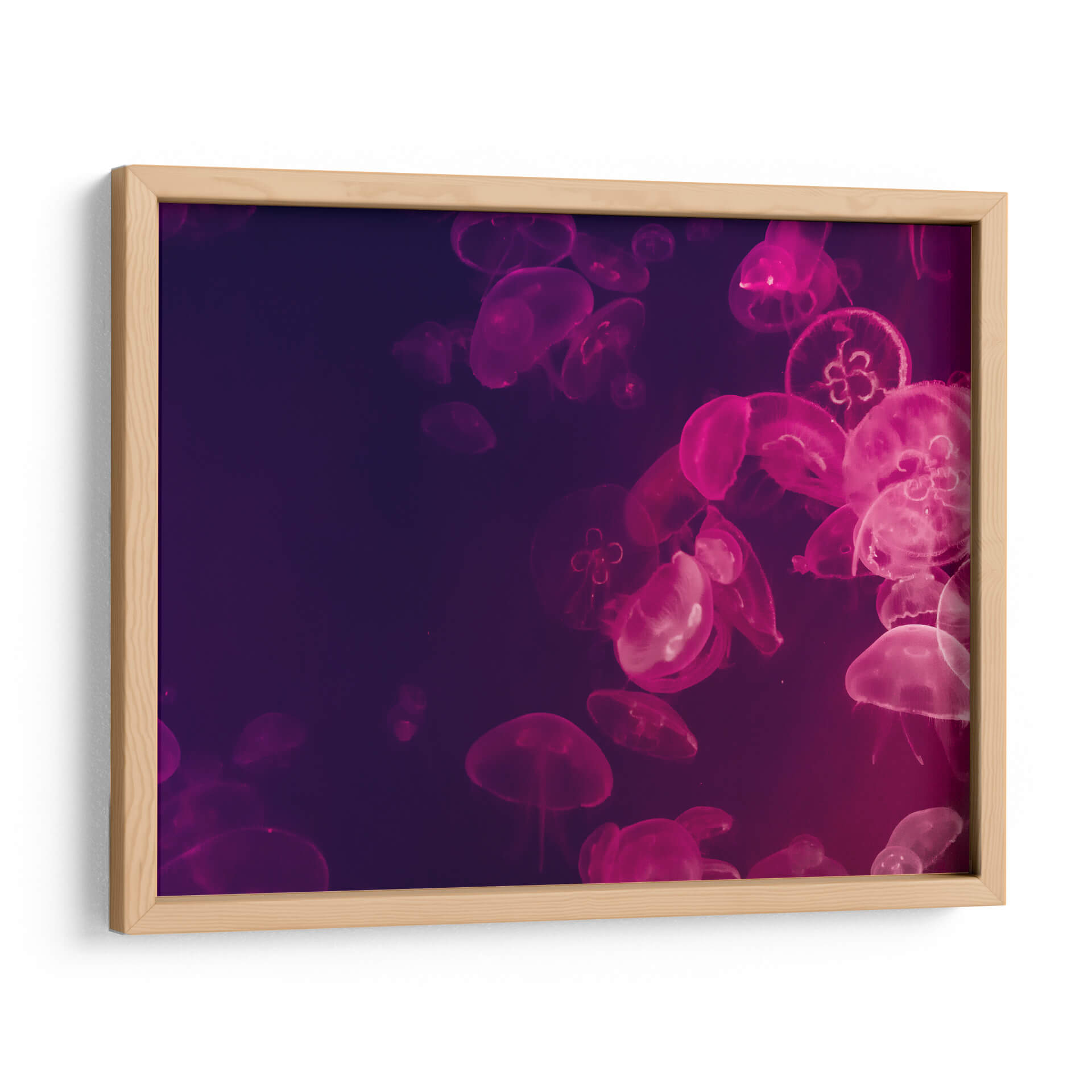 Sumérgete en la etérea belleza del océano con esta cautivadora obra de arte de "Medusas Moradas". La pieza presenta un vibrante cardumen de medusas bioluminiscentes, bañadas en tonos profundos de púrpura y magenta, que parecen flotar sin esfuerzo en la oscuridad acuática. La composición destaca la delicada y translúcida naturaleza de estas criaturas marinas, con sus tentáculos extendiéndose suavemente. Cada medusa irradia una luz suave y etérea, creando una atmósfera de misterio y serenidad. La paleta de colores, dominada por púrpuras intensos y rosas eléctricos, evoca una sensación de calma profunda y maravilla natural. Este lienzo es una adición perfecta para aquellos que buscan infundir sus espacios con un toque de la magia del mundo submarino, ideal para salas de estar, dormitorios o incluso oficinas que desean un ambiente relajante y sofisticado. Transforma tu hogar en un santuario de paz y belleza con esta representación hipnotizante de la vida marina.