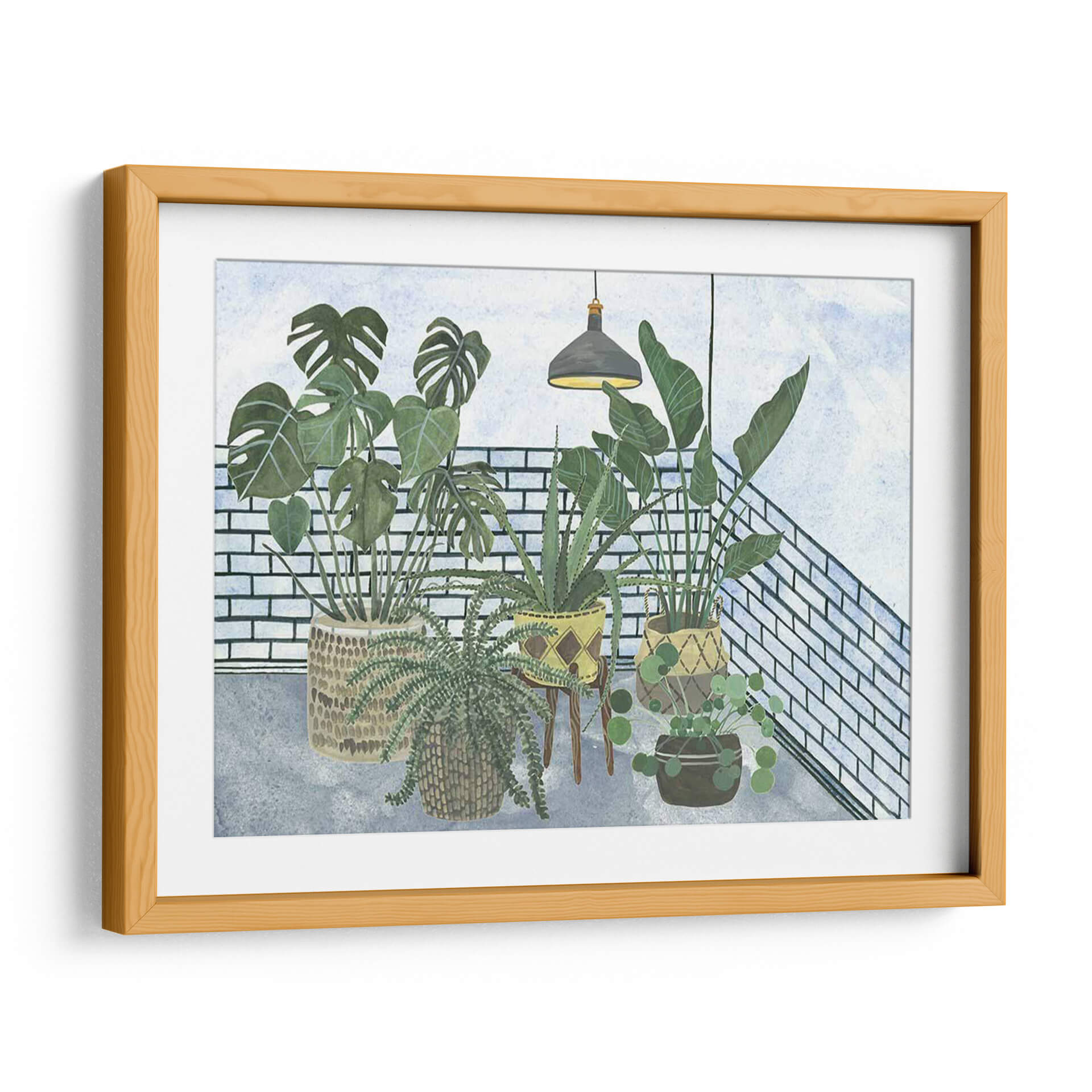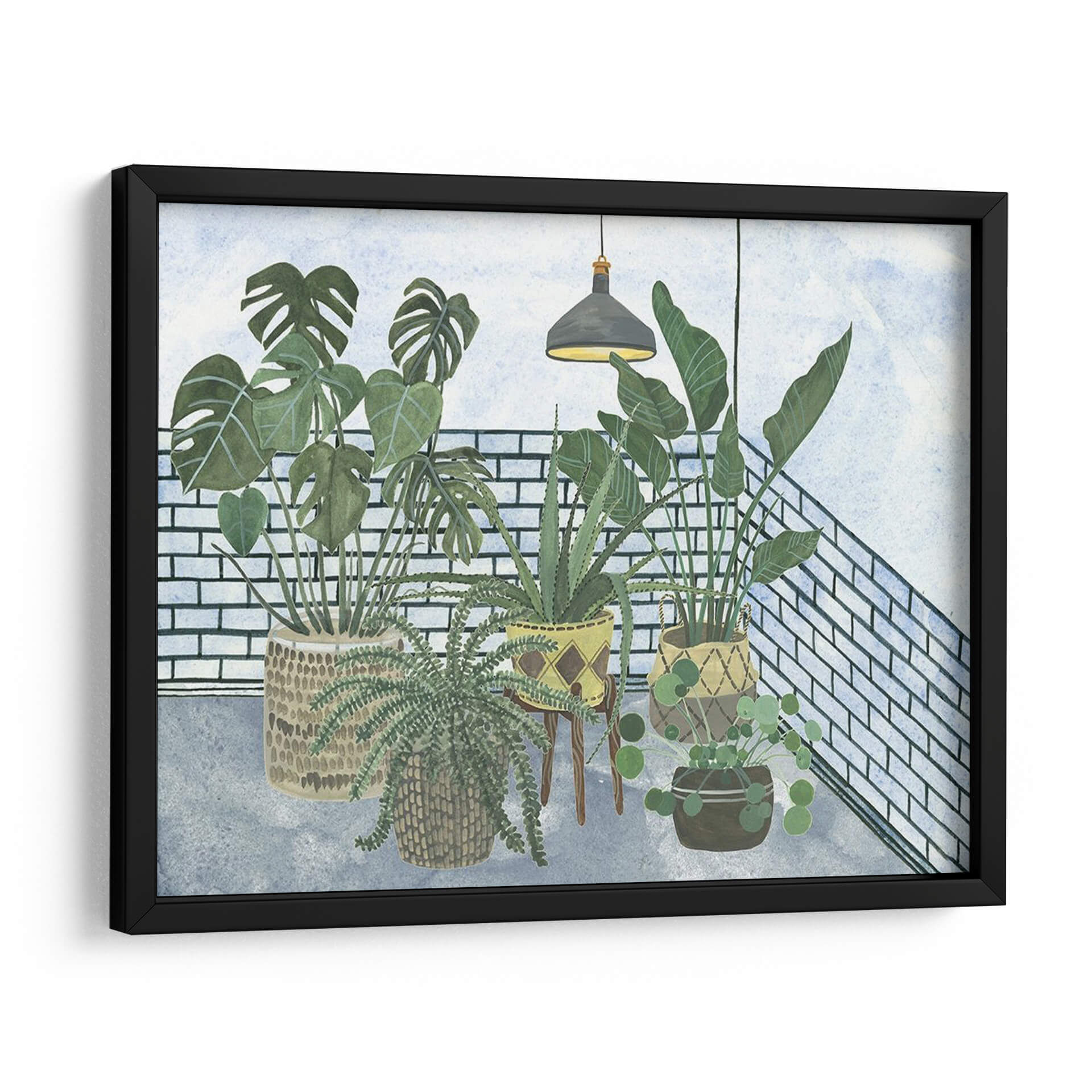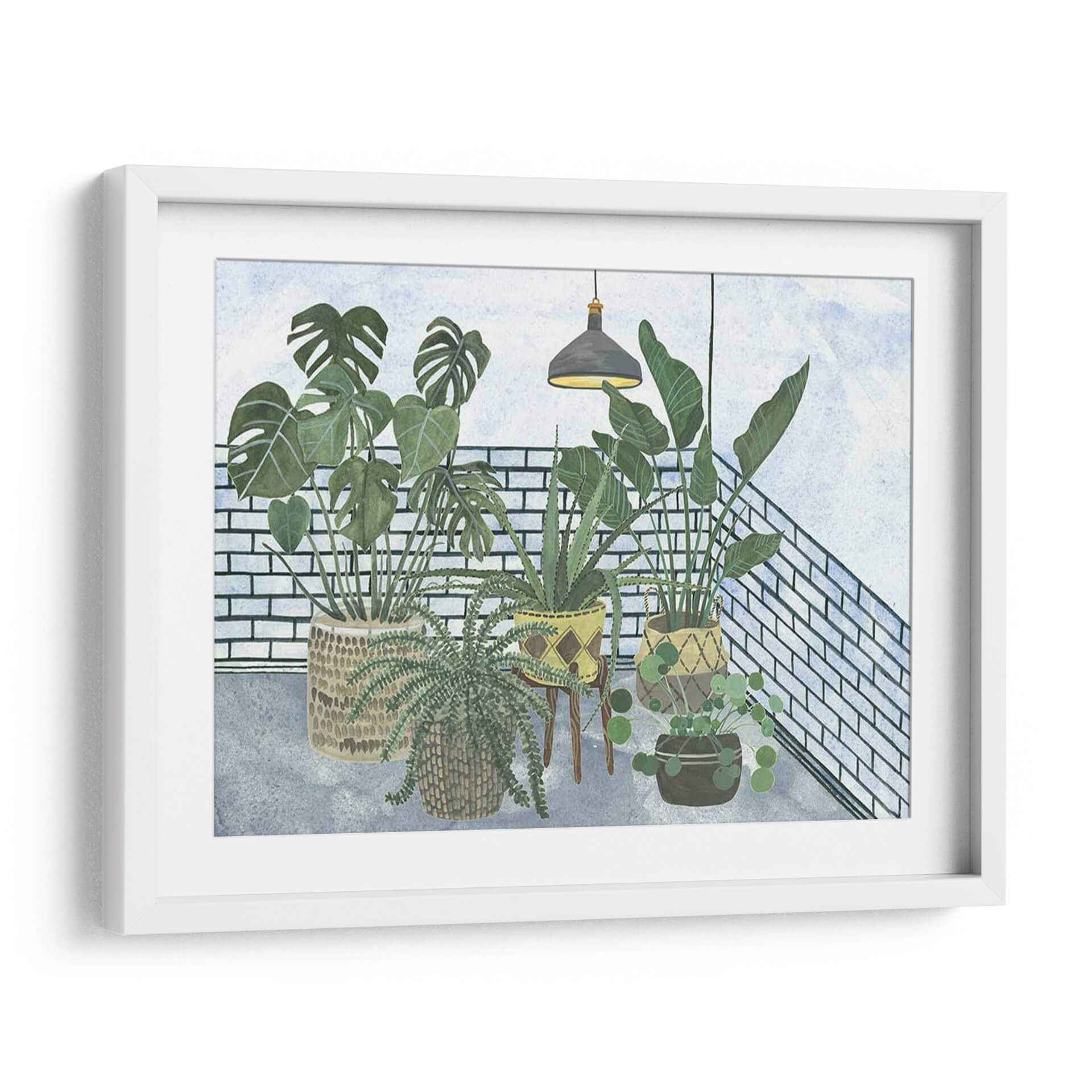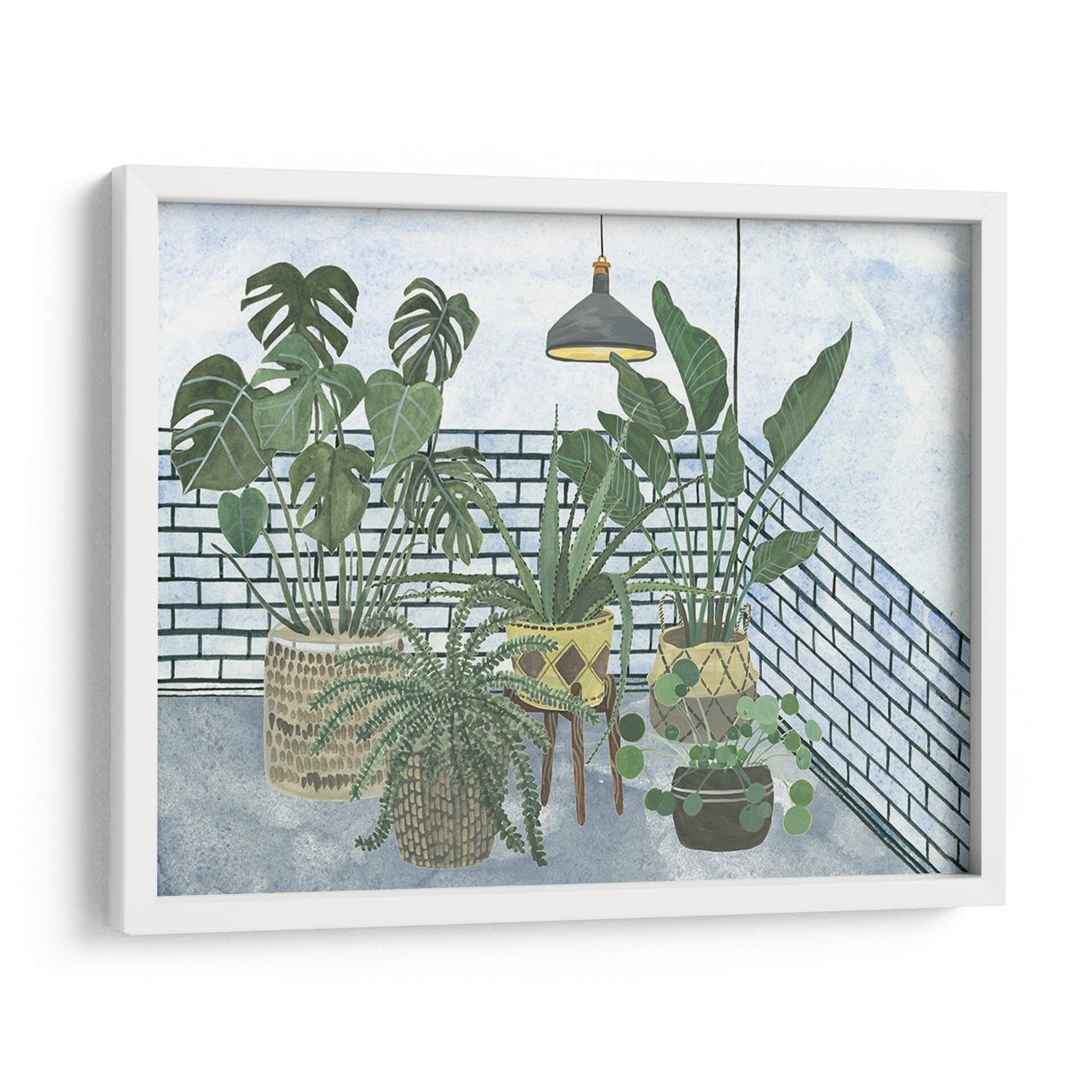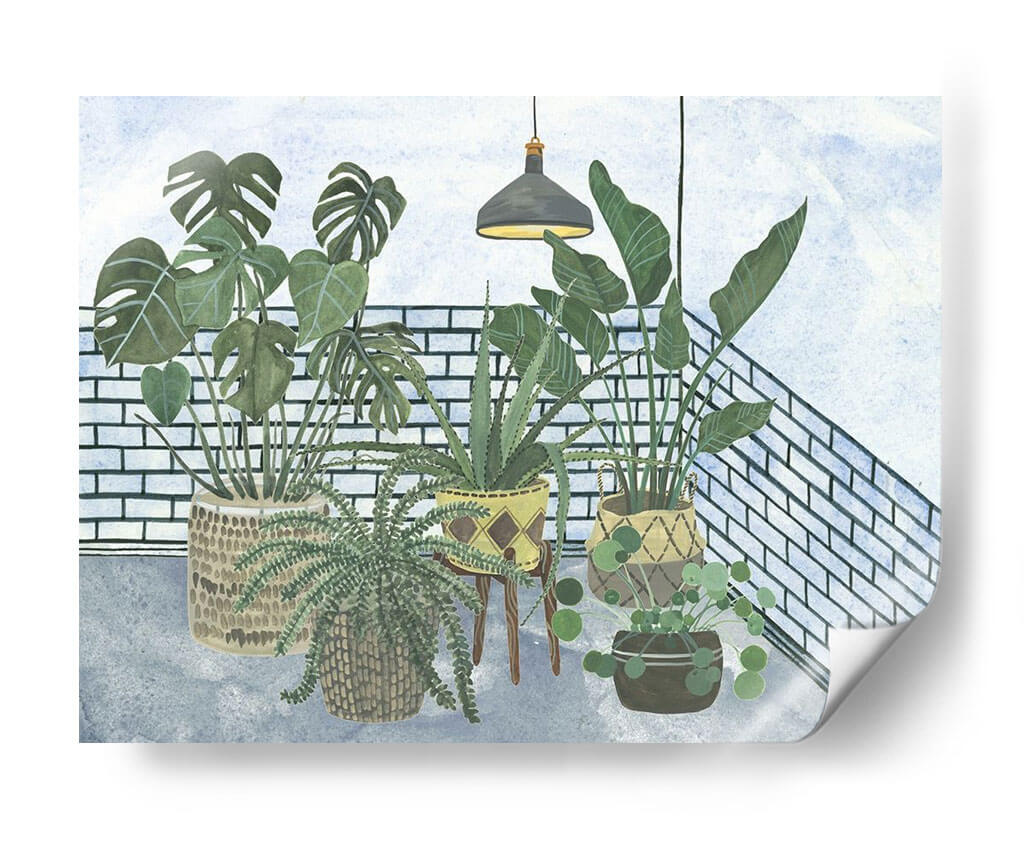 Embellece tu hogar con "Mes Stules Colección A", una cautivadora obra de arte digital de Melissa Wang. Esta pieza evoca la serenidad de un rincón botánico, presentando una cuidada selección de plantas de interior dispuestas con armonía. Los verdes vibrantes de las hojas contrastan sutilmente con la textura de los ladrillos blancos y el suelo de cemento grisáceo, creando una atmósfera acogedora y relajante. La iluminación tenue de una lámpara colgante añade un toque de intimidad y calidez a la escena. El estilo, que combina elementos realistas con una delicadeza acuarelada, permite que la obra encaje perfectamente en decoraciones contemporáneas, bohemias o de estilo escandinavo. Ideal para añadir vida y frescura a tu salón, dormitorio, estudio u oficina, este cuadro decorativo invita a la contemplación y al bienestar. Descubre cómo esta composición de flora interior puede transformar tu espacio, aportando un oasis de calma y naturaleza en cualquier rincón. "Mes Stules Colección A" es más que una simple decoración; es una ventana a la tranquilidad.