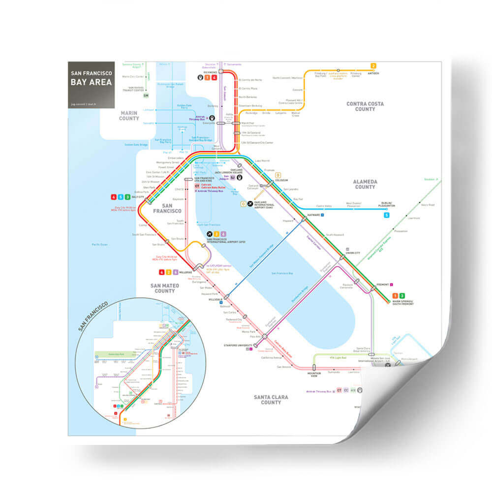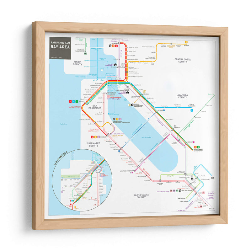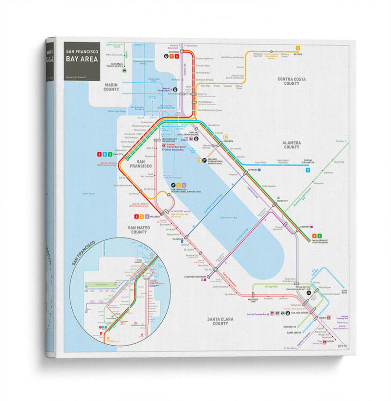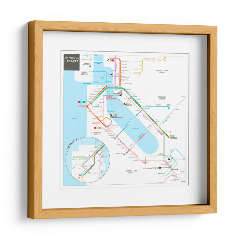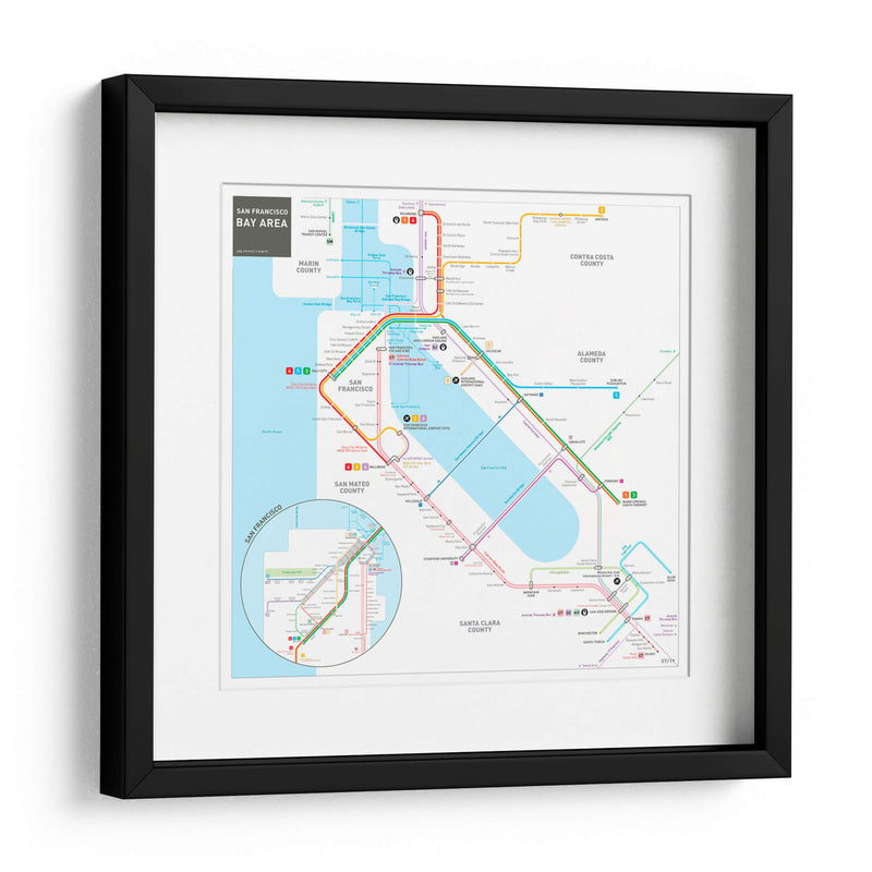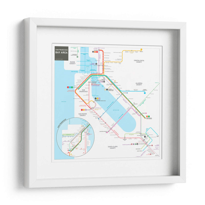 Embárcate en un viaje visual a través de la vibrante metrópoli de San Francisco y su área metropolitana con este detallado cuadro decorativo. La obra, inspirada en el icónico mapa del sistema de transporte público, presenta una intrincada red de líneas de colores que representan las rutas de metro, autobuses y trenes, conectando puntos clave como el centro de San Francisco, el aeropuerto internacional y extendiéndose hacia condados vecinos como Marin, San Mateo, Alameda y Santa Clara. Los colores vivos y contrastantes de las distintas líneas (rojo, azul, verde, morado, naranja) no solo guían la mirada del espectador, sino que también añaden un toque de energía y dinamismo al diseño. La composición, aunque funcional en su origen como mapa, se transforma en una pieza de arte abstracto y geométrico, perfecta para añadir un toque moderno y urbano a cualquier espacio. Ideal para amantes de la geografía, viajeros empedernidos, o aquellos que buscan una pieza de conversación única para su hogar u oficina. Este cuadro decorativo es una excelente manera de celebrar la conectividad y la complejidad de una de las áreas urbanas más influyentes de California.