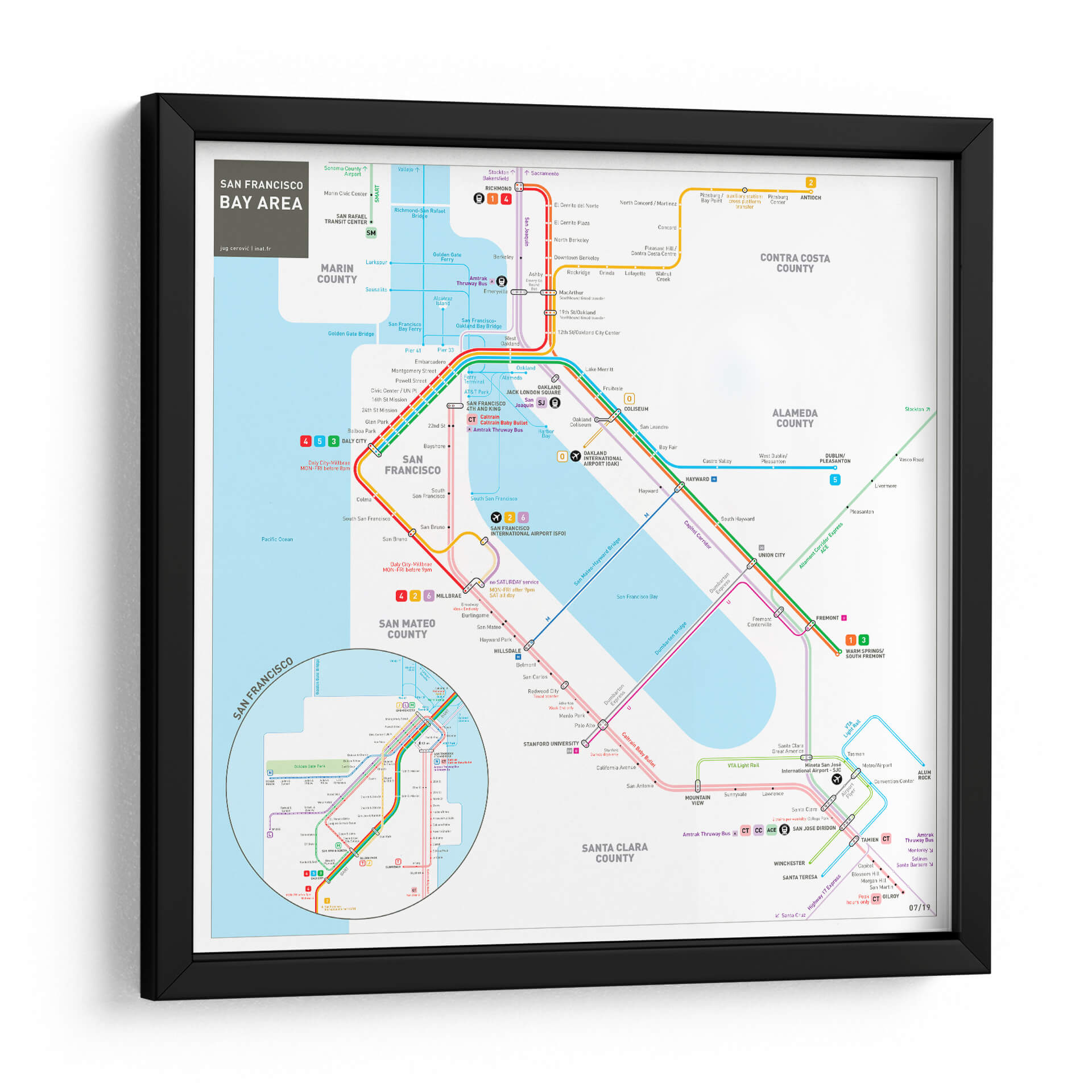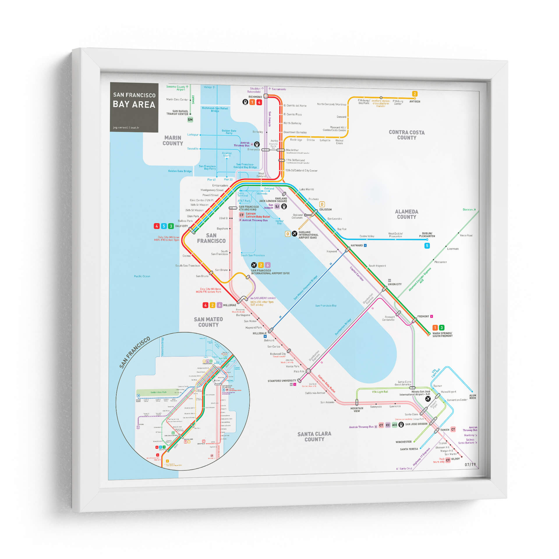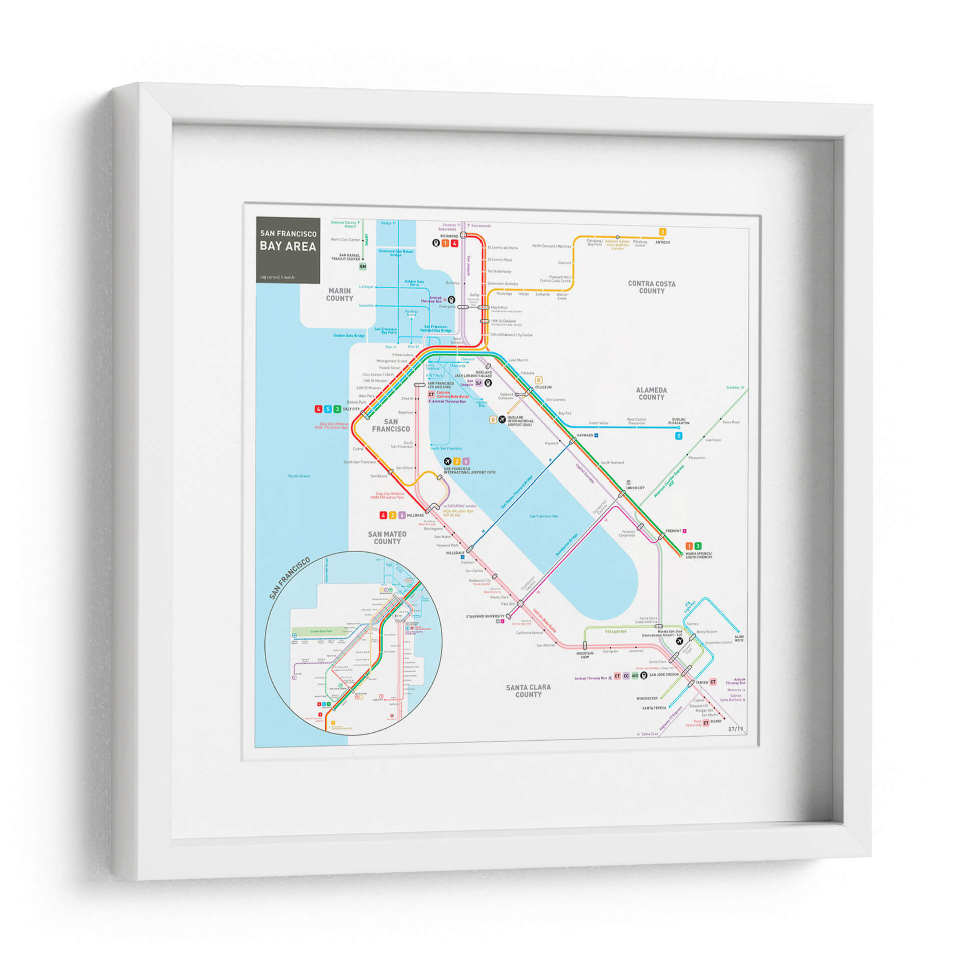 Embárcate en un viaje visual a través de la vibrante metrópoli de San Francisco y su área metropolitana con este detallado cuadro decorativo. La obra, inspirada en el icónico mapa del sistema de transporte público, presenta una intrincada red de líneas de colores que representan las rutas de metro, autobuses y trenes, conectando puntos clave como el centro de San Francisco, el aeropuerto internacional y extendiéndose hacia condados vecinos como Marin, San Mateo, Alameda y Santa Clara. Los colores vivos y contrastantes de las distintas líneas (rojo, azul, verde, morado, naranja) no solo guían la mirada del espectador, sino que también añaden un toque de energía y dinamismo al diseño. La composición, aunque funcional en su origen como mapa, se transforma en una pieza de arte abstracto y geométrico, perfecta para añadir un toque moderno y urbano a cualquier espacio. Ideal para amantes de la geografía, viajeros empedernidos, o aquellos que buscan una pieza de conversación única para su hogar u oficina. Este cuadro decorativo es una excelente manera de celebrar la conectividad y la complejidad de una de las áreas urbanas más influyentes de California.