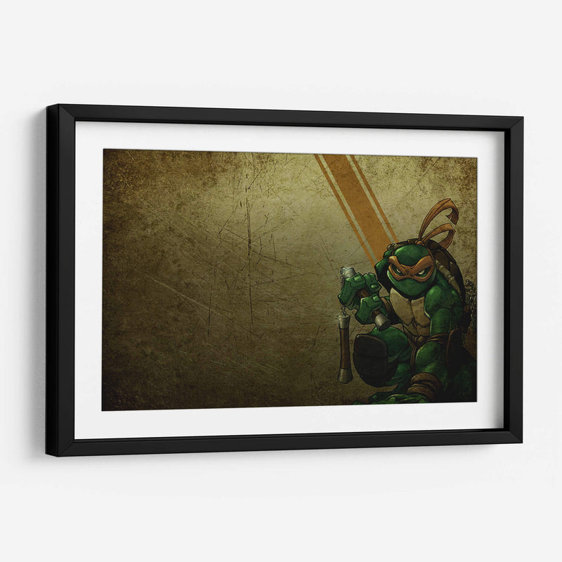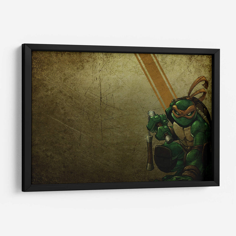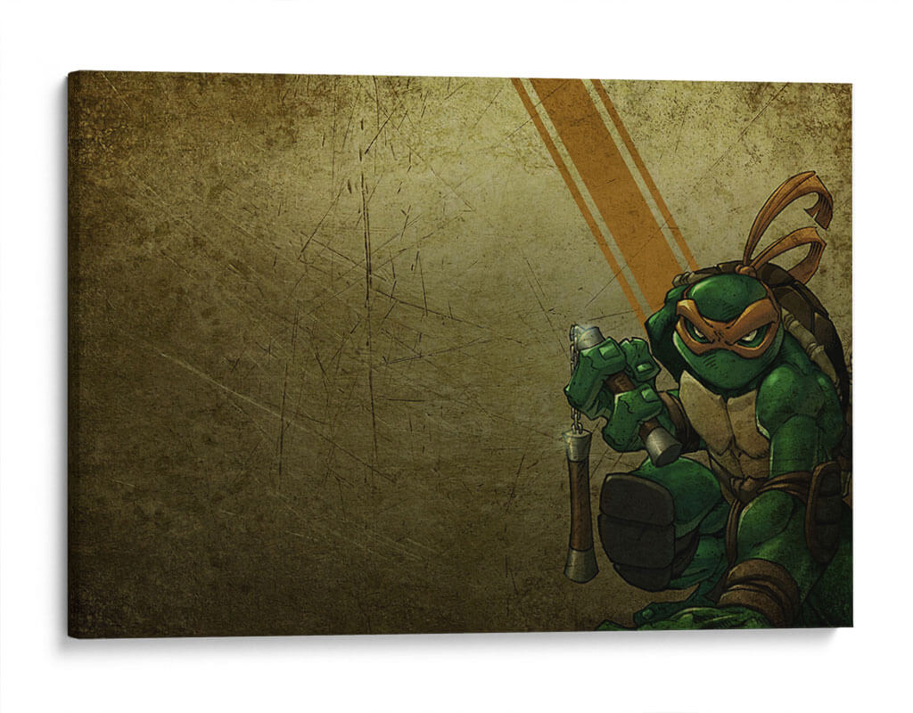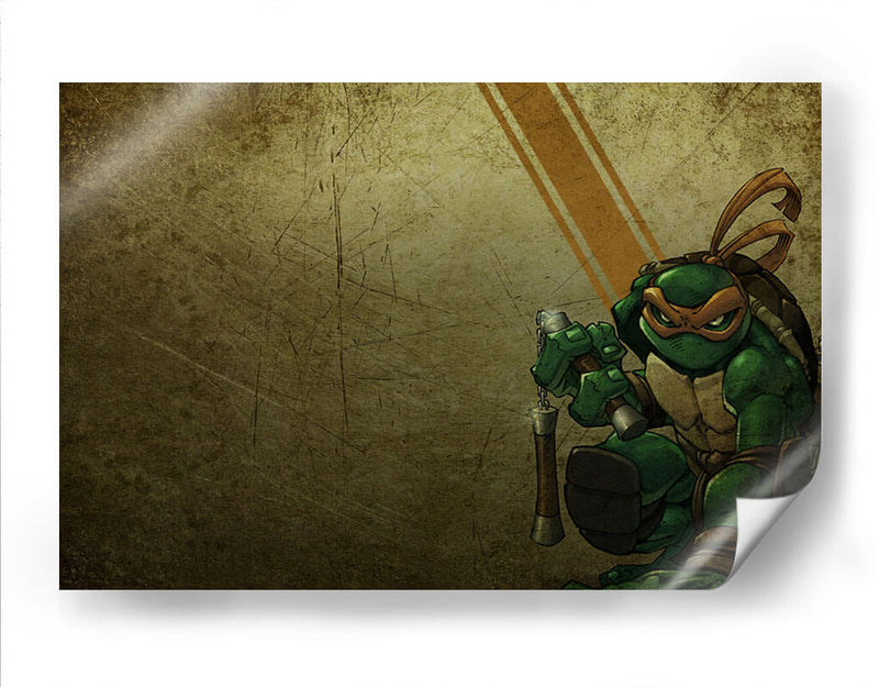 Sumérgete en el universo del cómic y la cultura pop con este impactante cuadro decorativo que captura la esencia de un icónico guerrero ninja. La obra presenta una figura estilizada y musculosa de una tortuga antropomórfica, vestida con su característico antifaz anaranjado y portando sus nunchakus listos para la acción. El fondo, con una textura desgastada y arañazos sutiles en tonos tierra y ocres, evoca una atmósfera de misterio y aventura, contrastando con la vibrante paleta de verdes y naranjas de la figura central. Las líneas dinámicas y la composición audaz sugieren movimiento y energía, haciendo de esta pieza un punto focal perfecto para cualquier espacio que busque un toque de rebeldía y nostalgia. Ideal para salas de estar, estudios o cuartos de juegos, este cuadro decorativo no solo embellece tu pared, sino que también evoca el espíritu de lucha y la camaradería de los héroes que marcaron una generación. Es una adición excepcional para los amantes del arte pop, los cómics y las series animadas que buscan una decoración audaz y llena de personalidad.