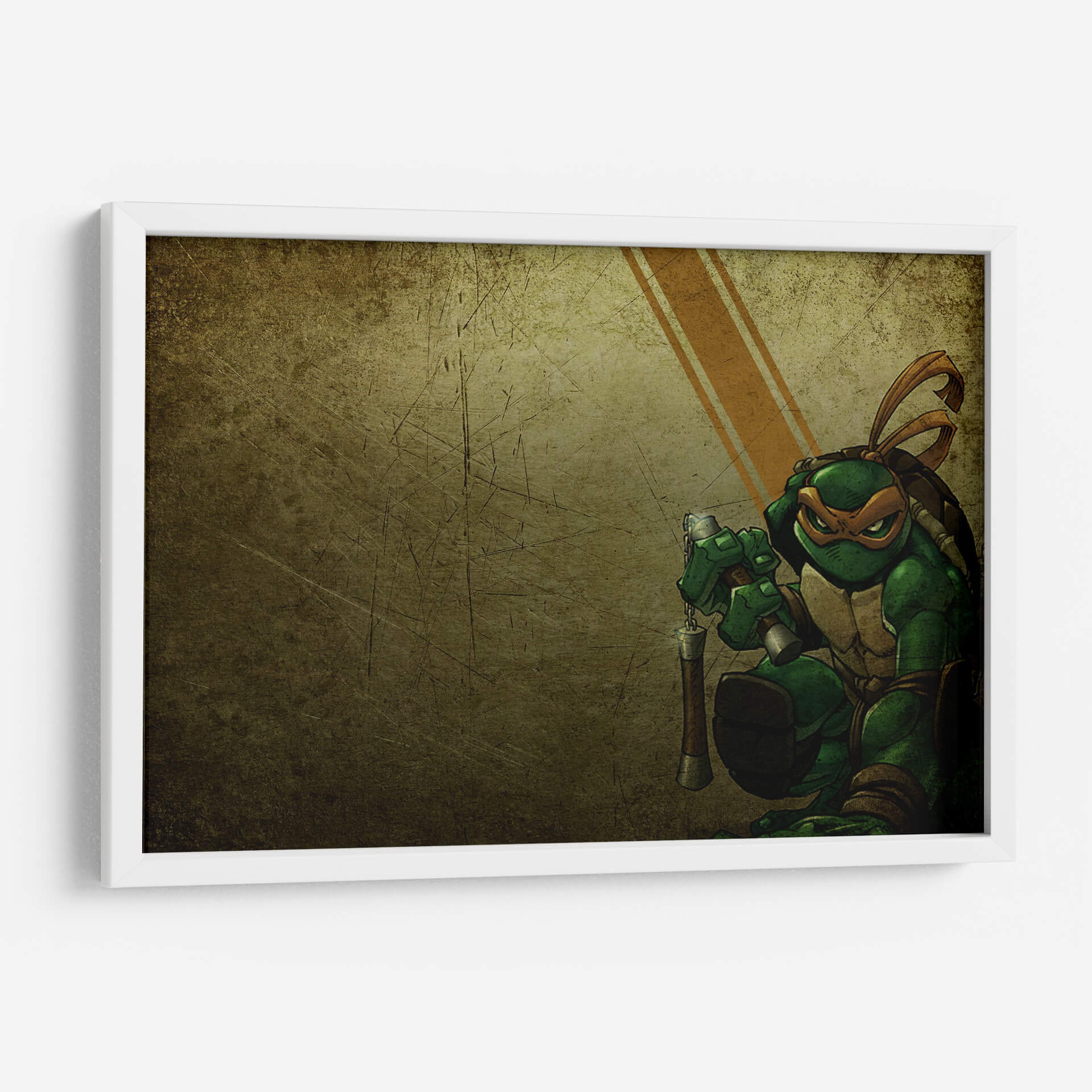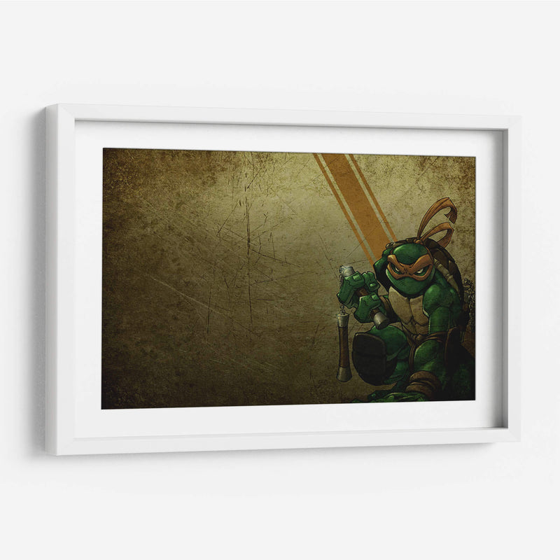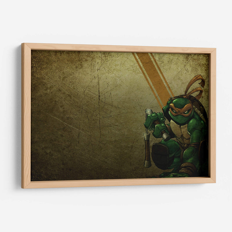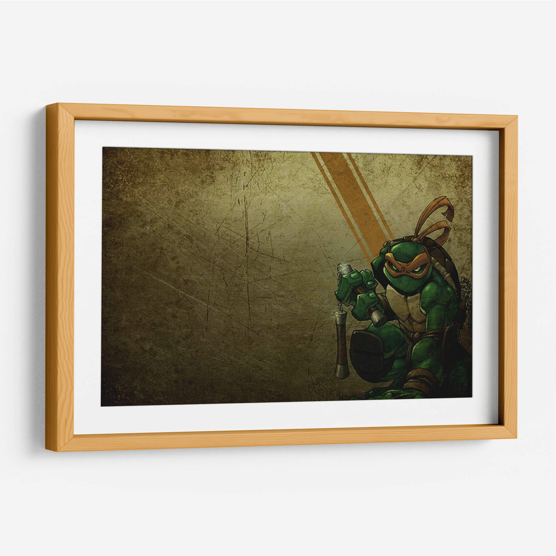 Sumérgete en el universo del cómic y la cultura pop con este impactante cuadro decorativo que captura la esencia de un icónico guerrero ninja. La obra presenta una figura estilizada y musculosa de una tortuga antropomórfica, vestida con su característico antifaz anaranjado y portando sus nunchakus listos para la acción. El fondo, con una textura desgastada y arañazos sutiles en tonos tierra y ocres, evoca una atmósfera de misterio y aventura, contrastando con la vibrante paleta de verdes y naranjas de la figura central. Las líneas dinámicas y la composición audaz sugieren movimiento y energía, haciendo de esta pieza un punto focal perfecto para cualquier espacio que busque un toque de rebeldía y nostalgia. Ideal para salas de estar, estudios o cuartos de juegos, este cuadro decorativo no solo embellece tu pared, sino que también evoca el espíritu de lucha y la camaradería de los héroes que marcaron una generación. Es una adición excepcional para los amantes del arte pop, los cómics y las series animadas que buscan una decoración audaz y llena de personalidad.