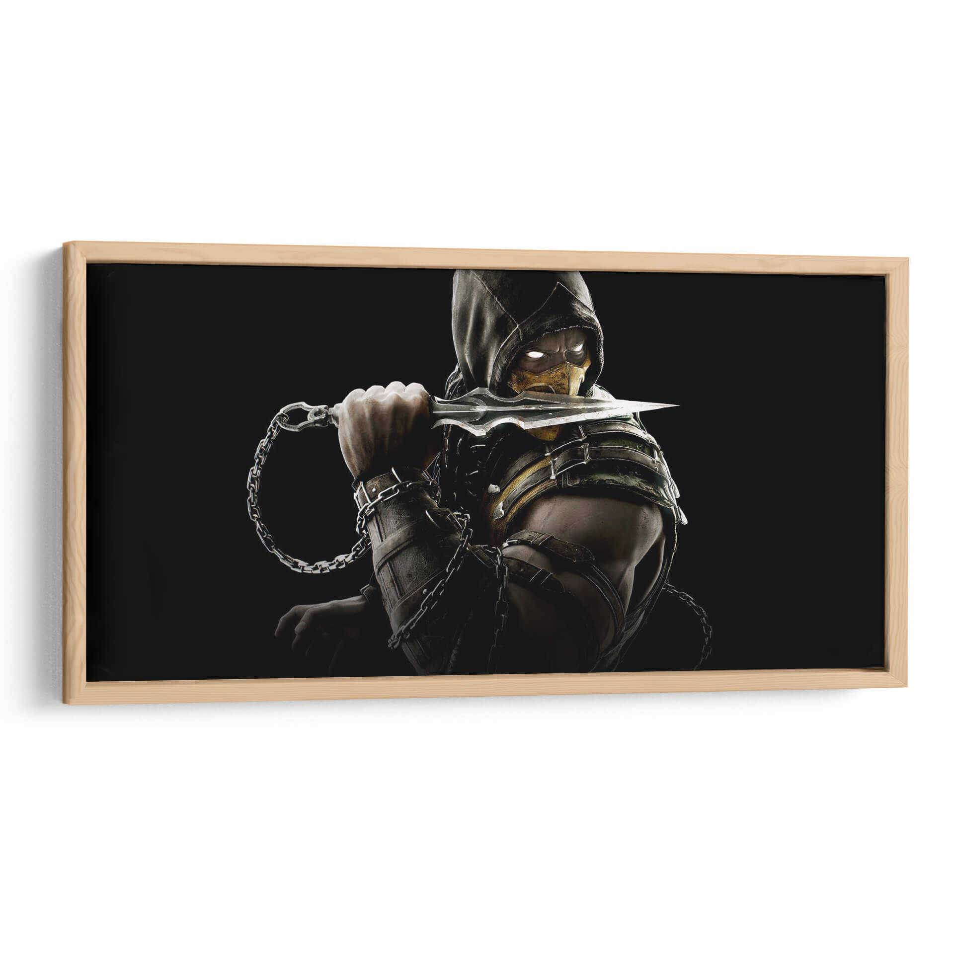 Este impactante cuadro decorativo captura la esencia enigmática y poderosa de un guerrero icónico en plena acción. La figura central, envuelta en sombras y con una mirada penetrante a través de su máscara dorada, empuña un arma afilada con cadenas intrincadas que añaden un elemento de peligro y dinamismo a la composición. Predominan los tonos oscuros, con contrastes marcados por los detalles metálicos del armamento y la armadura, y el brillo enigmático de los ojos, creando una atmósfera de intensidad y misterio. El estilo se inclina hacia lo dramático y lo gráfico, ideal para espacios que buscan un toque audaz y de carácter. Este lienzo decorativo es perfecto para salones modernos, estudios o habitaciones temáticas donde se desee añadir un punto focal de gran personalidad y un aire de intriga. Su fuerza visual lo convierte en una pieza de conversación que evoca poder y determinación, añadiendo un toque de fantasía y acción a cualquier decoración.