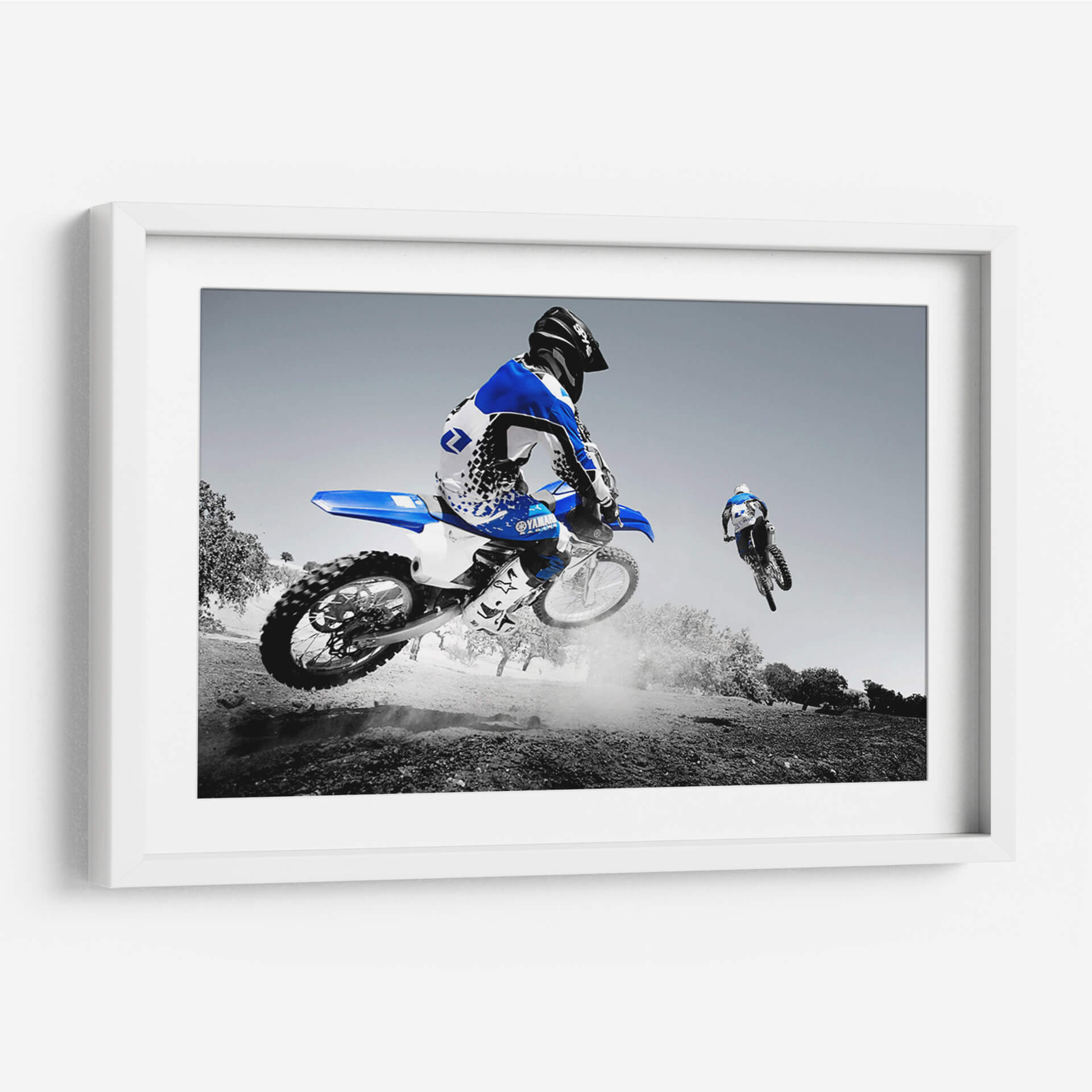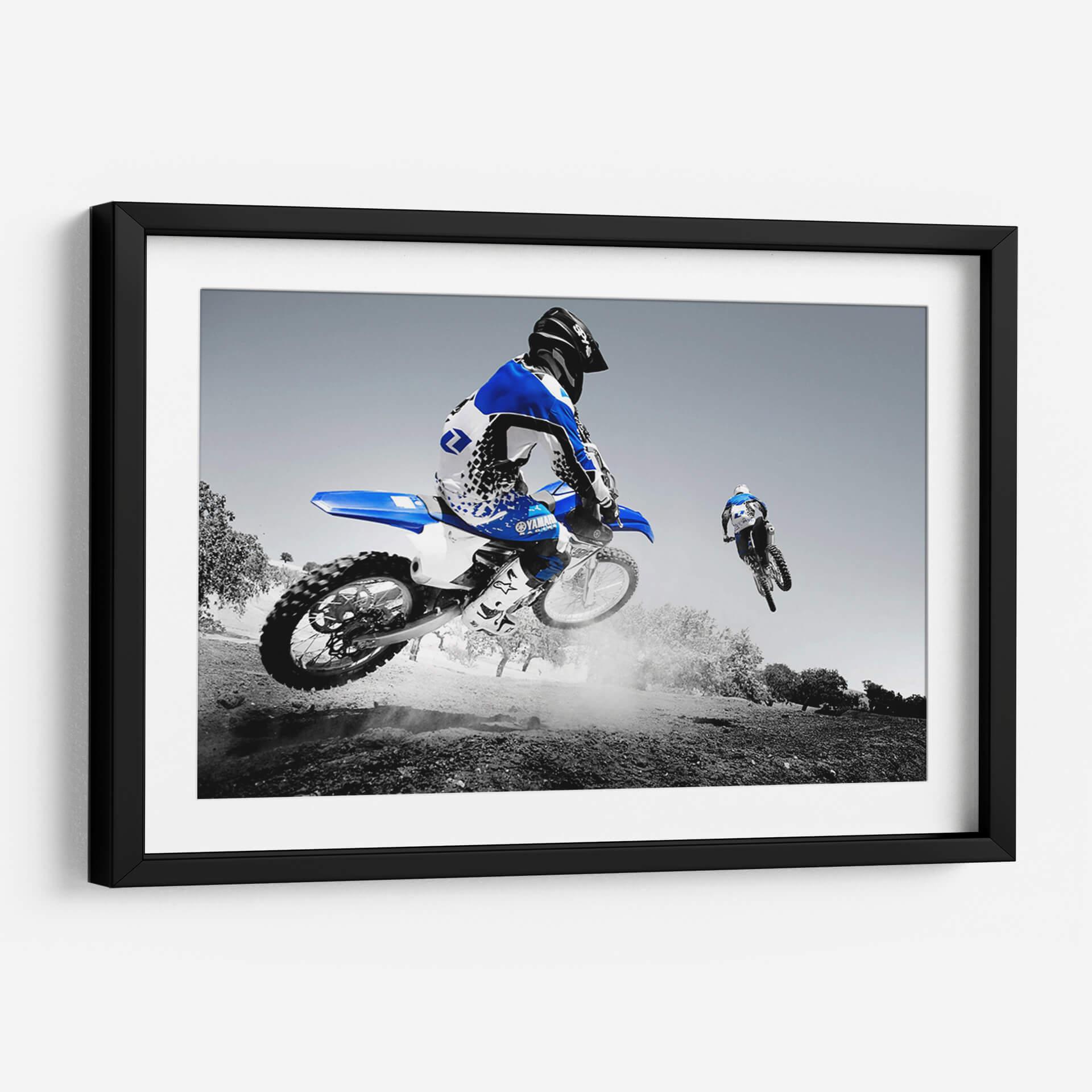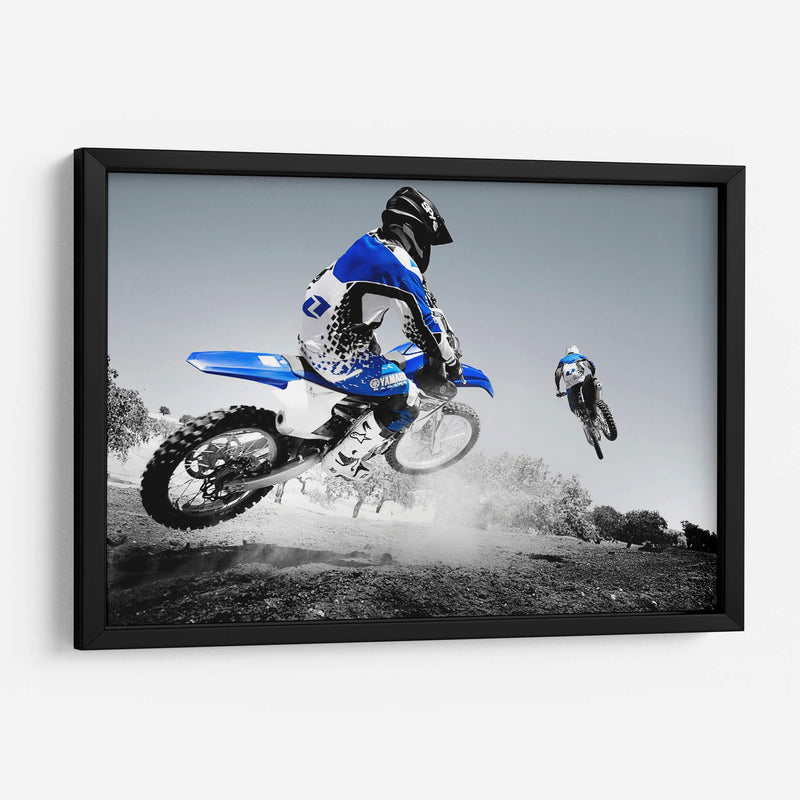 Captura la adrenalina y la velocidad con este impactante cuadro decorativo de "Motocross azul". La obra presenta a un motociclista en pleno salto, capturado en un momento de máxima acción y destreza. Predominan los tonos grises y negros en el paisaje de tierra y el cielo, creando un telón de fondo dramático que resalta la vibrante combinación de azul y blanco del equipo del deportista y la motocicleta. El contraste entre el colorido del piloto y la sobriedad del entorno genera un dinamismo visual que atraerá todas las miradas. La composición, con el primer plano enfocado en la rueda y el movimiento del piloto principal, junto a una figura secundaria en la distancia, evoca una sensación de competencia y desafío. Este cuadro decorativo es perfecto para espacios que buscan un toque de energía y modernidad, como salas de estar, oficinas o áreas de ocio. Ideal para los amantes de los deportes extremos y para quienes desean infundir a su hogar una atmósfera de audacia y superación. Transforma tu pared en una ventana a la emoción del motocross, añadiendo un elemento decorativo único y lleno de fuerza a tu decoración.