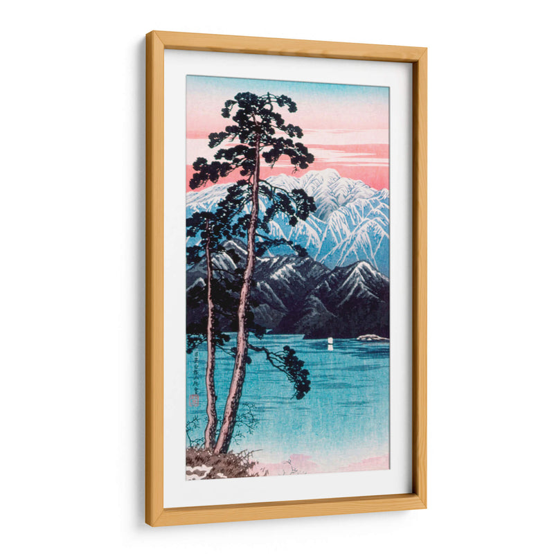 Transporta tu espacio a las serenas alturas de Japón con "Nieve persistente en el monte Shirane, Nikkō", una obra maestra del artista Hiroaki Takahashi. Este cautivador cuadro decorativo captura la majestuosidad de un paisaje montañoso nevado reflejado en aguas cristalinas, enmarcado por la silueta dramática de dos pinos esbeltos. La paleta de colores, dominada por vibrantes azules turquesas para el agua y el cielo, contrasta sutilmente con los tonos rosados del amanecer o atardecer y los blancos níveos de las cumbres, creando una atmósfera de paz y contemplación. El estilo distintivo del artista evoca la tradición del arte japonés Ukiyo-e, con sus líneas definidas y su enfoque en la belleza natural. La composición, que equilibra la fuerza de los árboles en primer plano con la inmensidad de las montañas a lo lejos, invita a la meditación y al disfrute de la tranquilidad. Ideal para añadir un toque de sofisticación y serenidad a salones, dormitorios o estudios, esta pieza es una ventana a un mundo de calma y belleza escénica. Transforma tu hogar en un santuario de paz con este evocador cuadro decorativo, perfecto para quienes buscan una conexión con la naturaleza y el arte tradicional japonés.