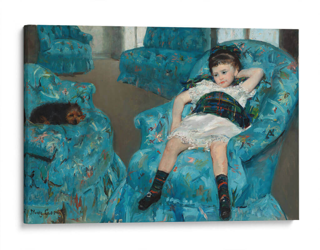 Sumérgete en la ternura y la intimidad de "Niñita en un sillón azul", una obra maestra de Mary Cassatt que captura un momento de apacible contemplación. Este cuadro decorativo presenta a una niña, vestida con un encaje blanco y un fular a cuadros escoceses, recostada lánguidamente en un suntuoso sillón de terciopelo azul vibrante, adornado con un delicado estampado floral. A sus pies, un pequeño perro duerme plácidamente, añadiendo una capa de calidez y compañerismo a la escena. La paleta de azules profundos y turquesas, salpicada por toques de colores cálidos en el estampado del sillón y la vestimenta de la niña, crea una atmósfera de tranquilidad y confort. El estilo impresionista de Cassatt se manifiesta en sus pinceladas sueltas y la captación de la luz, que dotan a la obra de una sensación de inmediatez y vida. Este cuadro es una pieza ideal para infundir serenidad y un toque de elegancia clásica a cualquier dormitorio, sala de estar o estudio, invitando a la reflexión y al disfrute de la belleza en los momentos cotidianos. Un tesoro artístico que evoca nostalgia y la dulzura de la infancia.