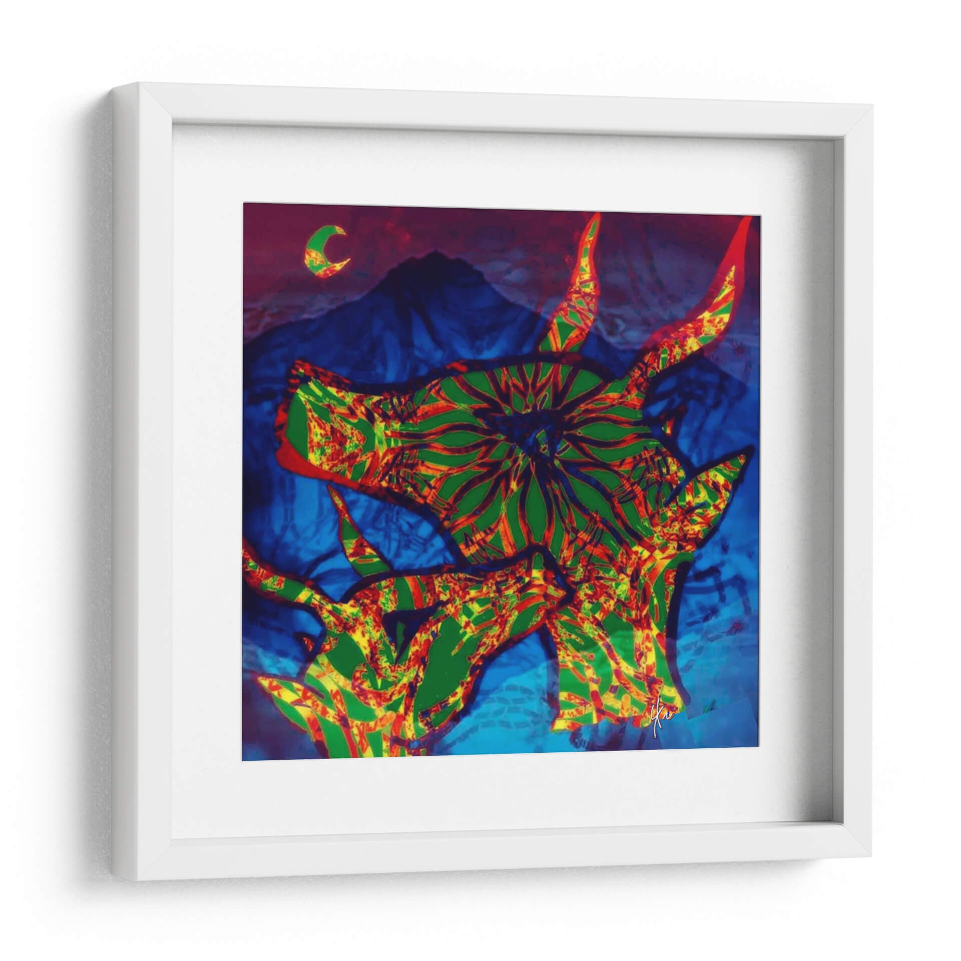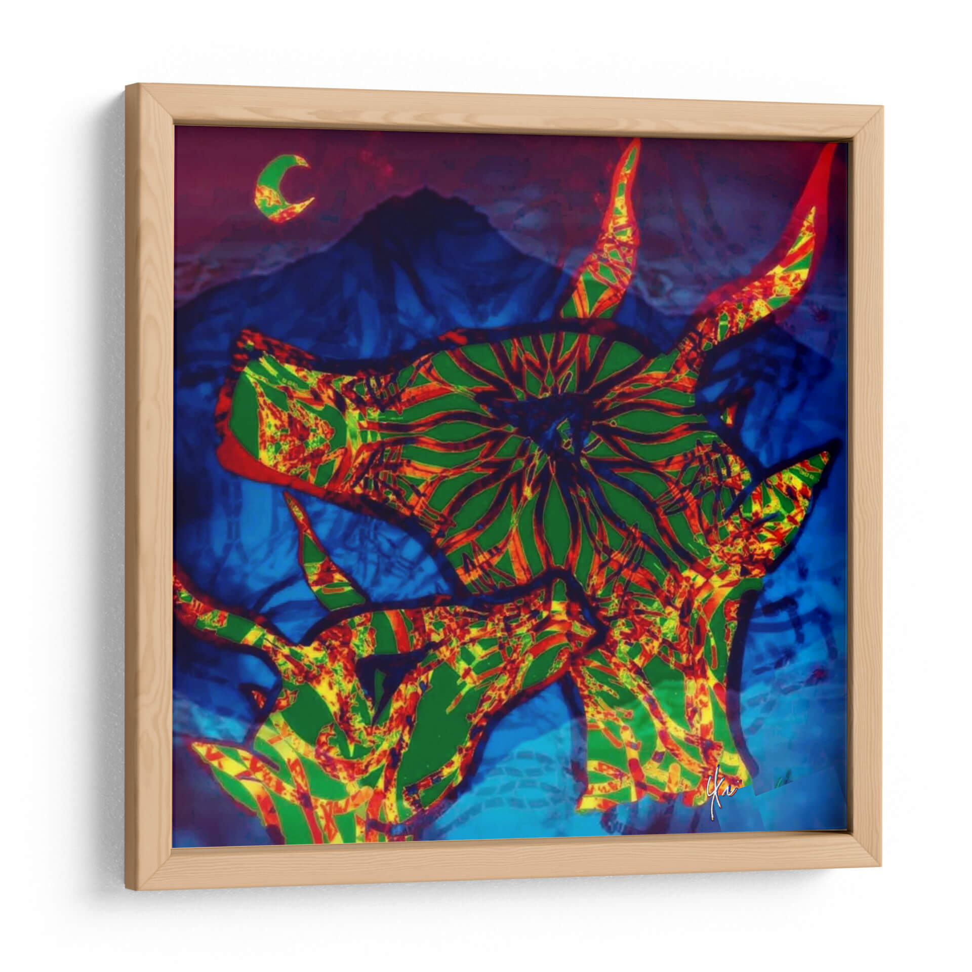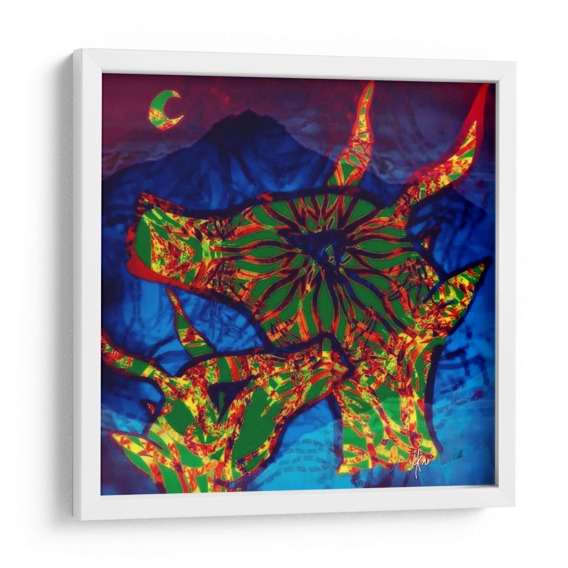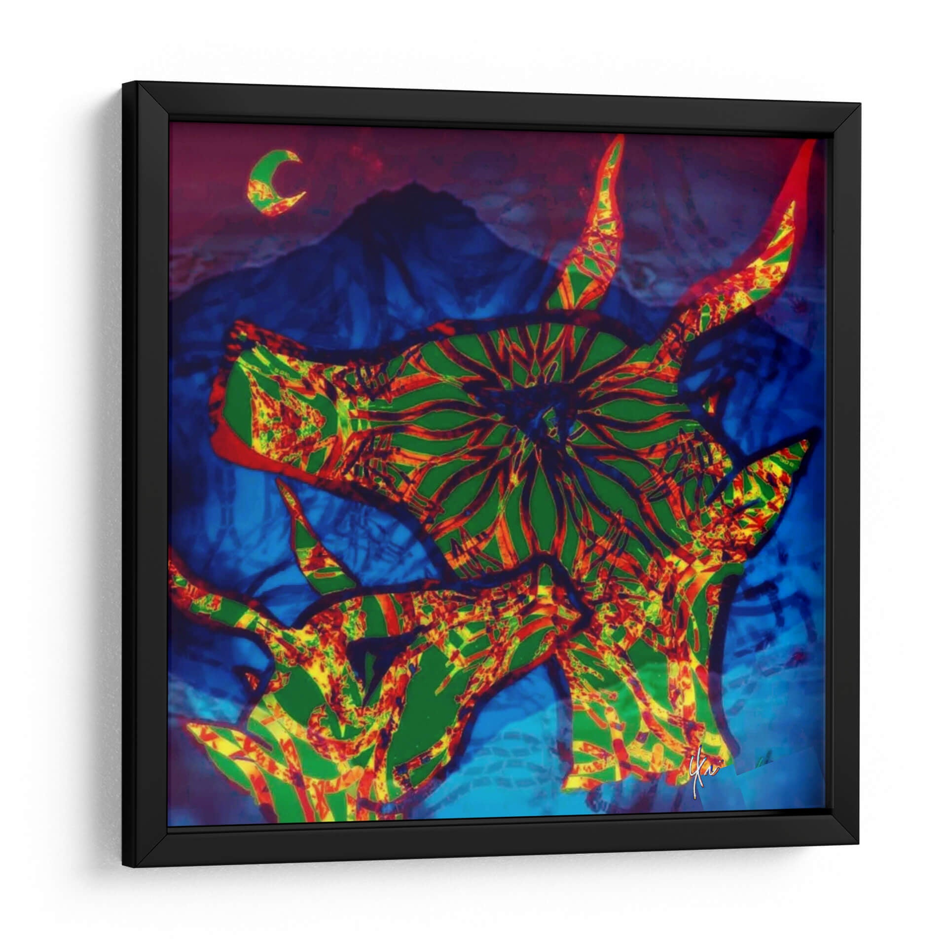 Sumérgete en la enigmática obra "Noche de Cabras" del artista YH, una pieza que desafía las convenciones y captura la imaginación. Este cuadro decorativo vibrante presenta una figura central estilizada que evoca la imagen de una cabra, rodeada por un paisaje nocturno etéreo. El fondo está dominado por tonos profundos de azul y púrpura, con siluetas montañosas que sugieren un entorno salvaje y misterioso, mientras que una luna creciente ilumina la escena desde lo alto. Los colores intensos y contrastantes, especialmente el verde esmeralda y el rojo carmesí que forman patrones intrincados en la figura principal y sus apéndices, crean una energía dinámica y casi tribal. La composición es audaz, utilizando superposiciones y texturas digitales para añadir profundidad y un aura surrealista. "Noche de Cabras" es una obra de arte contemporáneo que invita a la reflexión y es perfecta para añadir un toque de originalidad y misterio a cualquier espacio, ya sea una sala de estar moderna, un estudio o un dormitorio con carácter. Su fuerza visual la convierte en un punto focal ideal para conversaciones y admiración.
