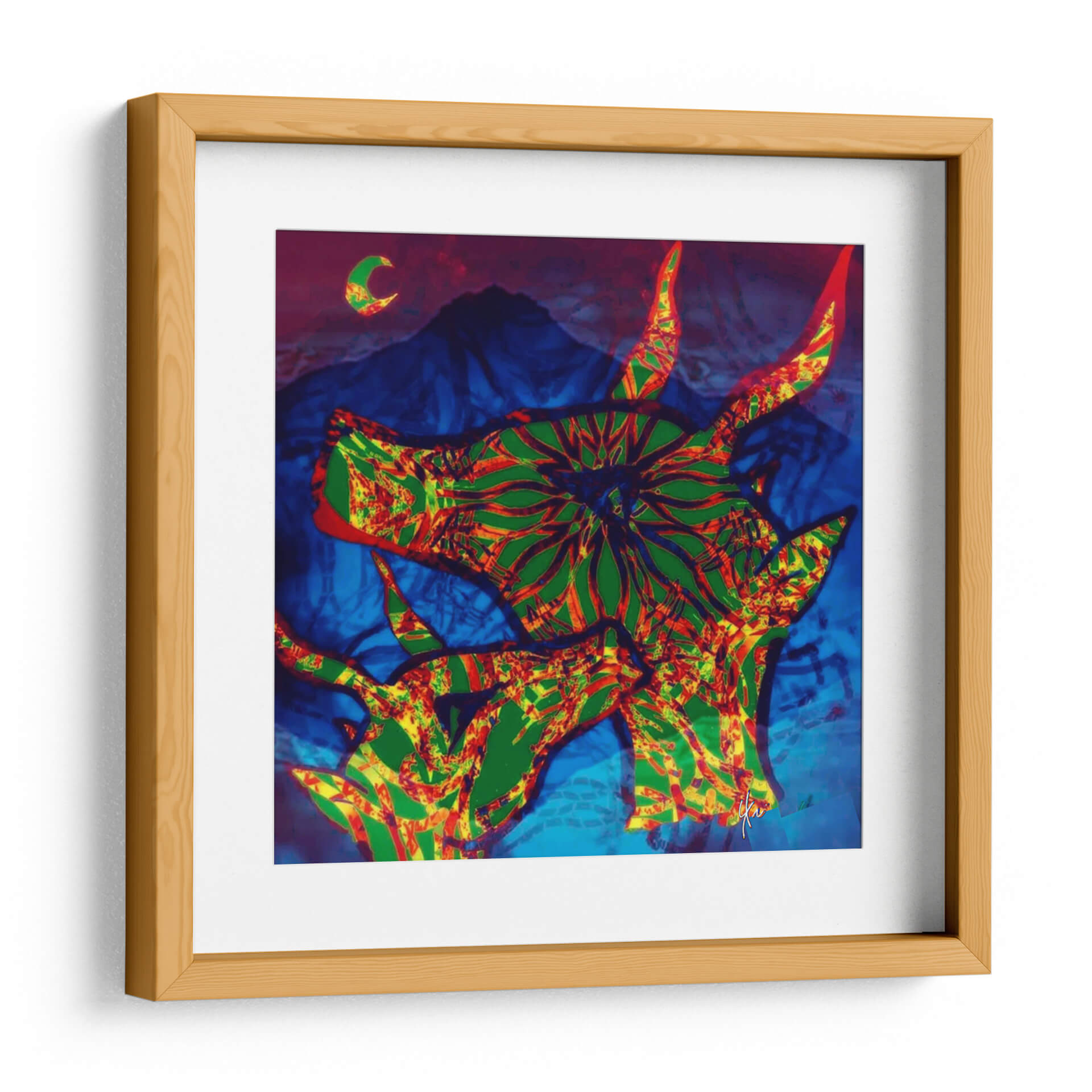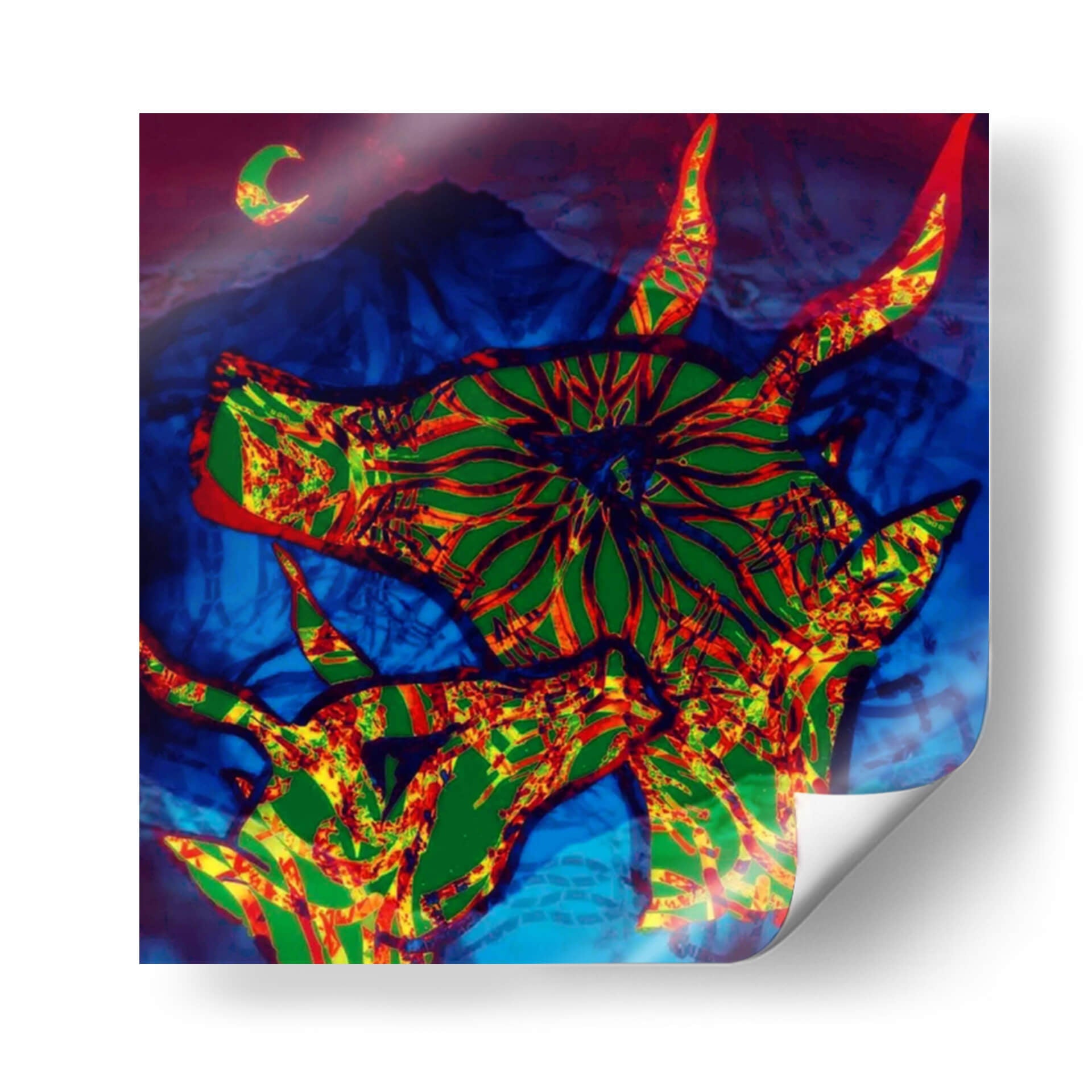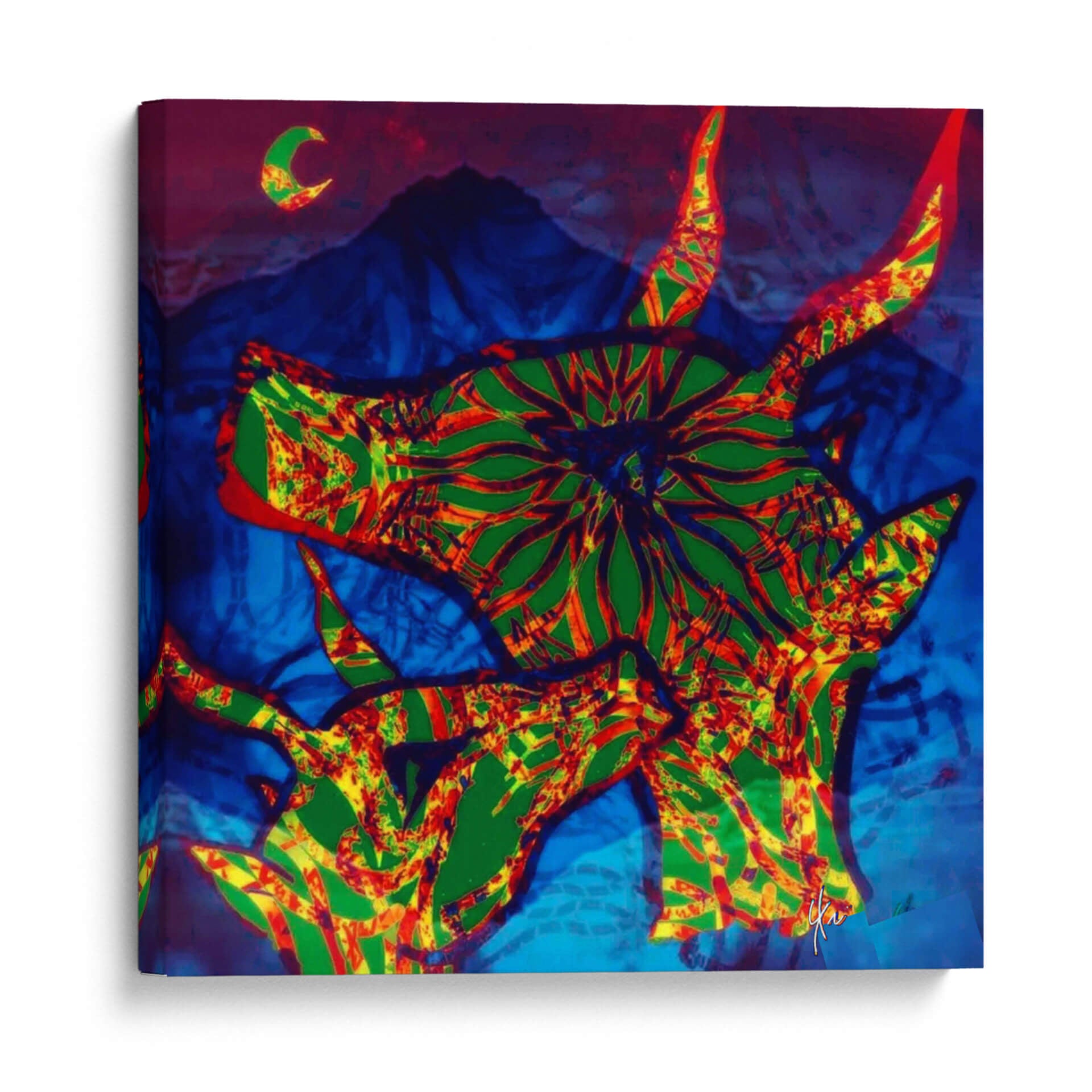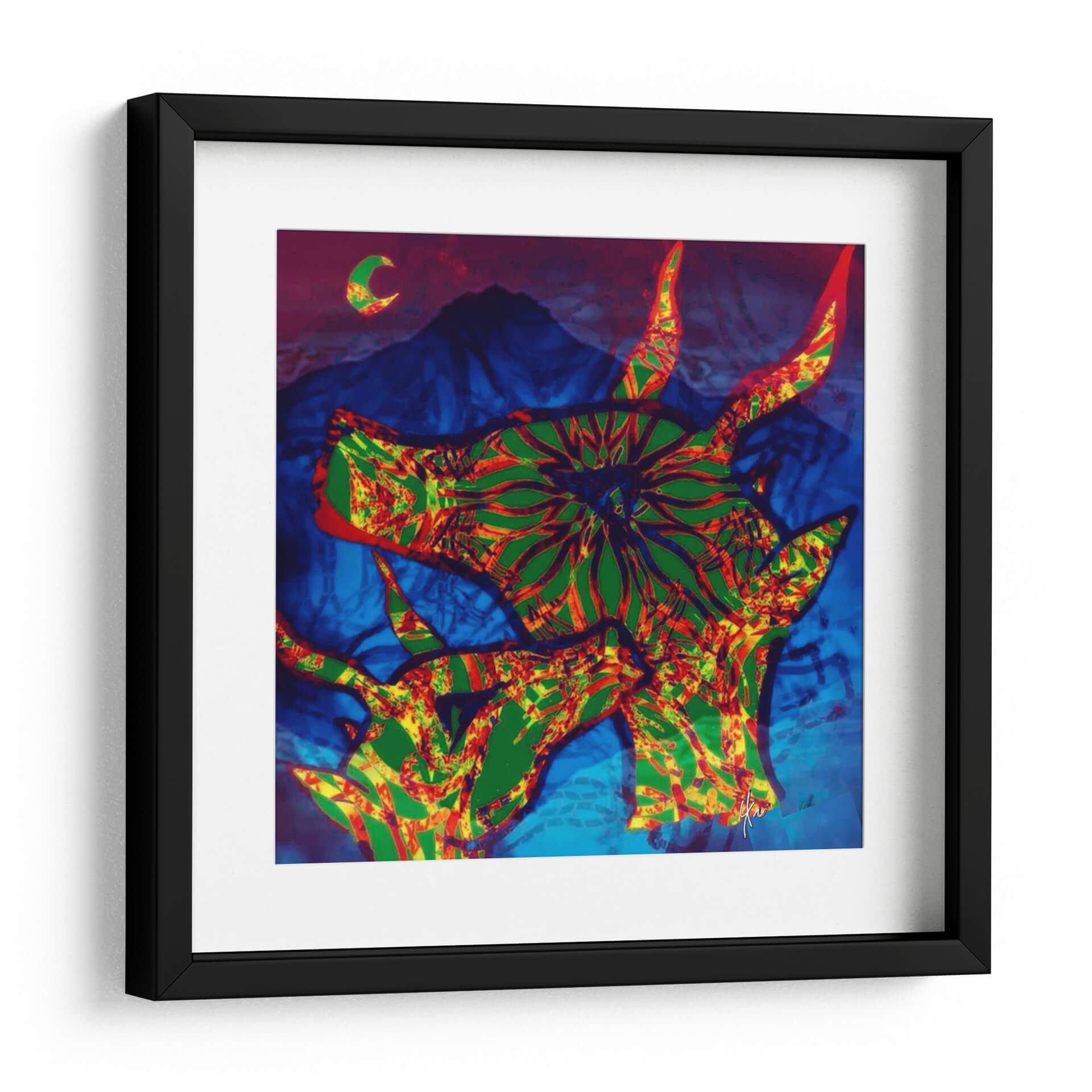 Sumérgete en la enigmática obra "Noche de Cabras" del artista YH, una pieza que desafía las convenciones y captura la imaginación. Este cuadro decorativo vibrante presenta una figura central estilizada que evoca la imagen de una cabra, rodeada por un paisaje nocturno etéreo. El fondo está dominado por tonos profundos de azul y púrpura, con siluetas montañosas que sugieren un entorno salvaje y misterioso, mientras que una luna creciente ilumina la escena desde lo alto. Los colores intensos y contrastantes, especialmente el verde esmeralda y el rojo carmesí que forman patrones intrincados en la figura principal y sus apéndices, crean una energía dinámica y casi tribal. La composición es audaz, utilizando superposiciones y texturas digitales para añadir profundidad y un aura surrealista. "Noche de Cabras" es una obra de arte contemporáneo que invita a la reflexión y es perfecta para añadir un toque de originalidad y misterio a cualquier espacio, ya sea una sala de estar moderna, un estudio o un dormitorio con carácter. Su fuerza visual la convierte en un punto focal ideal para conversaciones y admiración.