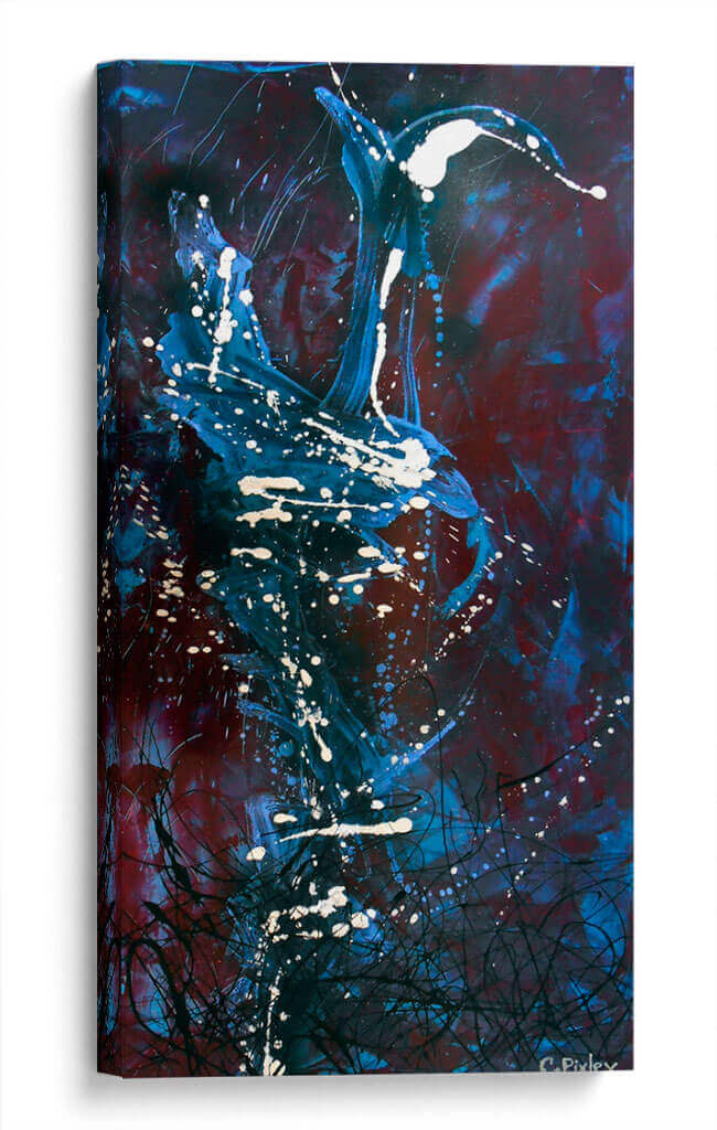 Sumérgete en la intensidad de "Noche púrpura y torbellino", una obra de arte abstracto contemporáneo del artista Carlos Pixley. Este cuadro decorativo cautiva con su dinámica explosión de azules profundos y vibrantes, contrastados por salpicaduras enérgicas de blanco puro y un fondo profundo que evoca los misterios de la noche. Las pinceladas fluidas y los trazos gestuales crean una sensación de movimiento y energía desbordante, como si la propia tormenta de color cobrara vida ante tus ojos. La paleta de colores, dominada por el púrpura oscuro y los azules eléctricos, transmite una atmósfera de pasión y profundidad, ideal para aquellos que buscan añadir un toque dramático y sofisticado a su hogar u oficina. Su composición abstracta invita a la interpretación personal, permitiendo que cada espectador descubra su propia narrativa en este torbellino de emociones. Este lienzo es perfecto para espacios modernos que buscan un punto focal audaz y lleno de carácter, transformando cualquier habitación en una galería de arte personal. Añade una pieza que inspire conversaciones y refleje tu aprecio por el arte contemporáneo vibrante y enigmático.