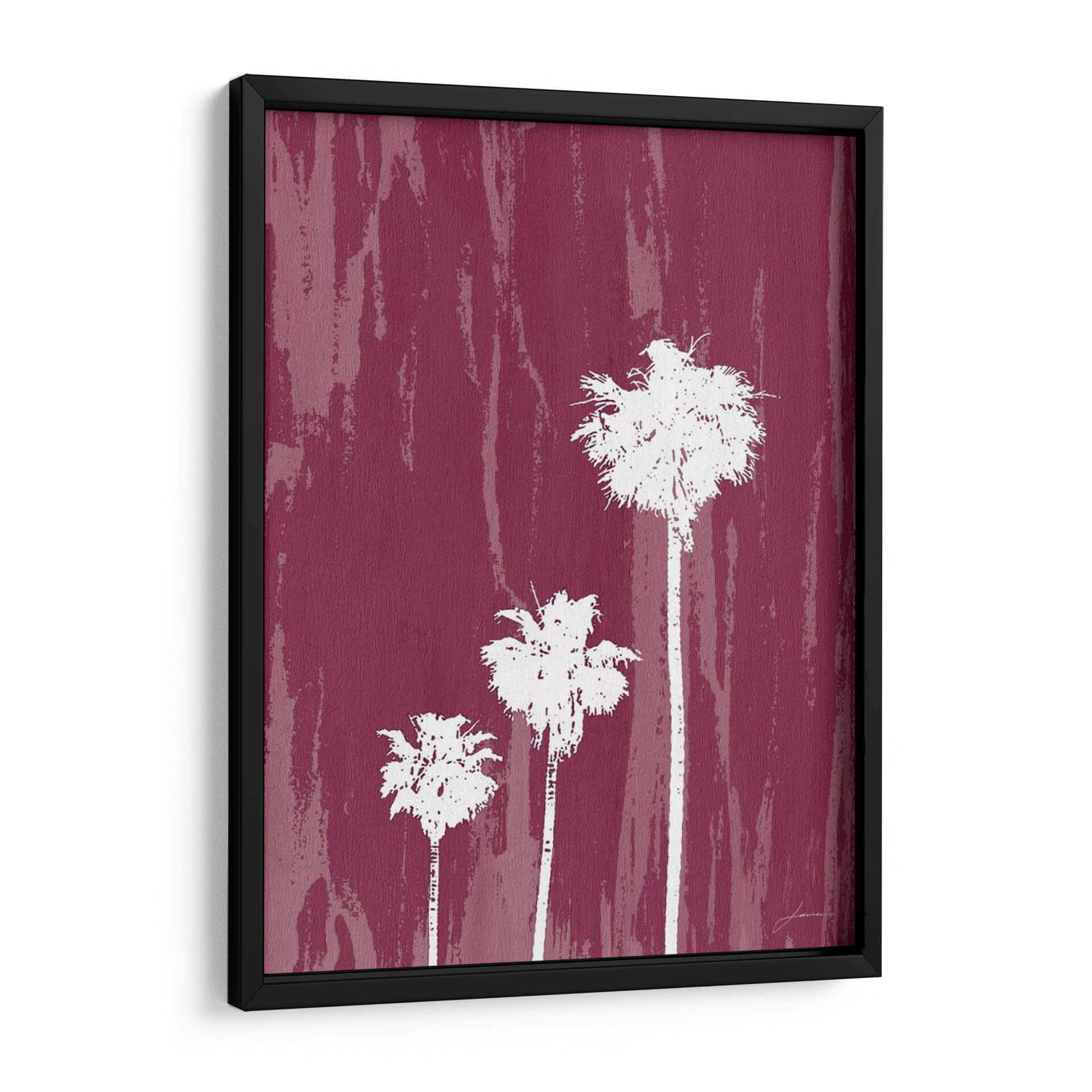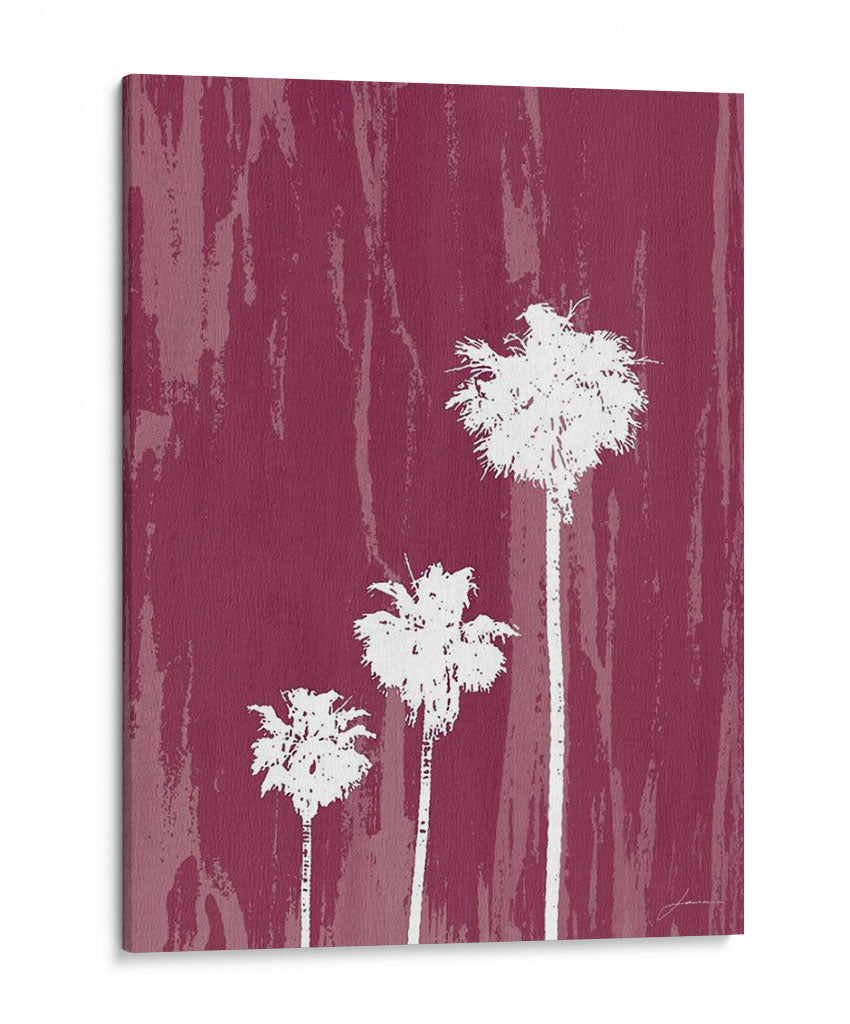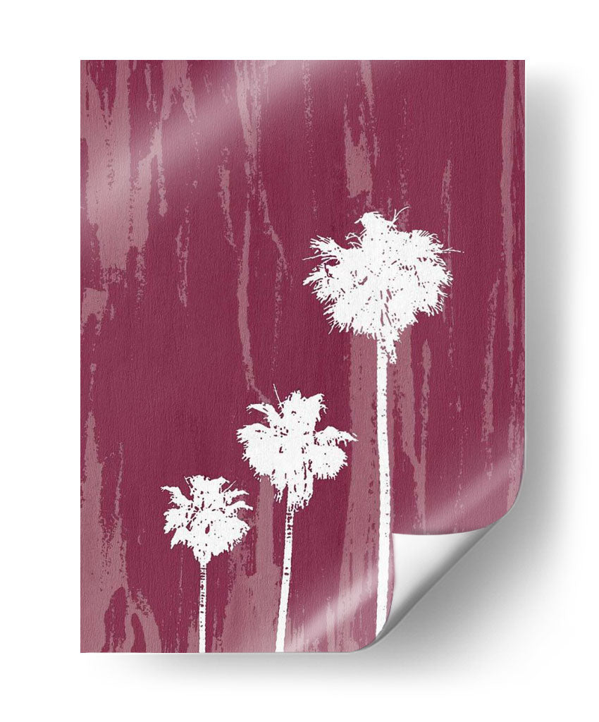 Sumérgete en la serenidad tropical con "Oasis I", una cautivadora obra de arte digital del artista James Burghardt. Este cuadro decorativo presenta una composición estilizada de tres palmeras blancas recortadas sobre un vibrante fondo texturizado en tonos burdeos y malva. Las siluetas nítidas de las palmeras contrastan delicadamente con las pinceladas verticales y desgastadas del fondo, creando una sensación de profundidad y dinamismo.