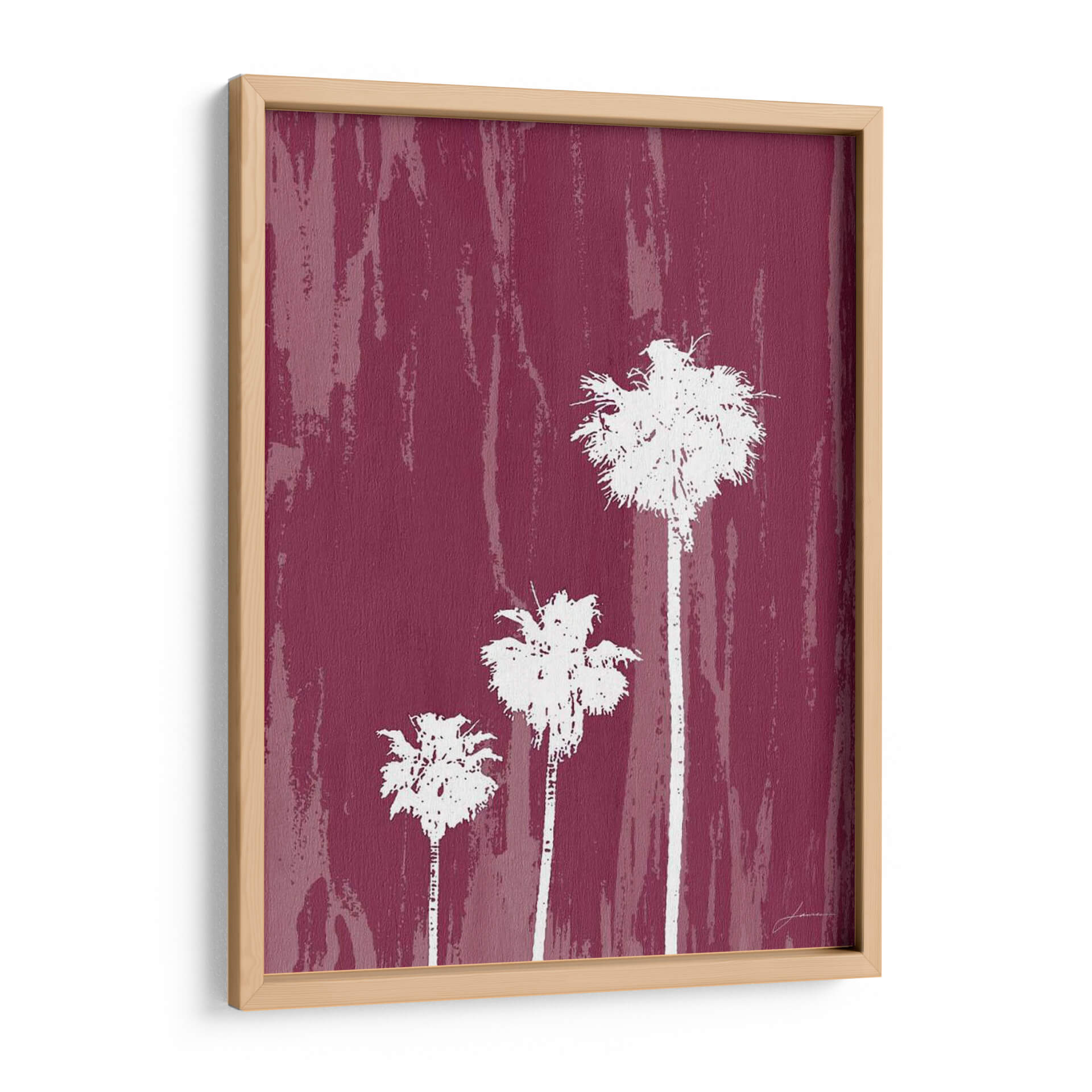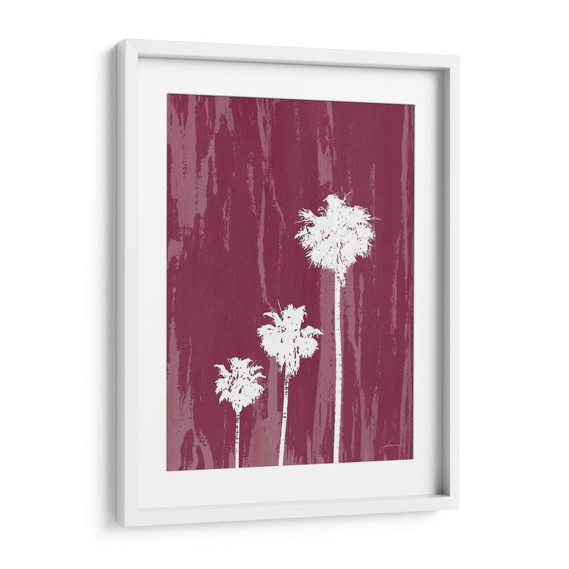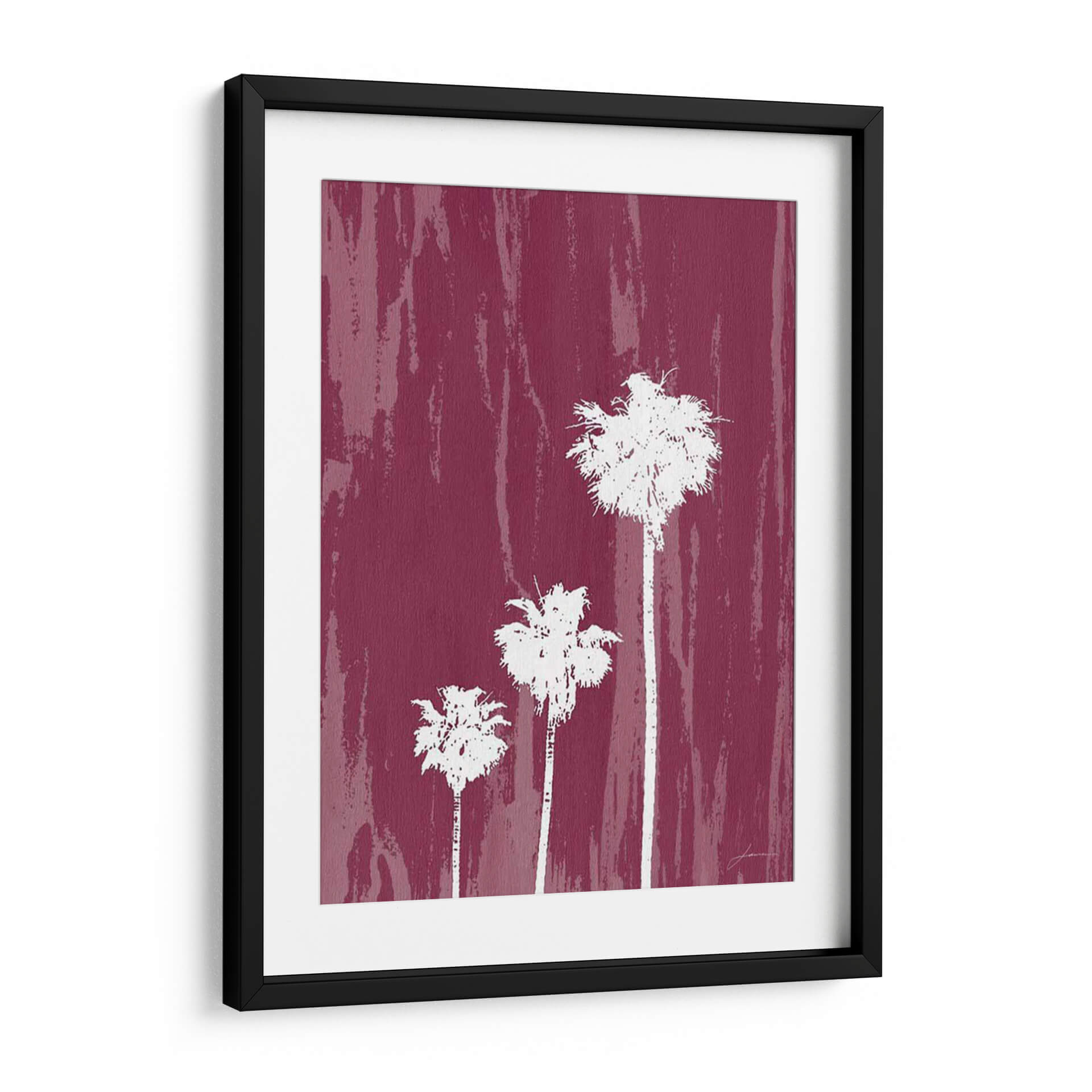 Sumérgete en la serenidad tropical con "Oasis I", una cautivadora obra de arte digital del artista James Burghardt. Este cuadro decorativo presenta una composición estilizada de tres palmeras blancas recortadas sobre un vibrante fondo texturizado en tonos burdeos y malva. Las siluetas nítidas de las palmeras contrastan delicadamente con las pinceladas verticales y desgastadas del fondo, creando una sensación de profundidad y dinamismo.