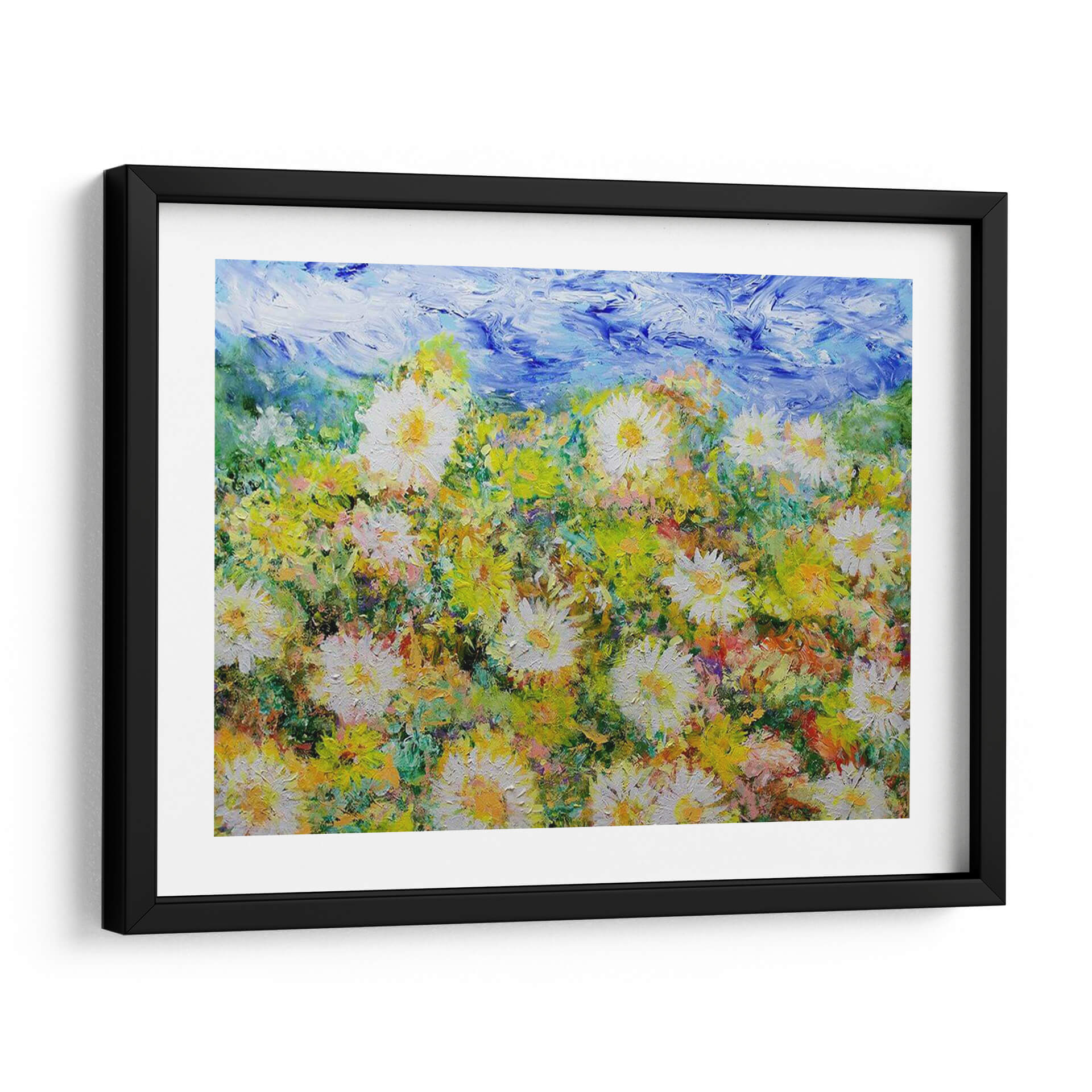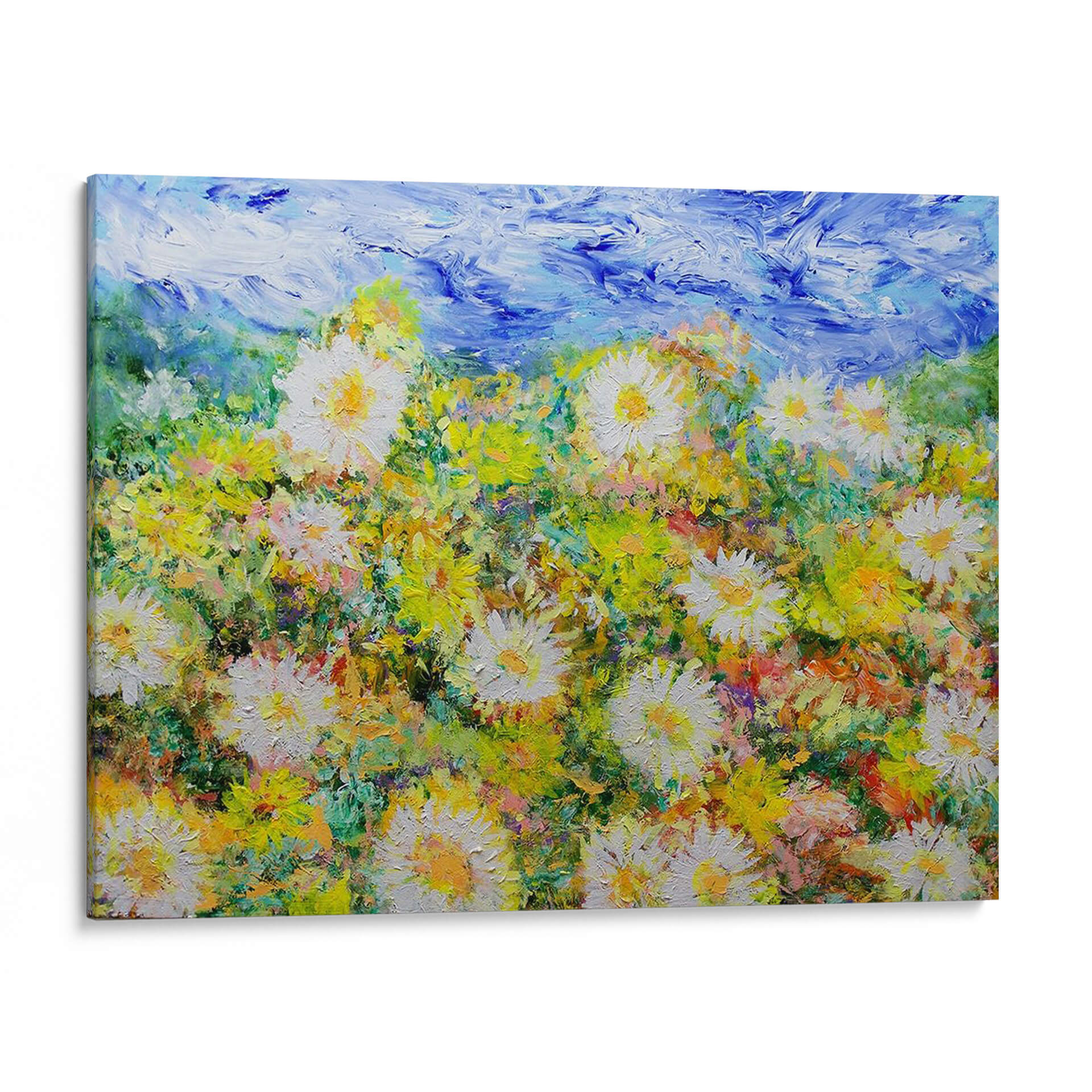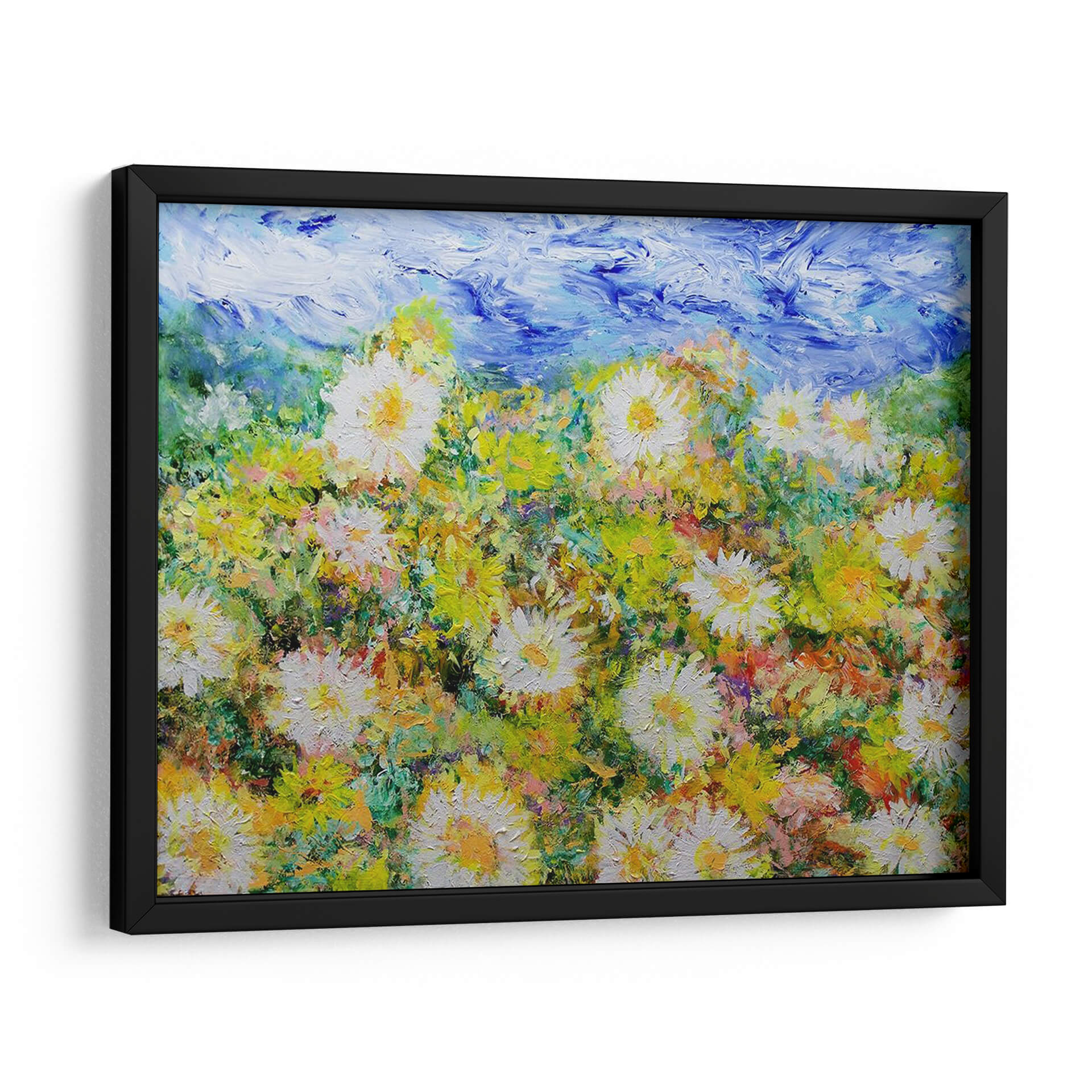 Sumérgete en la explosión de vitalidad de "Oh Días Felices", una obra de arte contemporáneo que captura la esencia de un campo florido bajo un cielo vibrante. Allan Friedlander nos transporta a un paraíso de texturas y colores, donde las margarinas blancas y amarillas se alzan con orgullo entre un follaje exuberante y pinceladas audaces de azul celestial. Cada trazo de pincel evoca la energía y la alegría de un día soleado, creando una atmósfera de optimismo y serenidad que transformará cualquier espacio. Este cuadro decorativo, con su estilo impresionista moderno, es ideal para añadir un toque de naturaleza y luminosidad a tu hogar u oficina. Imagina la frescura de la primavera invadiendo tu sala de estar, o la calma de un prado adornando tu dormitorio. La rica paleta de verdes, amarillos y blancos, contrastada con el azul intenso del cielo, crea una profundidad visual cautivadora. "Oh Días Felices" no es solo una pieza decorativa, es una invitación a la contemplación y al disfrute de la belleza efímera de la naturaleza. Perfecto para aquellos que buscan arte que inspire y eleve el espíritu.