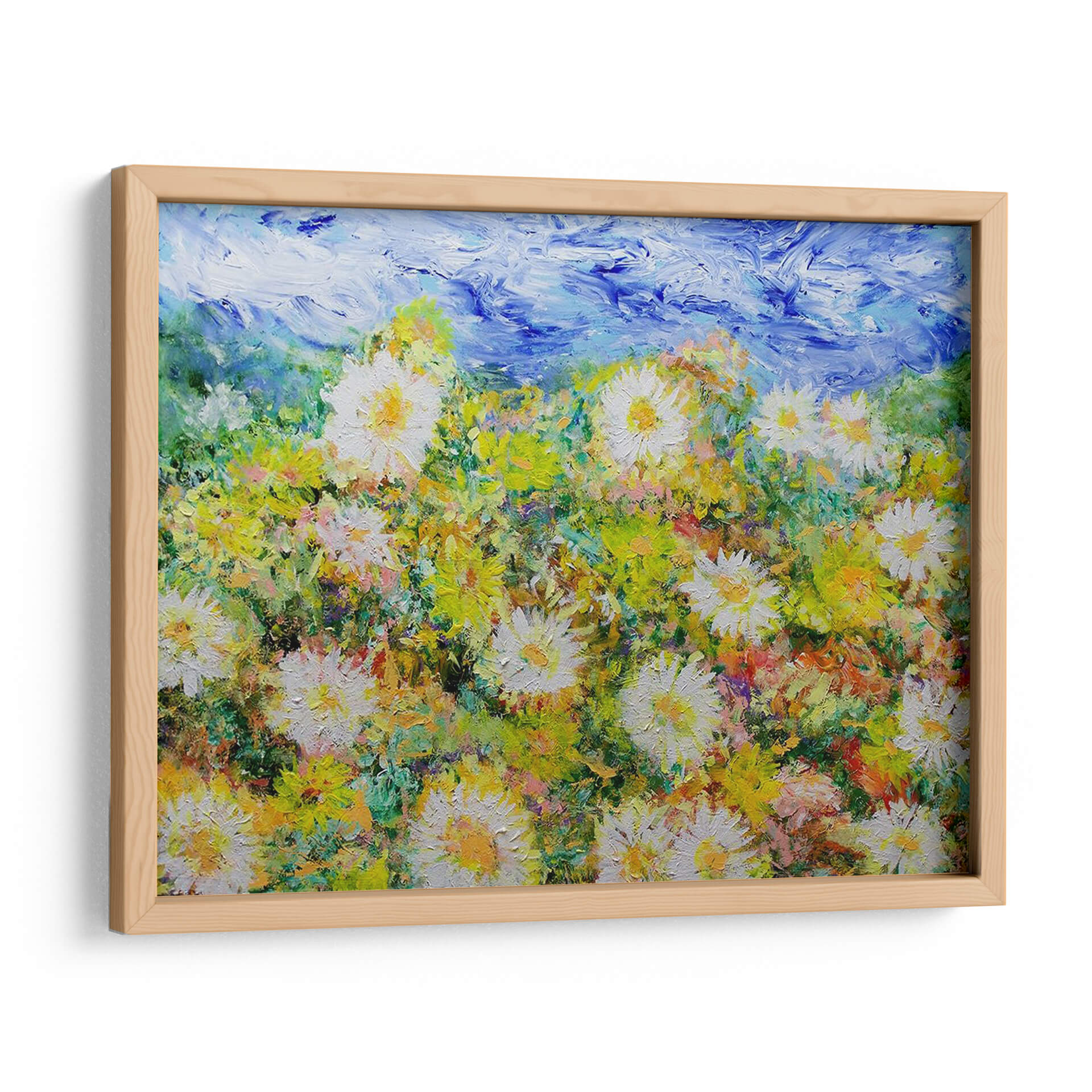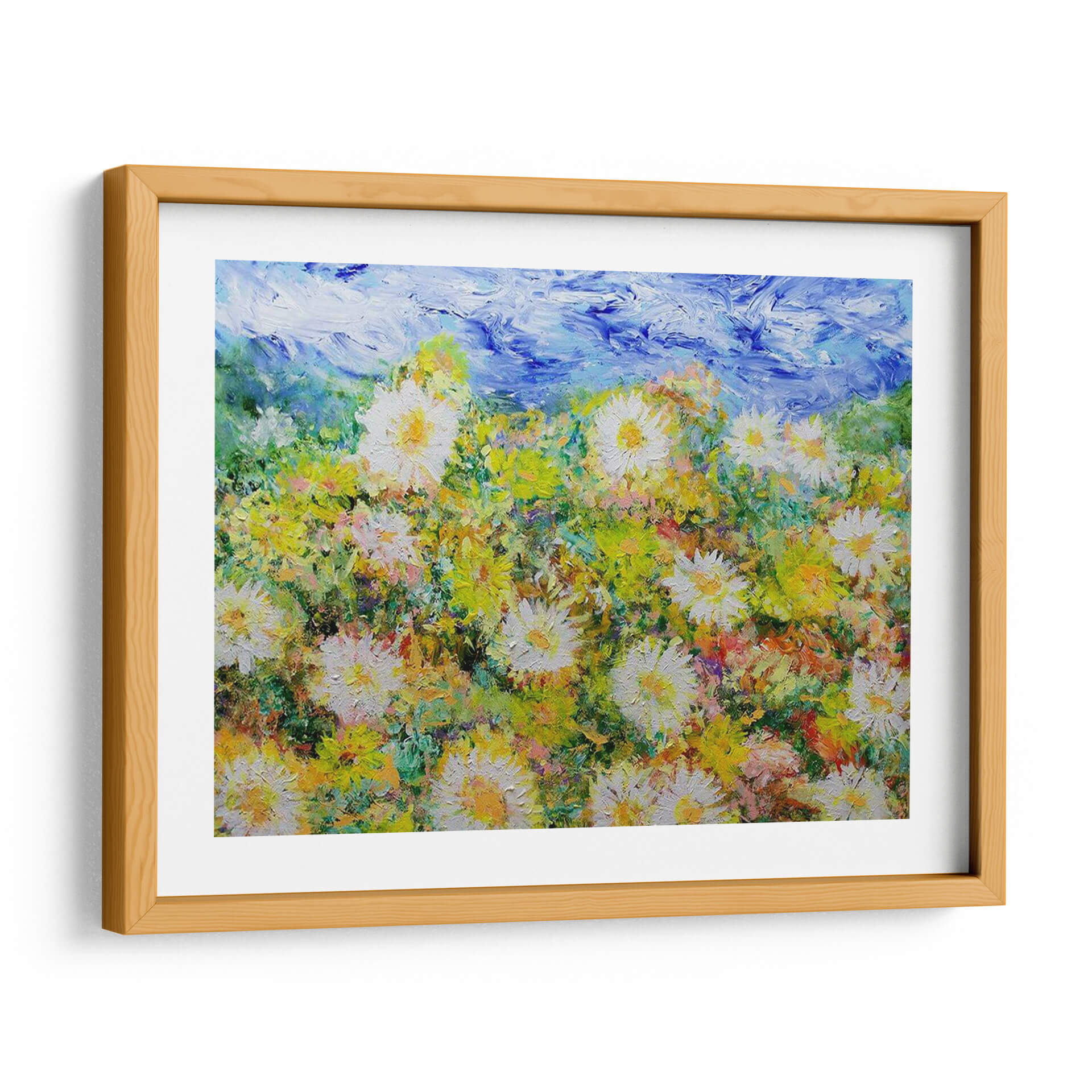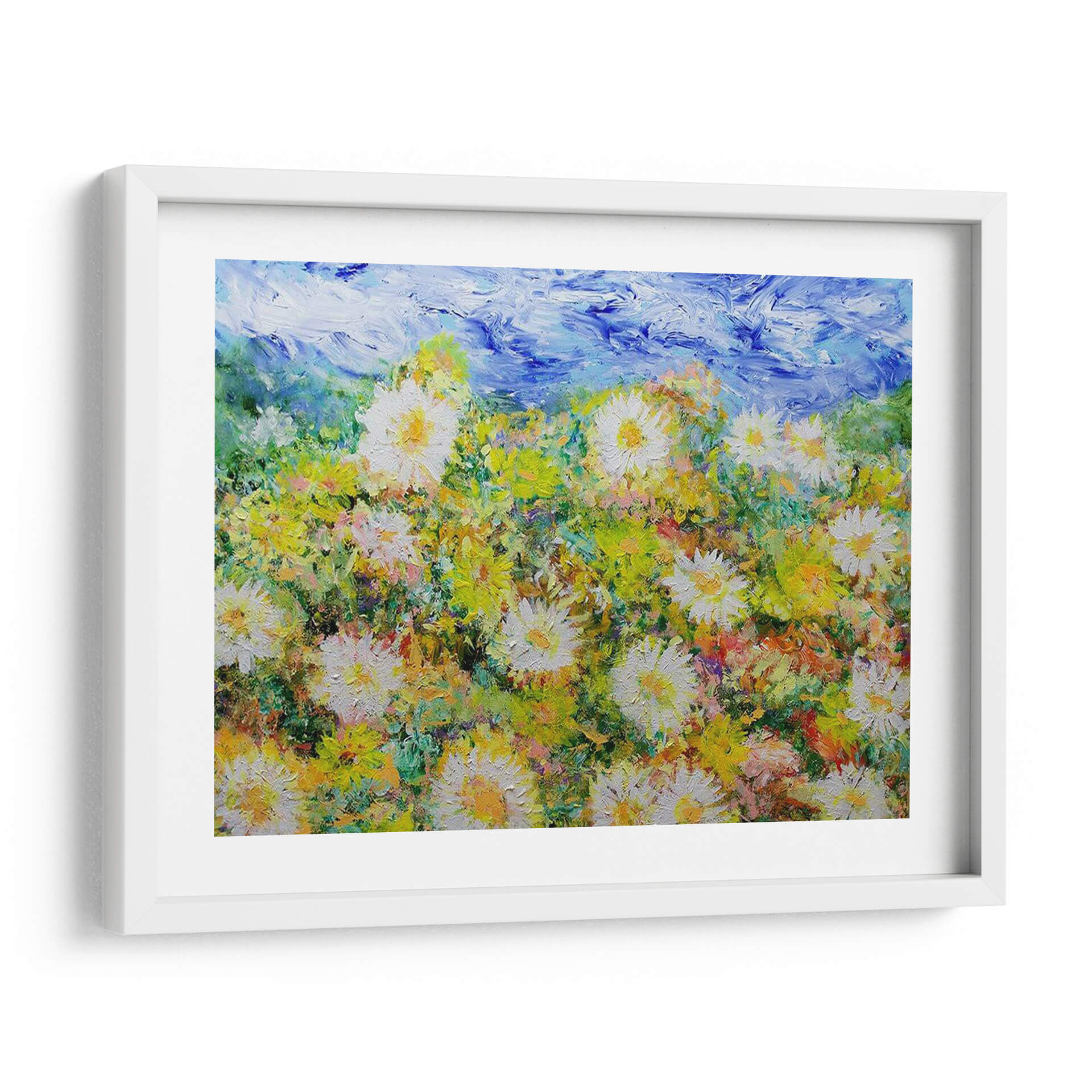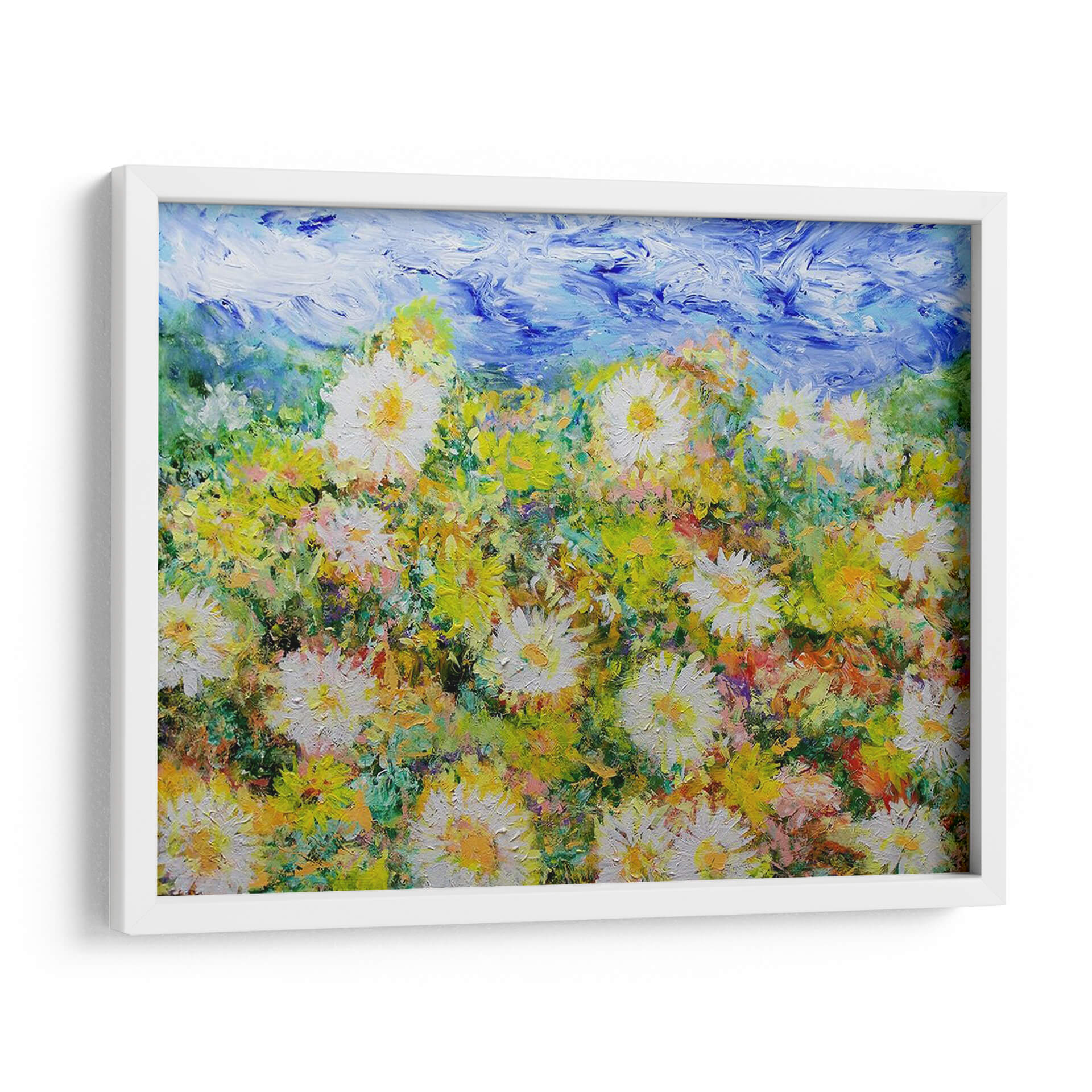 Sumérgete en la explosión de vitalidad de "Oh Días Felices", una obra de arte contemporáneo que captura la esencia de un campo florido bajo un cielo vibrante. Allan Friedlander nos transporta a un paraíso de texturas y colores, donde las margarinas blancas y amarillas se alzan con orgullo entre un follaje exuberante y pinceladas audaces de azul celestial. Cada trazo de pincel evoca la energía y la alegría de un día soleado, creando una atmósfera de optimismo y serenidad que transformará cualquier espacio. Este cuadro decorativo, con su estilo impresionista moderno, es ideal para añadir un toque de naturaleza y luminosidad a tu hogar u oficina. Imagina la frescura de la primavera invadiendo tu sala de estar, o la calma de un prado adornando tu dormitorio. La rica paleta de verdes, amarillos y blancos, contrastada con el azul intenso del cielo, crea una profundidad visual cautivadora. "Oh Días Felices" no es solo una pieza decorativa, es una invitación a la contemplación y al disfrute de la belleza efímera de la naturaleza. Perfecto para aquellos que buscan arte que inspire y eleve el espíritu.