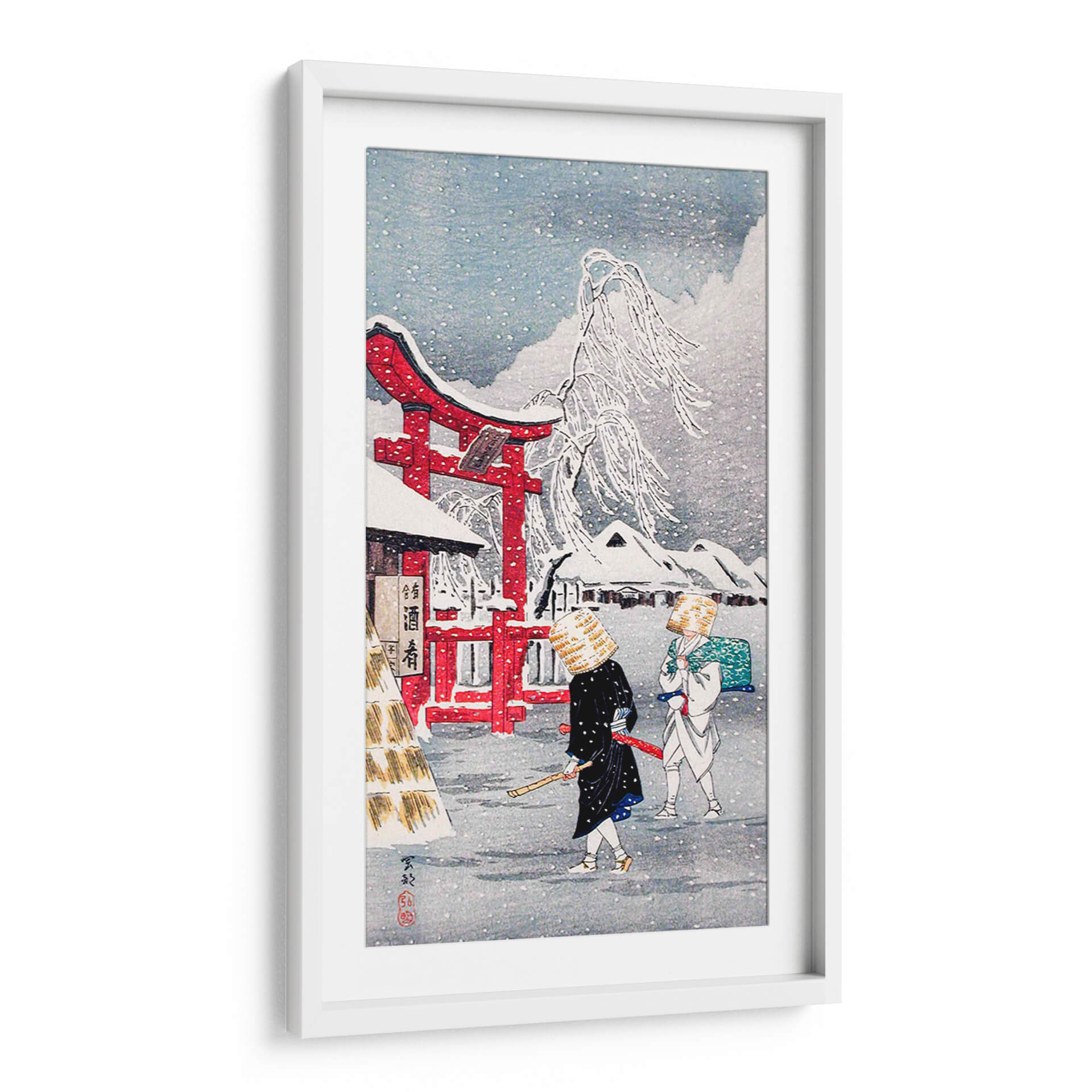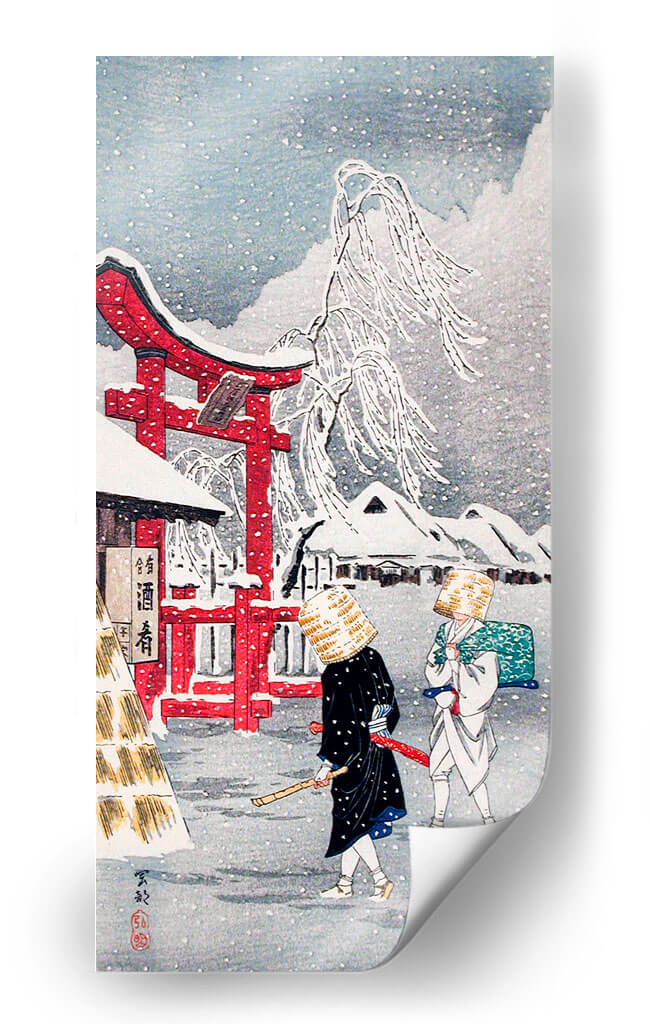 Sumérgete en la serena belleza de "Okabe en la nieve", una obra maestra del reconocido artista Hiroaki Takahashi. Esta cautivadora pieza captura un momento de quietud invernal, transportándote a un paisaje japonés cubierto por un manto blanco y delicado. La vibrante arquitectura del 'torii' rojo, contrastando con la suave paleta de azules pálidos y grises de la nieve y el cielo, crea una atmósfera visualmente impactante. Dos figuras, envueltas en vestimentas tradicionales y protegidas con sombreros de paja, transitan por el camino nevado, aportando un sentido de movimiento y narrativa a la escena. La obra evoca una sensación de paz, introspección y la resistencia del espíritu humano frente a la naturaleza. Es ideal para quienes buscan infundir a sus hogares u oficinas un toque de elegancia clásica y una atmósfera de tranquilidad profunda. Este cuadro decorativo no solo embellece tus paredes, sino que también invita a la contemplación y al disfrute de la estética japonesa tradicional, convirtiéndose en un punto focal que inspira calma y serenidad en cualquier espacio. Añade esta pieza única a tu colección y experimenta la magia de un invierno japonés en tu propio hogar.