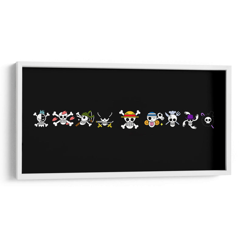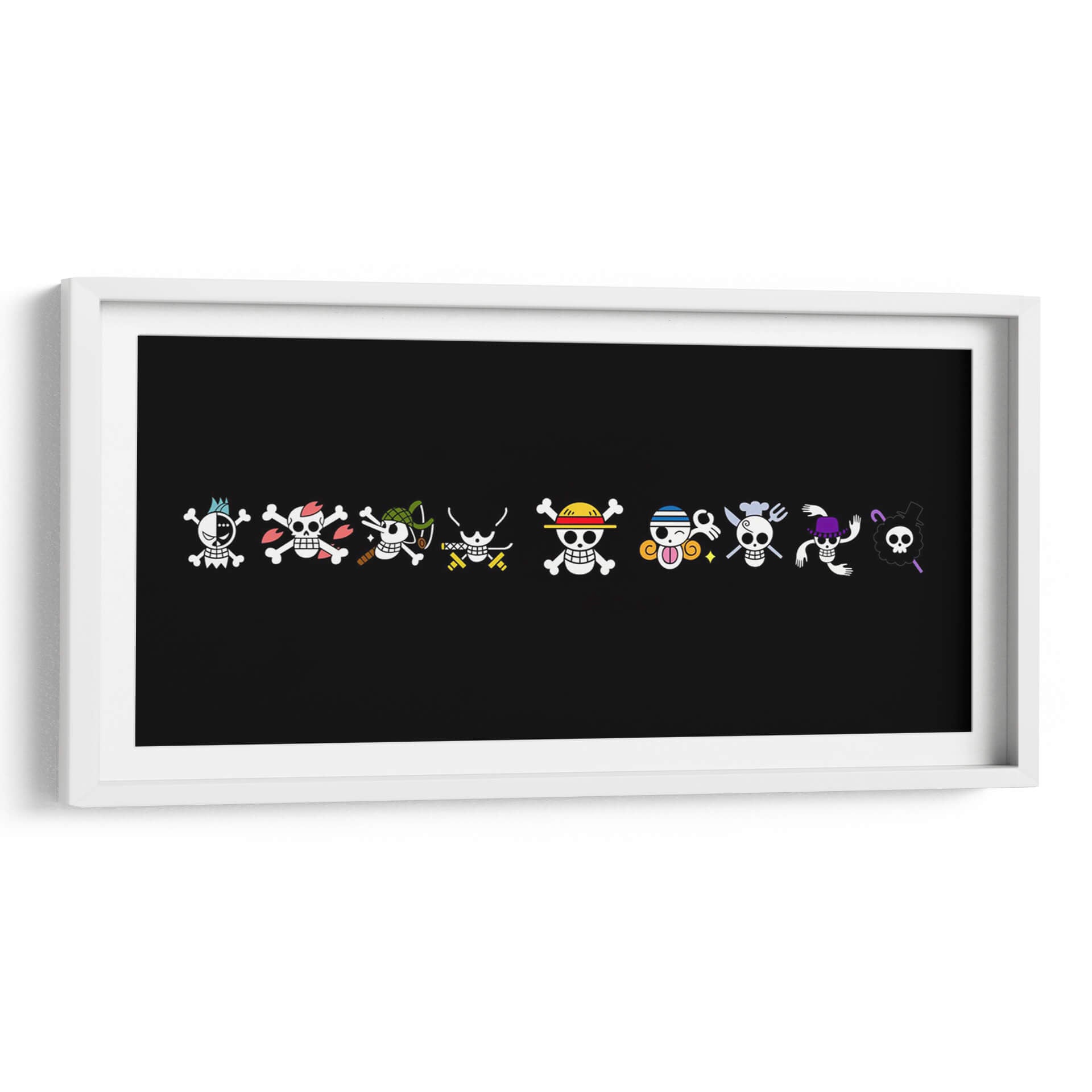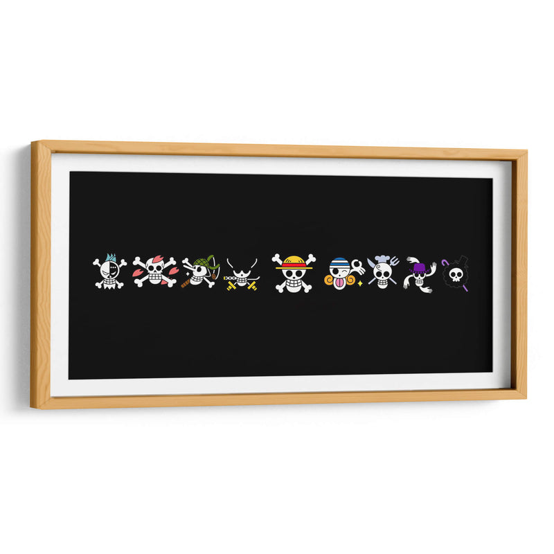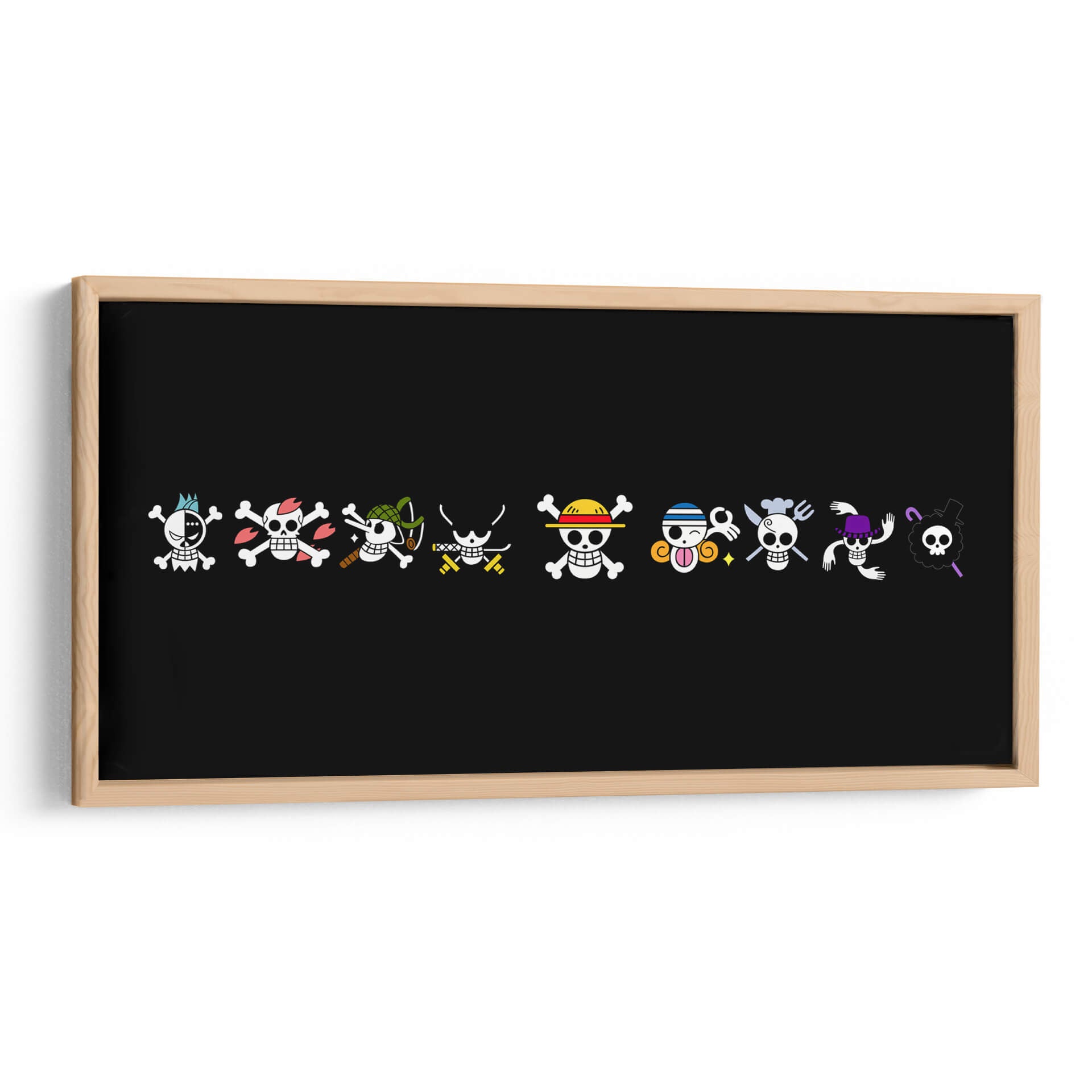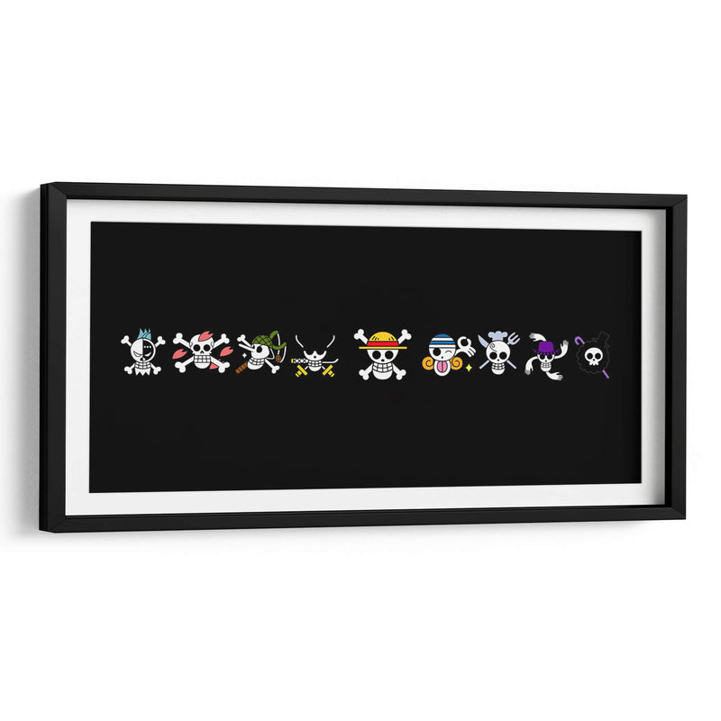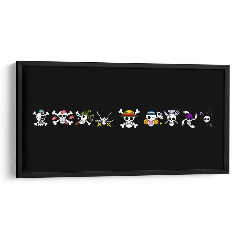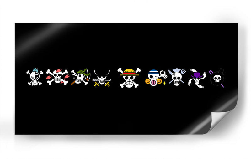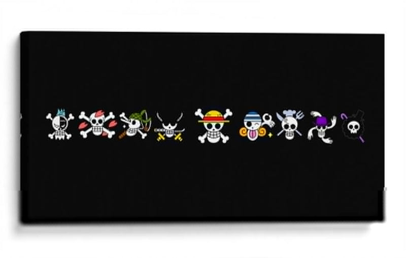 Este vibrante cuadro decorativo, titulado "One Piece skull line", trae consigo una energía inconfundible y un estilo audaz a cualquier espacio. La composición presenta una hilera de calaveras estilizadas, cada una con un diseño único y colorido que evoca un espíritu aventurero y rebelde. Predominan los fondos negros intensos que realzan la viveza de los detalles de cada símbolo, creando un contraste potente y llamativo. Los colores primarios y brillantes utilizados en los detalles de cada calavera, como rojos, azules, amarillos y verdes, añaden un toque lúdico y dinámico a la pieza. Este diseño lineal y gráfico es perfecto para aquellos que buscan una declaración visual fuerte y moderna, ideal para decorar salas de estar juveniles, estudios creativos o incluso una oficina con un toque de personalidad. Su estética audaz lo convierte en un punto focal instantáneo, transmitiendo una sensación de camaradería y aventura. Este cuadro decorativo es una excelente opción para añadir carácter y un toque de cultura pop a tu hogar, capturando la esencia de la audacia y la camaradería de forma gráfica y memorable.