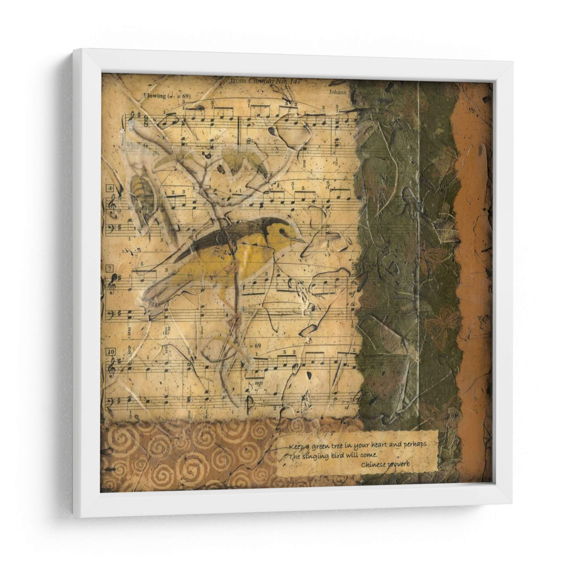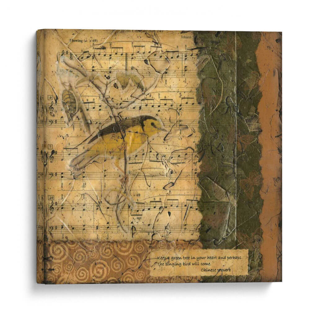 Sumérgete en la serenidad y el encanto de "Pájaro Melody II", una obra de arte contemporáneo que captura la delicadeza de la naturaleza con un toque nostálgico. Esta pieza presenta un pintoresco pájaro amarillo posado sobre partituras antiguas, creando una atmósfera de tranquilidad y musicalidad. Los tonos tierra, verdes profundos y amarillos vibrantes se entrelazan en una composición texturizada que evoca la calidez de un hogar acogedor. El estilo ecléctico, que combina elementos de collage y pintura, aporta una profundidad visual única. Ideal para quienes buscan infundir a sus espacios un aire de paz y sofisticación, este cuadro decorativo es perfecto para salones, dormitorios o estudios. Su diseño atemporal y su mensaje sutil, inspirado en un proverbio chino, invitan a la reflexión y al disfrute de la belleza en los detalles. Añade un toque de inspiración melódica a tu decoración con esta pieza que resuena con armonía y estilo.