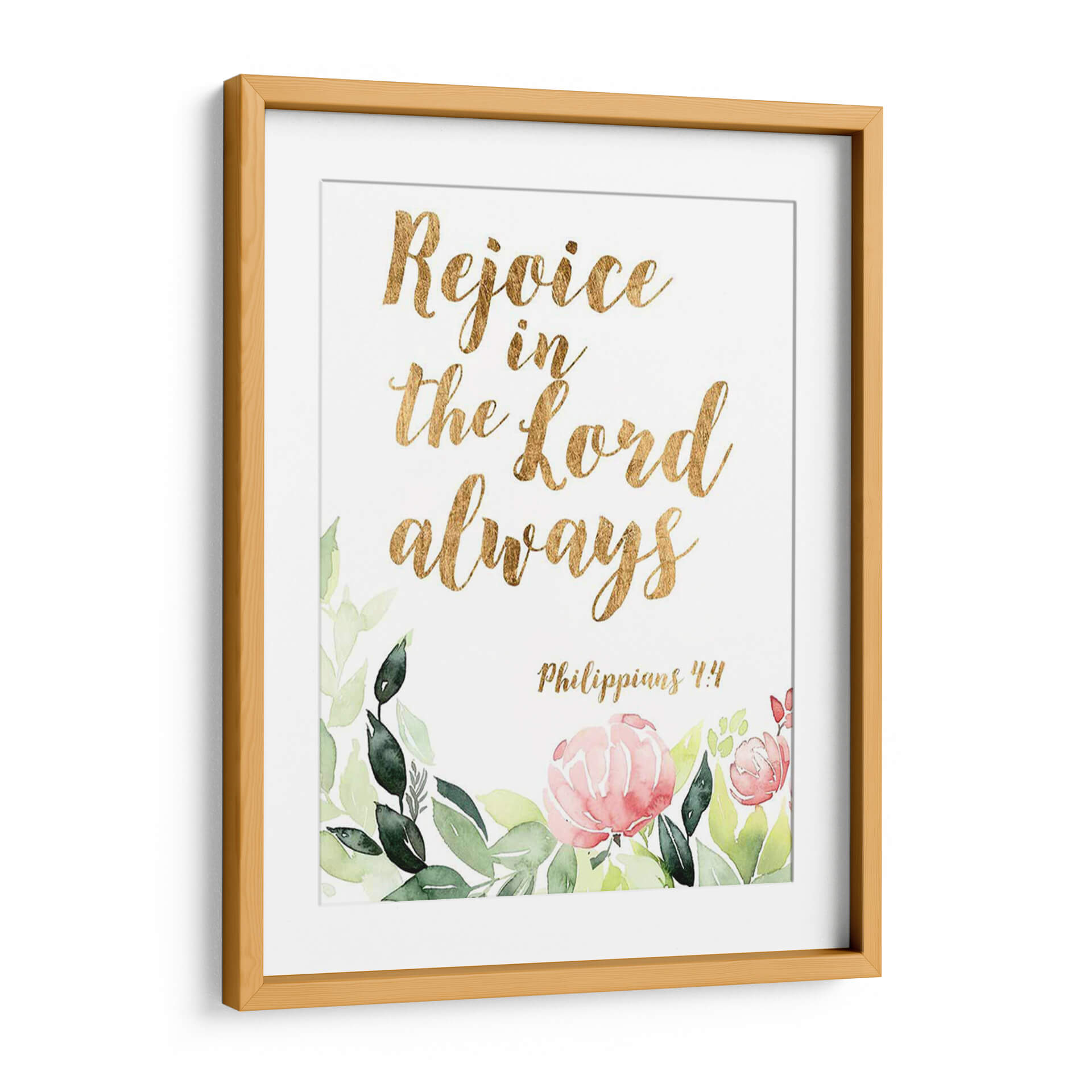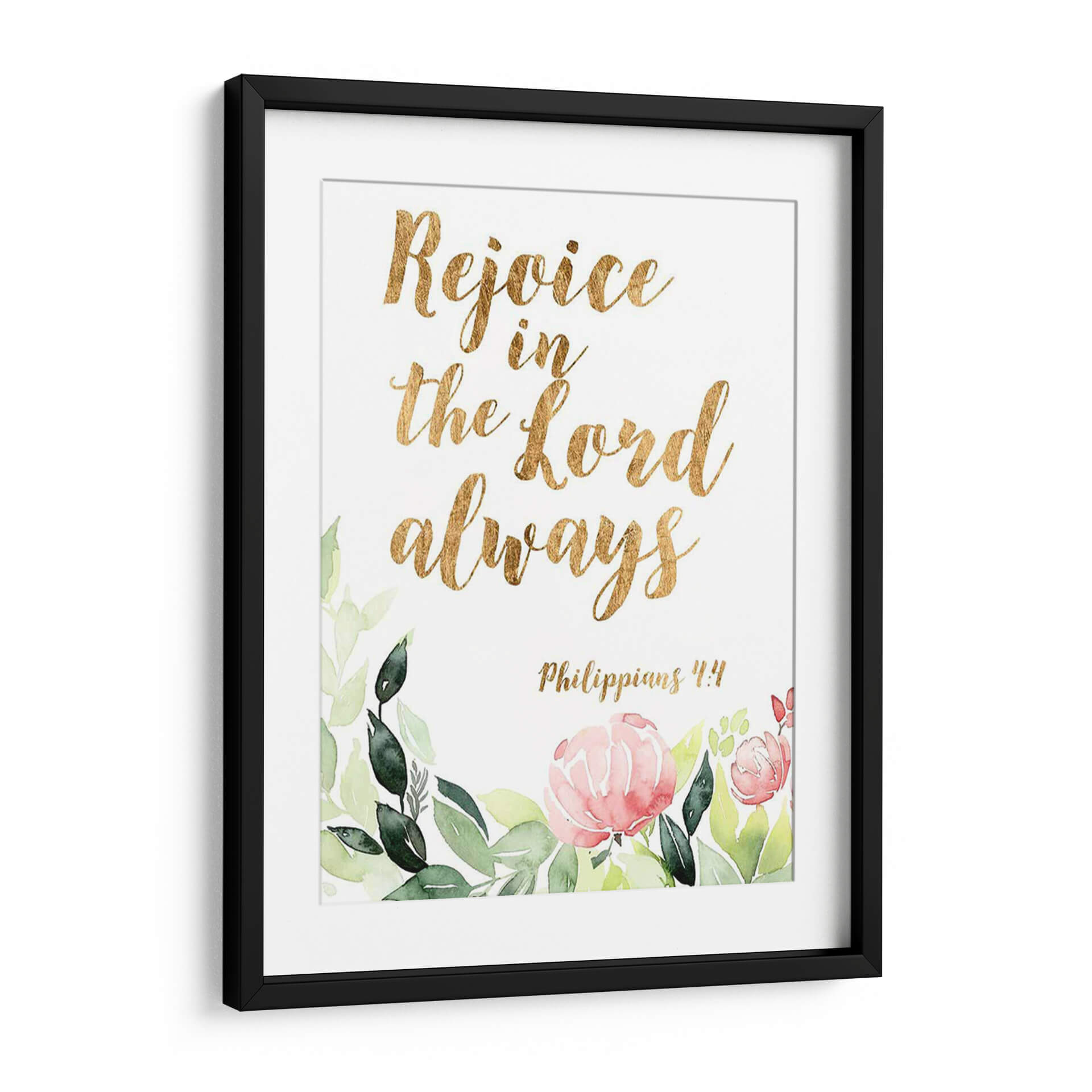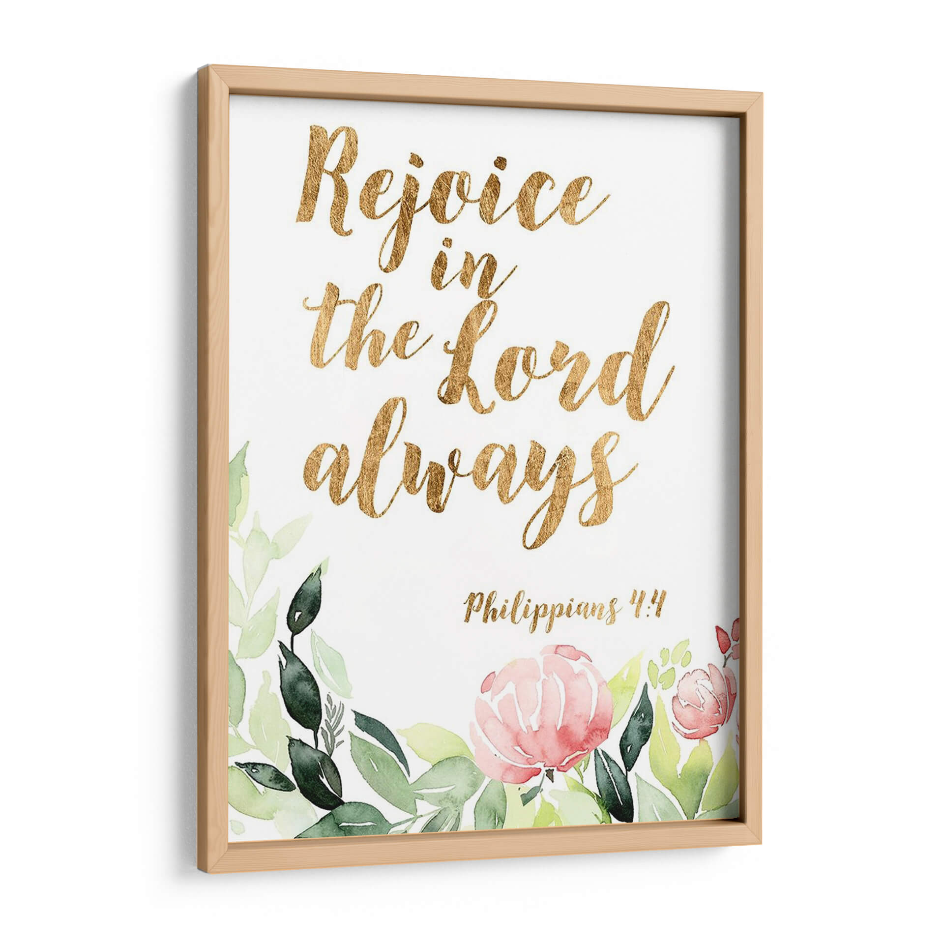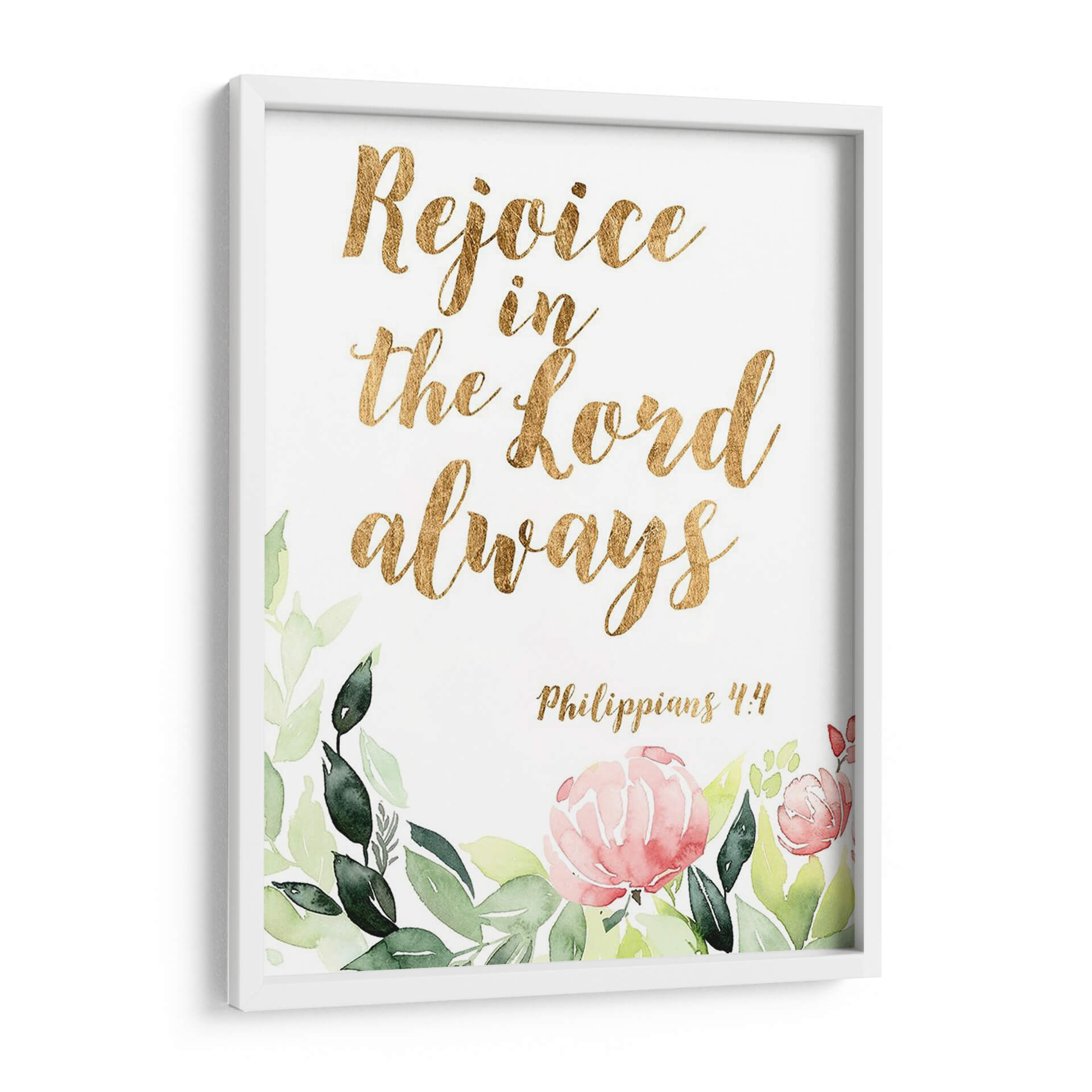 Embellece tu espacio con "Palabras De Gracia Floral II", una obra de arte inspiradora que combina la delicadeza de la acuarela floral con la fuerza de un mensaje bíblico. Este cuadro decorativo presenta la cita "Rejoice in the Lord always" ("Regocíjate en el Señor siempre") en una elegante tipografía dorada, rodeada por un suave y vibrante arreglo de flores y follaje pintados al estilo acuarela. Los tonos verdes de las hojas y los pétalos rosados y salmón de las flores crean una atmósfera de paz y optimismo, perfecta para cualquier rincón de tu hogar u oficina. La referencia bíblica, Filipenses 4:4, añade una capa de significado espiritual y consuelo a la pieza, convirtiéndola en un recordatorio constante de gratitud y fe. Ideal para quienes buscan arte con propósito, este cuadro decorativo no solo añade un toque de color y sofisticación, sino que también imparte una sensación de serenidad y esperanza. Transforma tu sala de estar, dormitorio o incluso tu espacio de trabajo con esta pieza única que inspira alegría y reflexión.