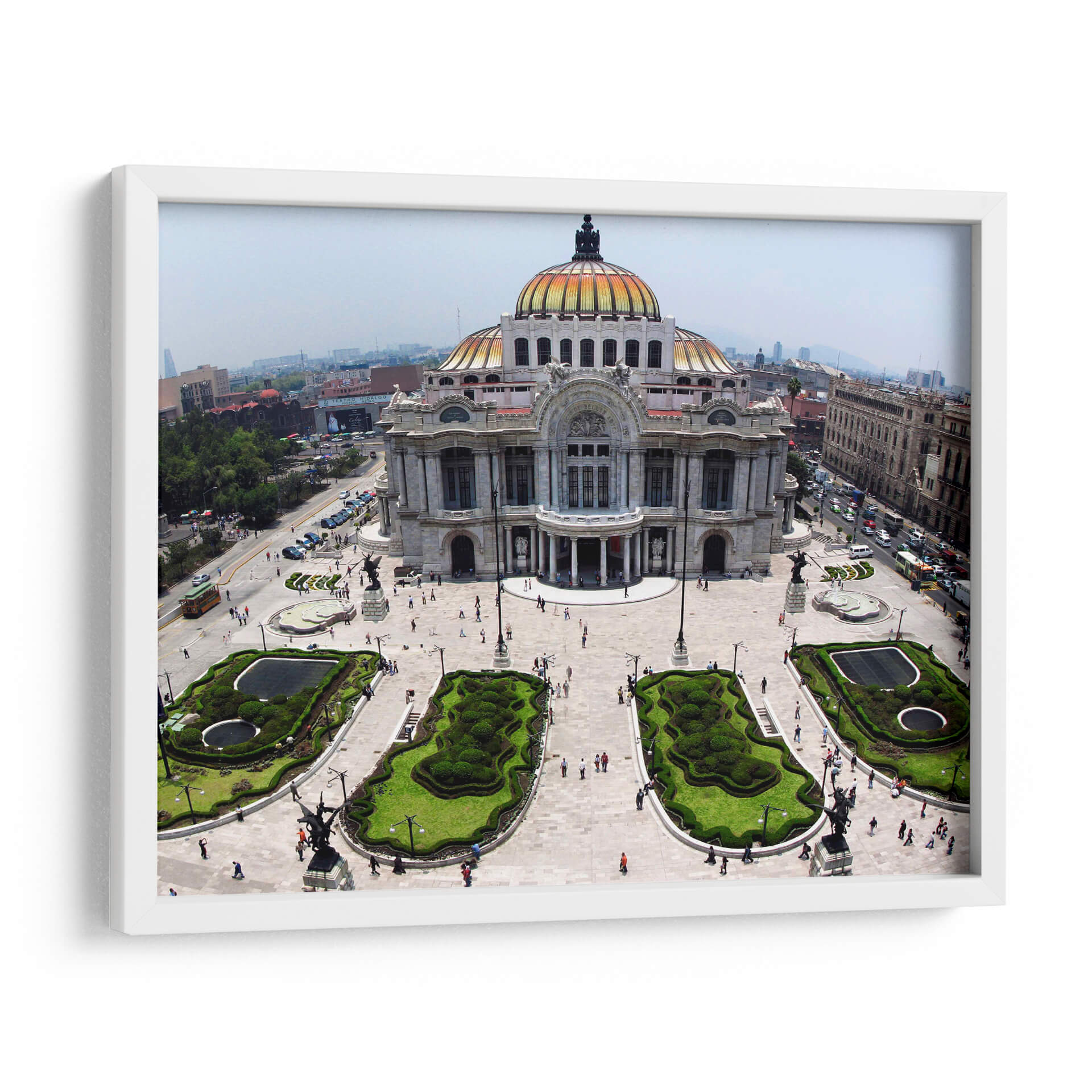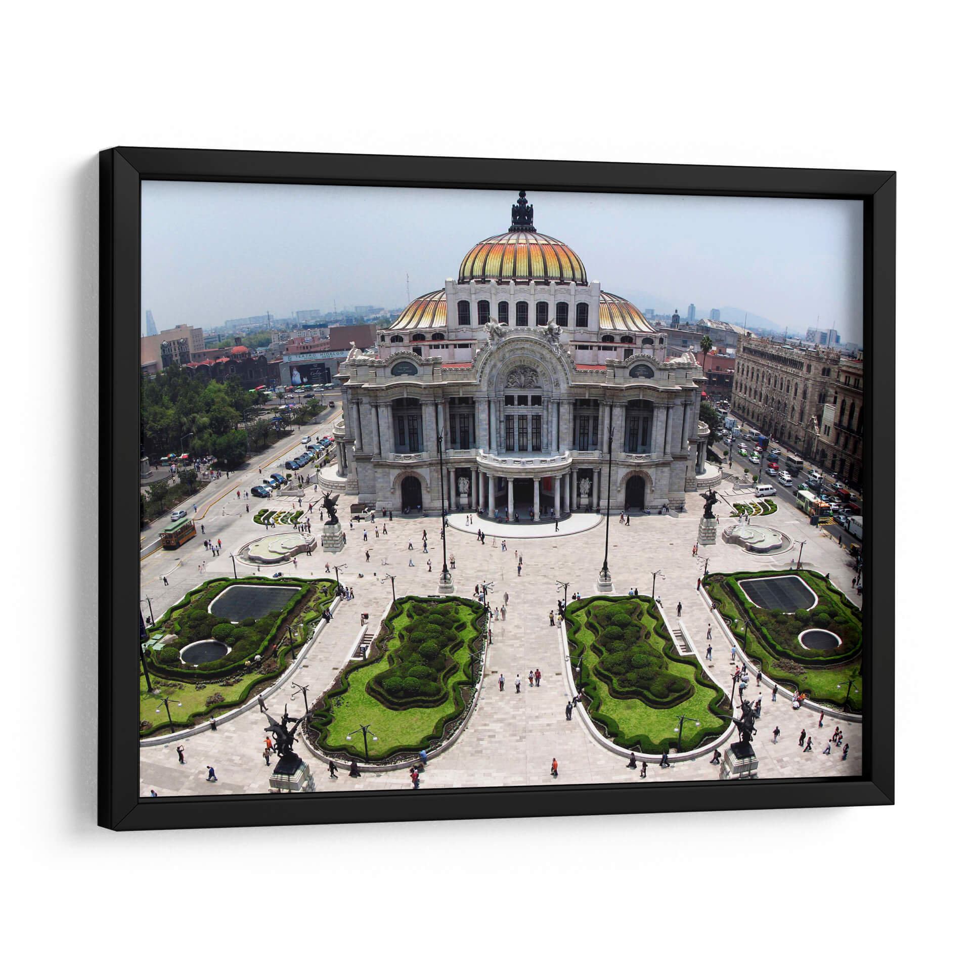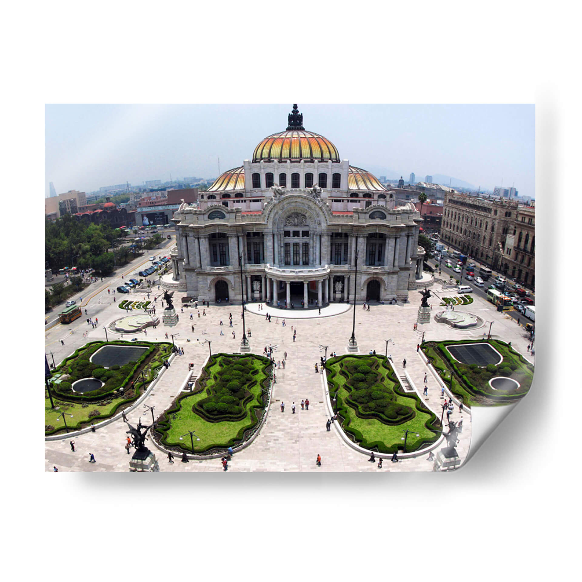 Sumérgete en la majestuosidad arquitectónica con este cautivador cuadro decorativo del Palacio de Bellas Artes. Capturada desde una perspectiva aérea, la imagen ofrece una vista panorámica que resalta la grandeza del edificio, su icónica cúpula dorada y los cuidados jardines que lo rodean. Los colores, dominados por los tonos cálidos del edificio y el verde vibrante de la vegetación, crean una atmósfera de elegancia y vitalidad. La composición, equilibrada y detallada, invita a explorar cada rincón de la escena, desde las esculturas que adornan la plaza hasta el tráfico y la vida urbana que se desarrolla a su alrededor. Este cuadro es ideal para quienes buscan añadir un toque de cultura, historia y sofisticación a su hogar u oficina. Su estilo, que combina la arquitectura clásica con el dinamismo de una ciudad moderna, lo convierte en una pieza de arte versátil, perfecta para salas de estar, estudios o espacios que requieran inspiración y un punto focal distintivo. Añade un toque de grandeza urbana a tu decoración con esta impresionante vista.