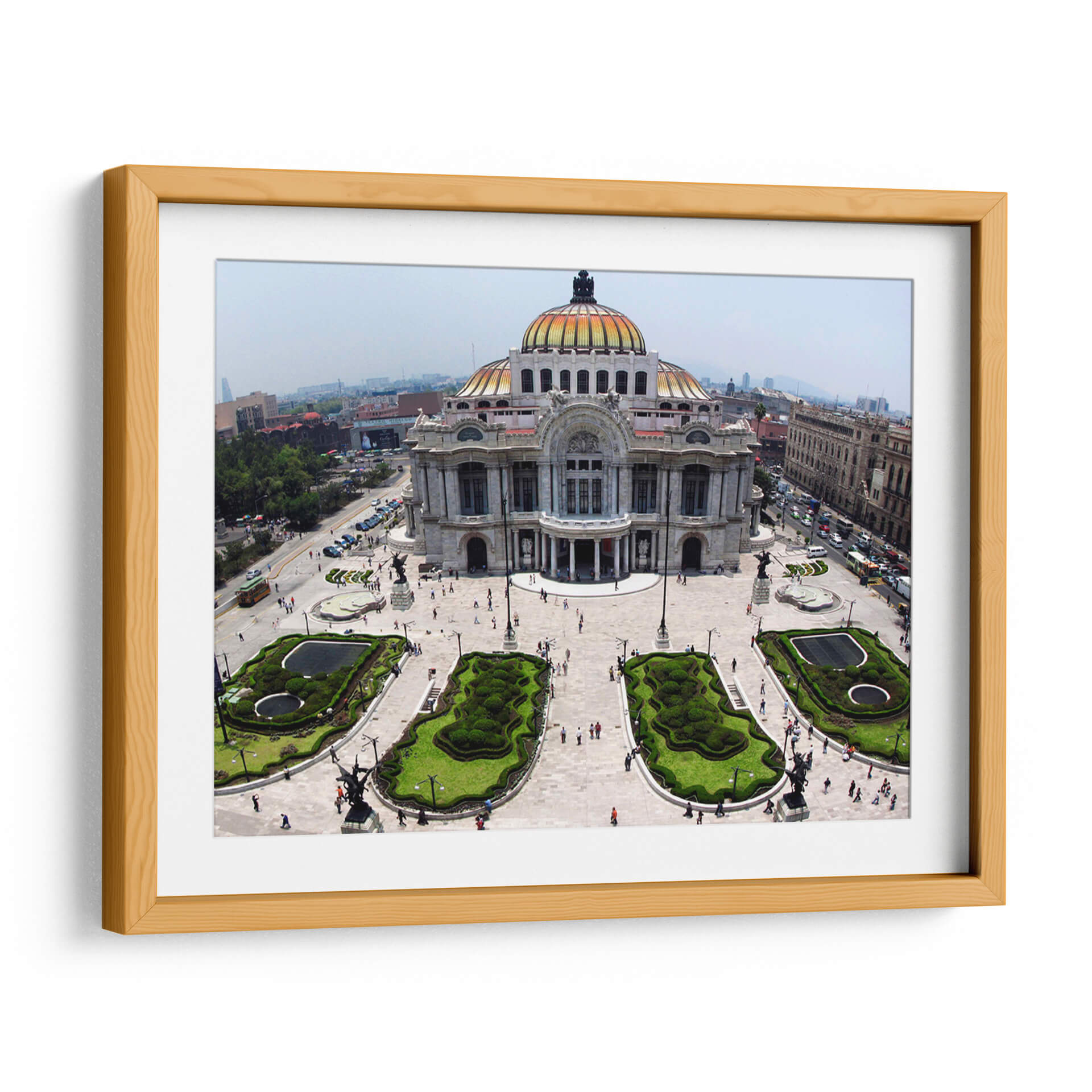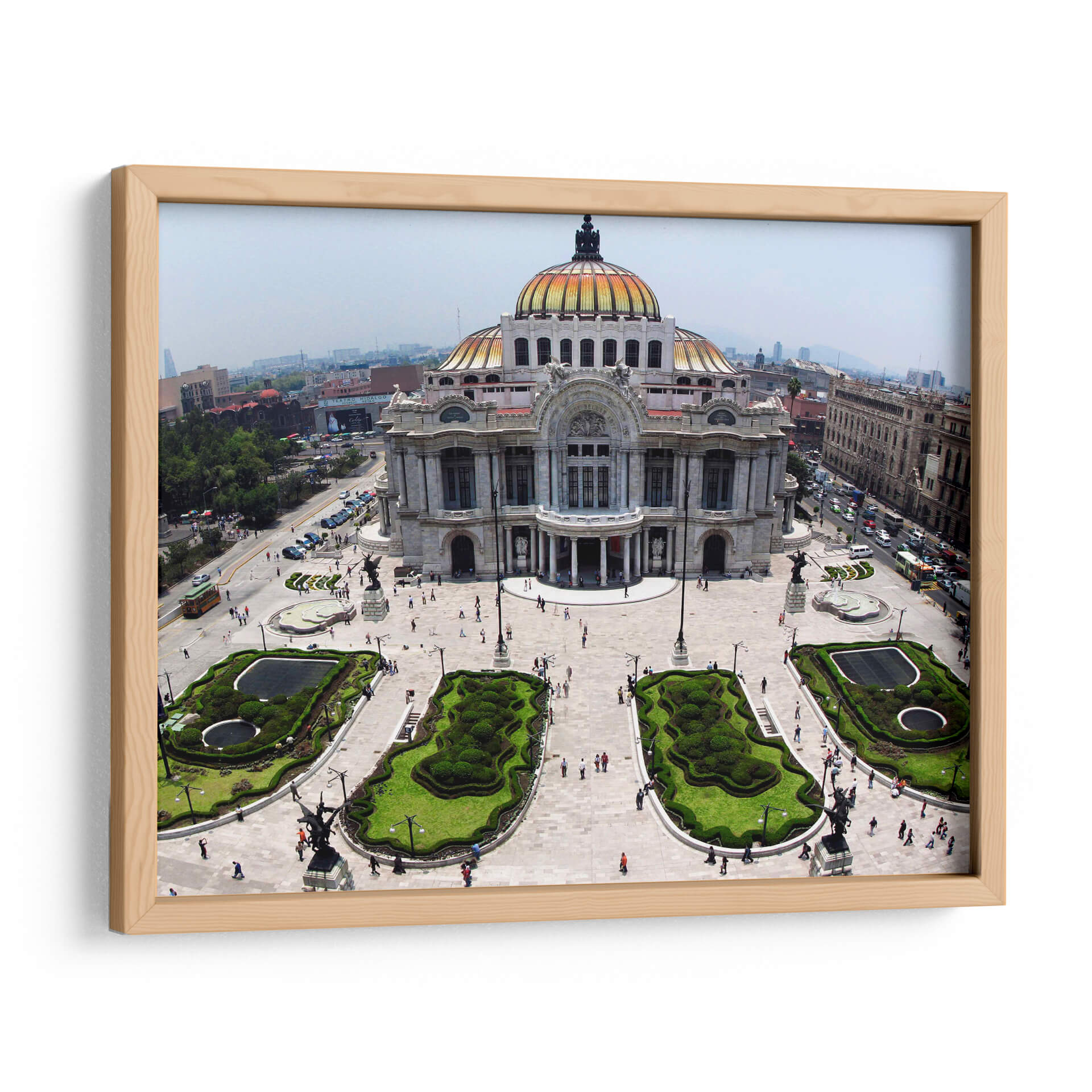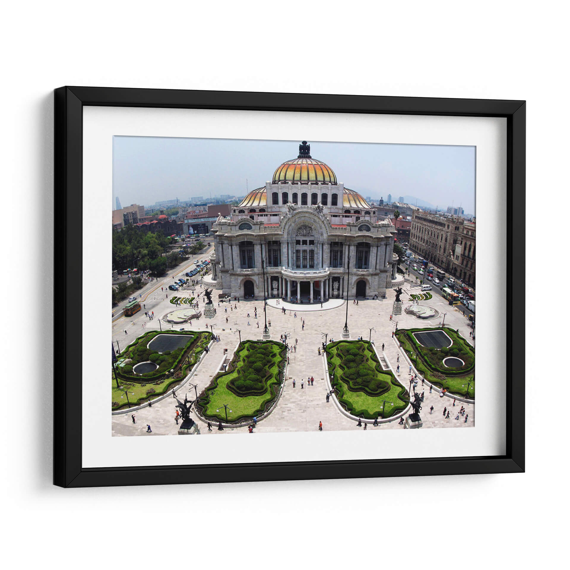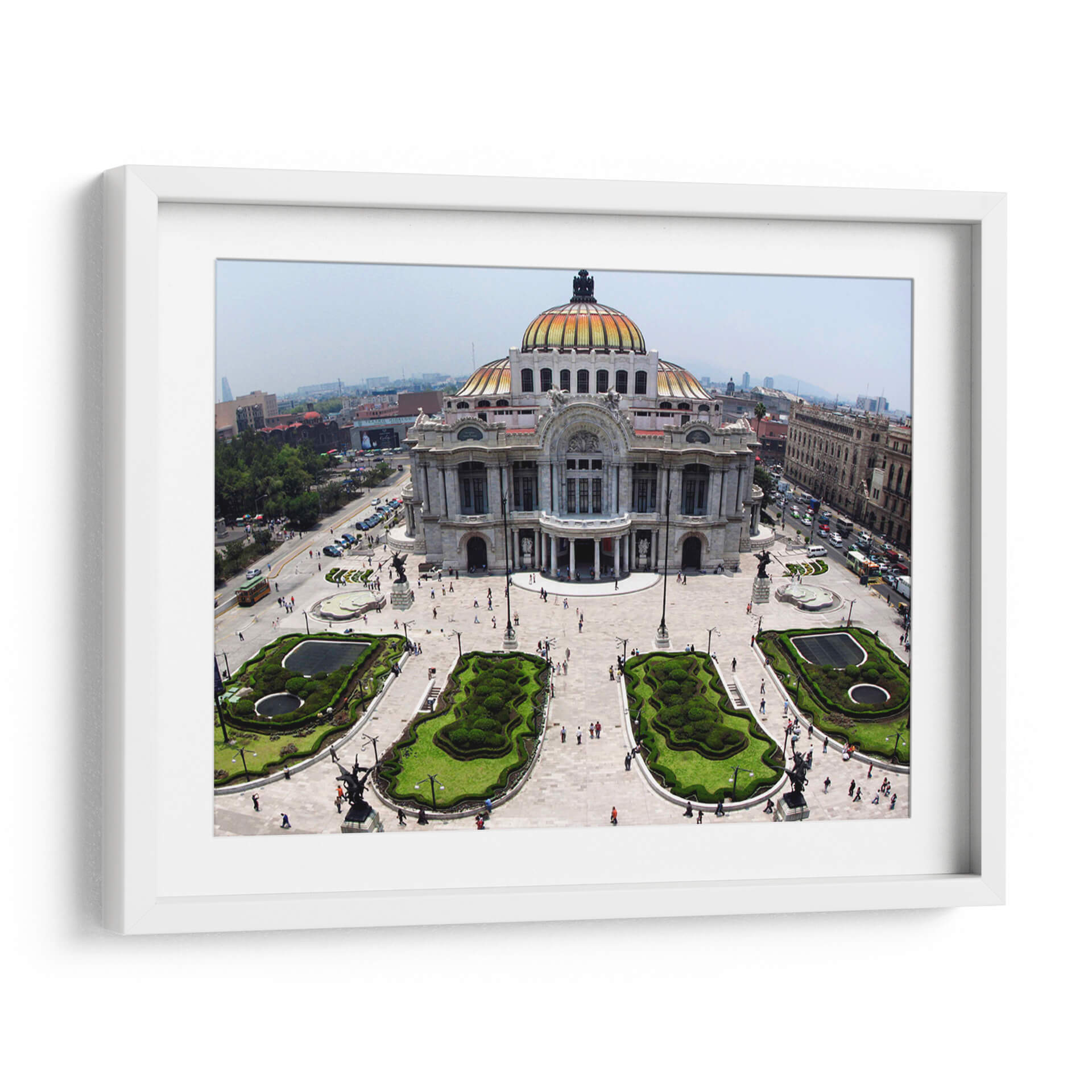 Sumérgete en la majestuosidad arquitectónica con este cautivador cuadro decorativo del Palacio de Bellas Artes. Capturada desde una perspectiva aérea, la imagen ofrece una vista panorámica que resalta la grandeza del edificio, su icónica cúpula dorada y los cuidados jardines que lo rodean. Los colores, dominados por los tonos cálidos del edificio y el verde vibrante de la vegetación, crean una atmósfera de elegancia y vitalidad. La composición, equilibrada y detallada, invita a explorar cada rincón de la escena, desde las esculturas que adornan la plaza hasta el tráfico y la vida urbana que se desarrolla a su alrededor. Este cuadro es ideal para quienes buscan añadir un toque de cultura, historia y sofisticación a su hogar u oficina. Su estilo, que combina la arquitectura clásica con el dinamismo de una ciudad moderna, lo convierte en una pieza de arte versátil, perfecta para salas de estar, estudios o espacios que requieran inspiración y un punto focal distintivo. Añade un toque de grandeza urbana a tu decoración con esta impresionante vista.