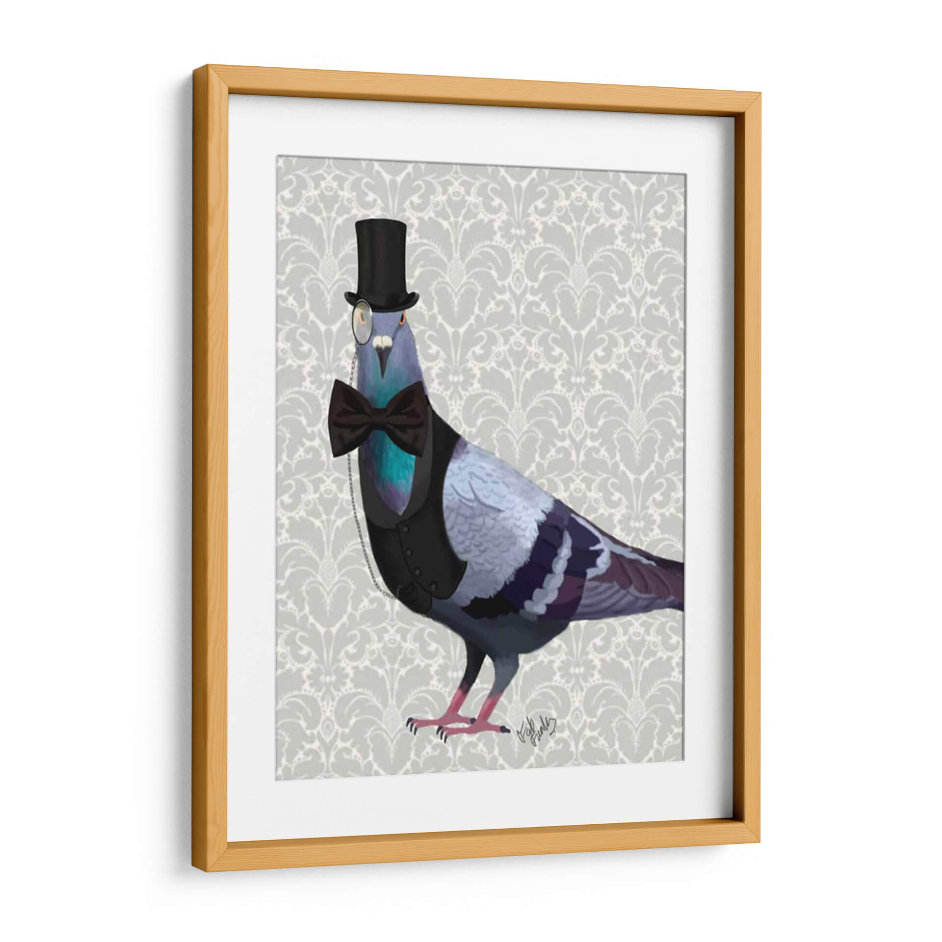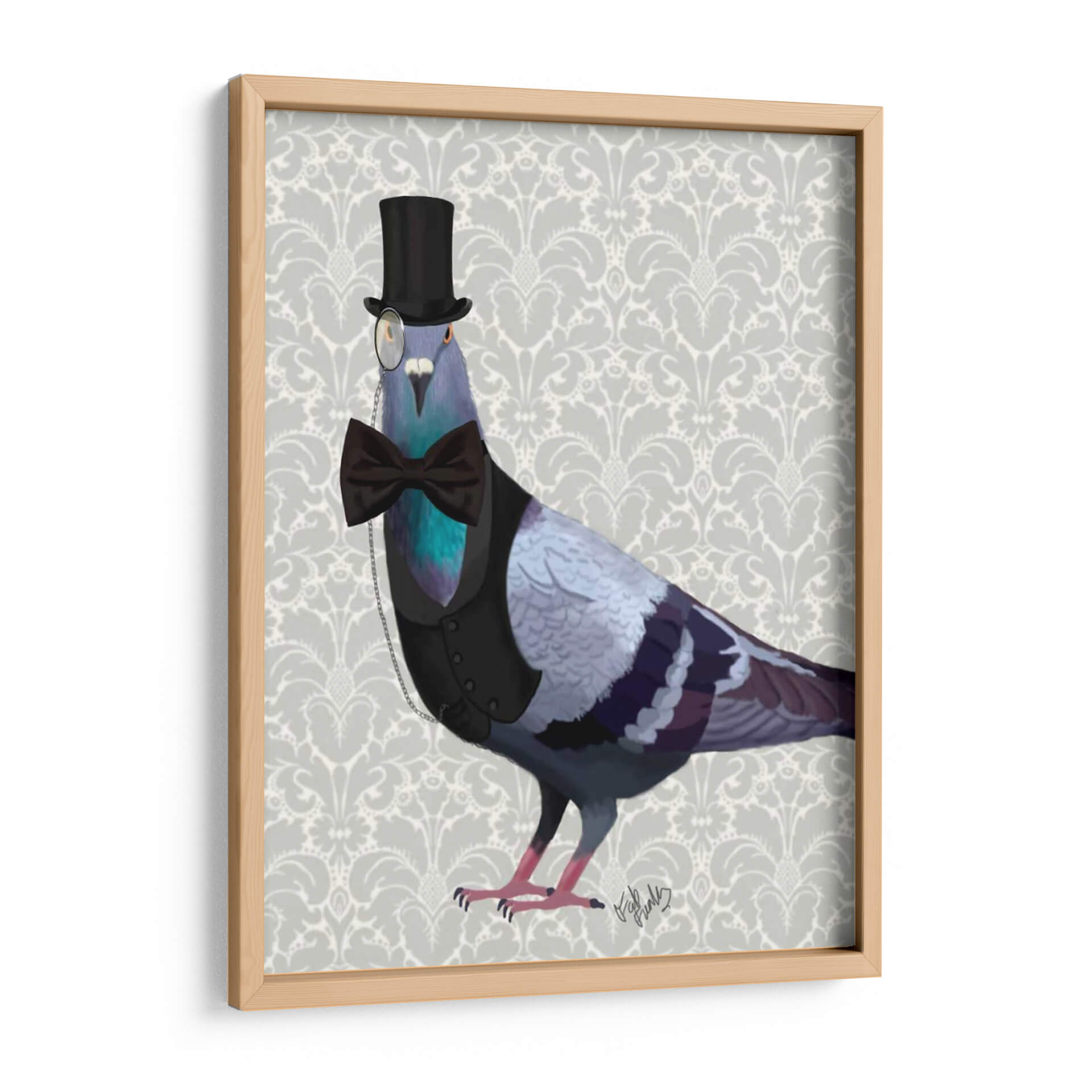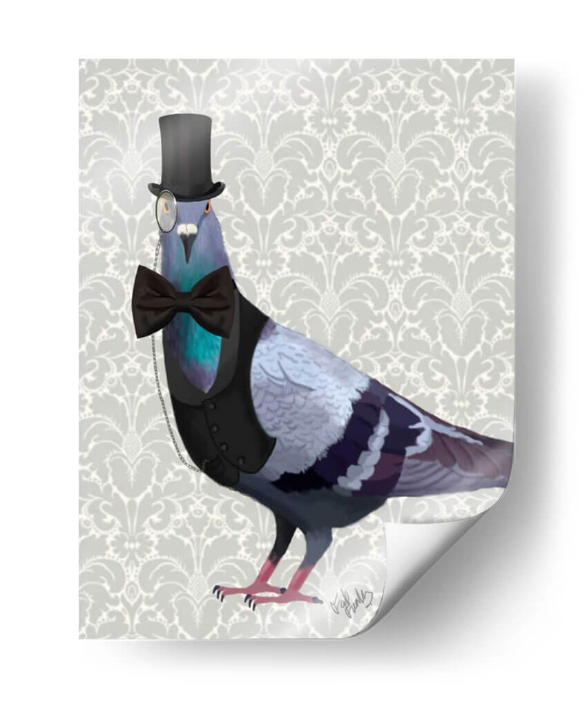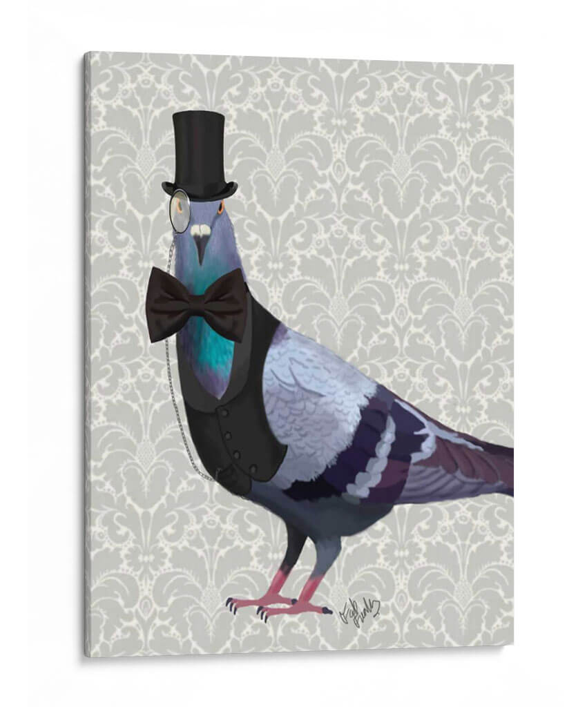 Este cautivador cuadro decorativo de "Paloma En Chaleco Y Sombrero De Copa" de Fab Funky es una obra de arte única que aporta un toque de elegancia y humor a cualquier espacio. La pieza presenta una paloma vestida con un impecable chaleco, sombrero de copa y monóculo, posando sobre un fondo gris con un sutil patrón damasco. La paleta de colores se centra en tonos grises, morados, azules verdosos y toques de rosa en las patas del ave, creando una atmósfera sofisticada pero juguetona. El estilo combina elementos realistas en la representación de la paloma con un toque surrealista y caricaturesco en su atuendo, lo que lo convierte en un punto focal intrigante. Ideal para salones modernos, estudios u oficinas que buscan una pieza de conversación distintiva y con personalidad. Este cuadro decorativo es perfecto para quienes aprecian el arte contemporáneo con un giro ingenioso, añadiendo carácter y estilo a su decoración.
