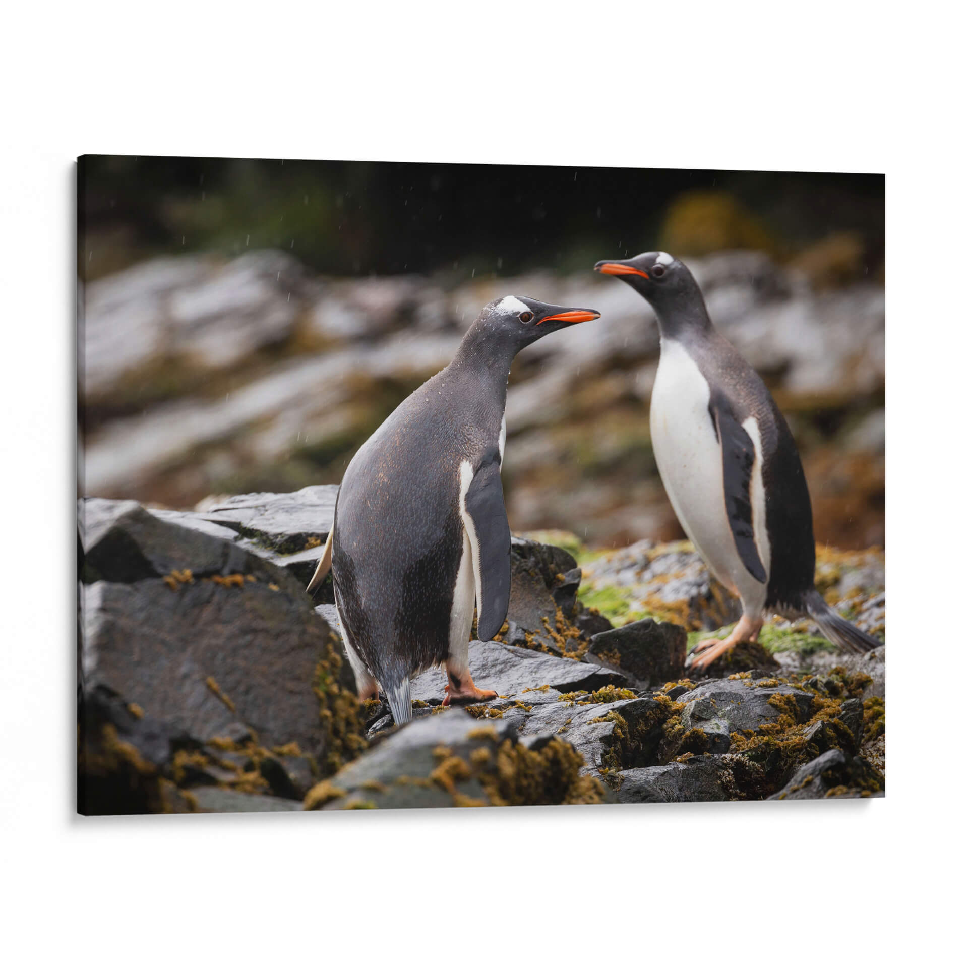 Captura la esencia de la naturaleza salvaje con este evocador cuadro decorativo de 'Pareja de pingüinos Gentoo' de Carlos Montaño. La obra presenta dos pingüinos Gentoo posados sobre un terreno rocoso y húmedo, con una atmósfera sutilmente lluviosa que añade un toque de realismo y cruda belleza. Los detalles en sus plumajes, el contraste entre el blanco brillante y el negro profundo, y los vivos toques anaranjados de sus picos crean un punto focal cautivador. El fondo, con sus tonos terrosos y verdes musgosos sobre las rocas oscuras, proporciona una textura rica y complementa la paleta de colores de los protagonistas. Esta pieza de arte fotográfico es ideal para quienes buscan infundir a sus espacios un sentido de la vida silvestre, la resiliencia y la singularidad de las criaturas antárticas. Perfecta para una sala de estar moderna, un estudio o incluso una habitación temática, este cuadro decorativo de pingüinos Gentoo aportará una conexión con la naturaleza y un toque de carácter distintivo a tu decoración, convirtiéndose en un tema de conversación y admiración.