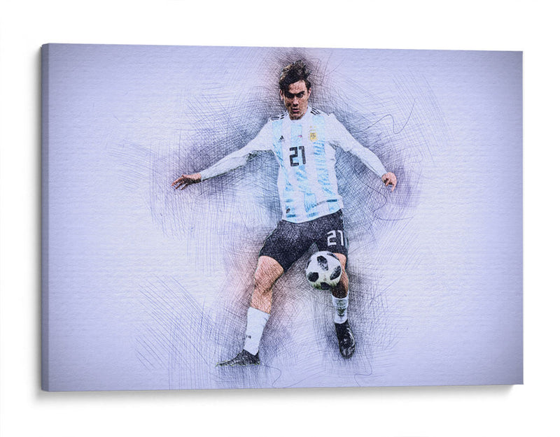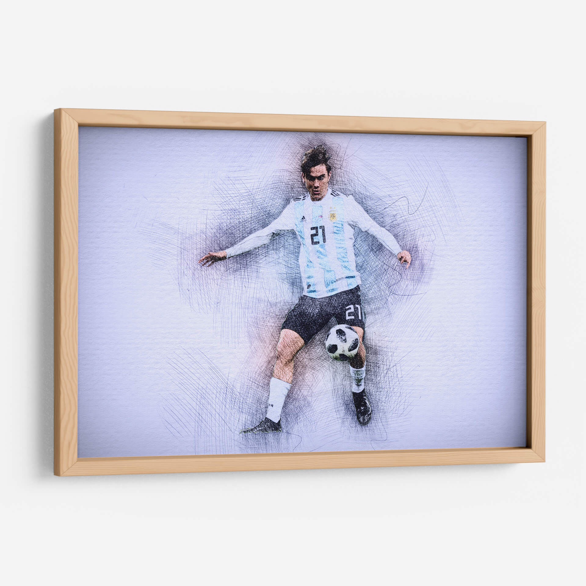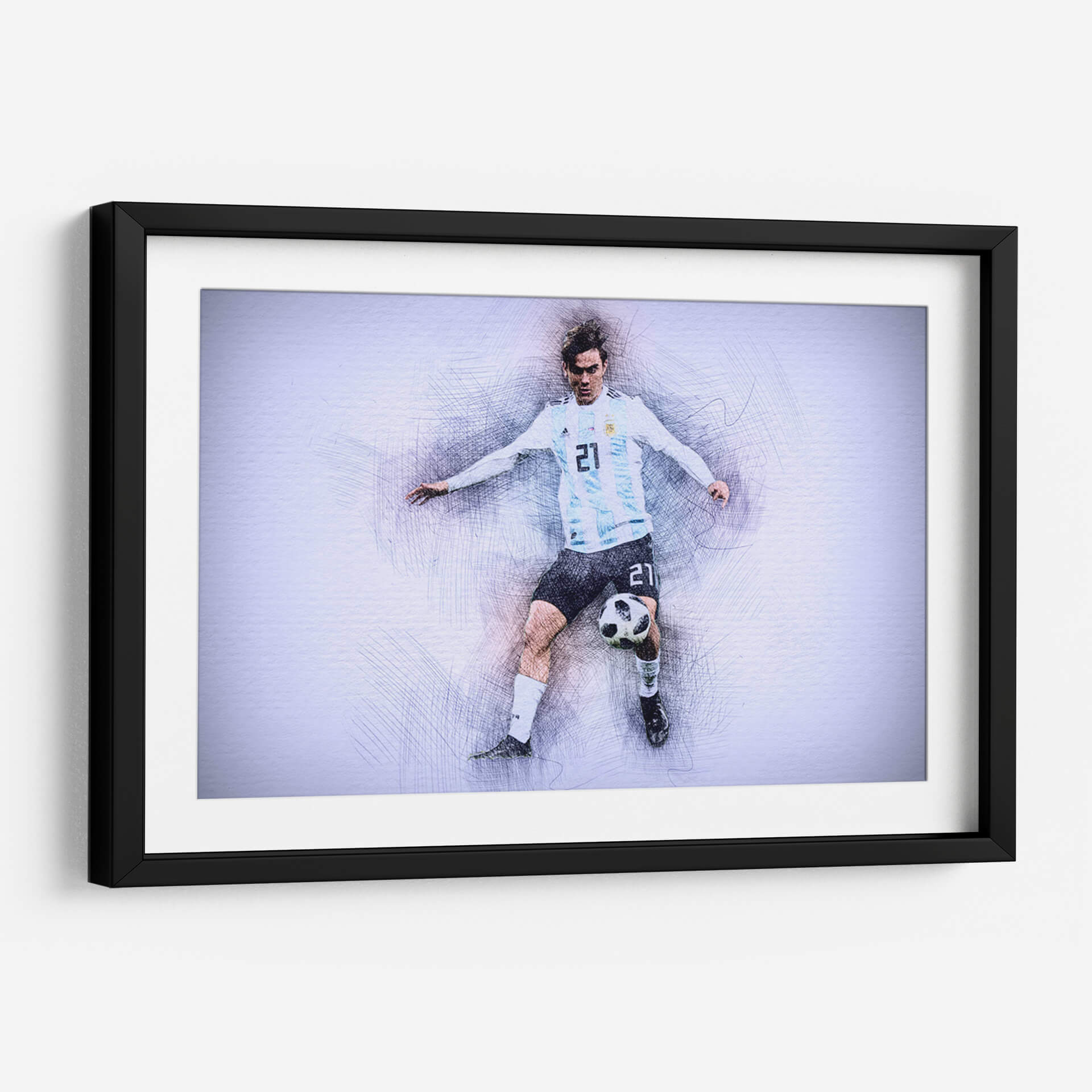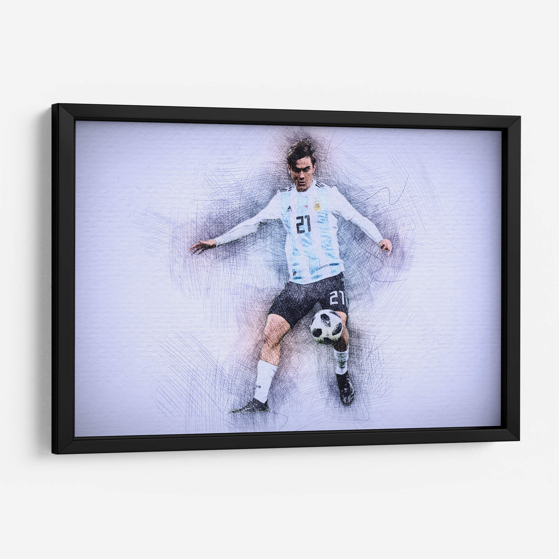 Captura la esencia del deporte y la pasión con este cuadro decorativo de Paulo Dybala en plena acción. La obra presenta al célebre futbolista argentino en un momento dinámico, controlando el balón con una técnica depurada. El estilo artístico combina trazos de boceto con un realismo sutil, creando una atmósfera vibrante y enérgica. Predominan los tonos fríos, con el celeste y blanco característico de la selección argentina que contrastan con los tonos más oscuros de la piel y el césped, aportando profundidad y un toque moderno. La composición centra la figura del deportista, invitando al espectador a admirar su destreza y concentración. Este cuadro es ideal para los amantes del fútbol, deportistas y aquellos que buscan inyectar vitalidad y un espíritu competitivo a sus espacios. Perfecto para decorar salas de estar, estudios, oficinas o cualquier lugar donde se desee un recordatorio inspirador de la dedicación y el talento. Añade un toque de genialidad deportiva a tu decoración con esta pieza única que celebra a uno de los íconos del fútbol contemporáneo. Su diseño versátil se adapta a interiores modernos y clásicos, convirtiéndose en un punto focal que atrae miradas y conversaciones.